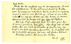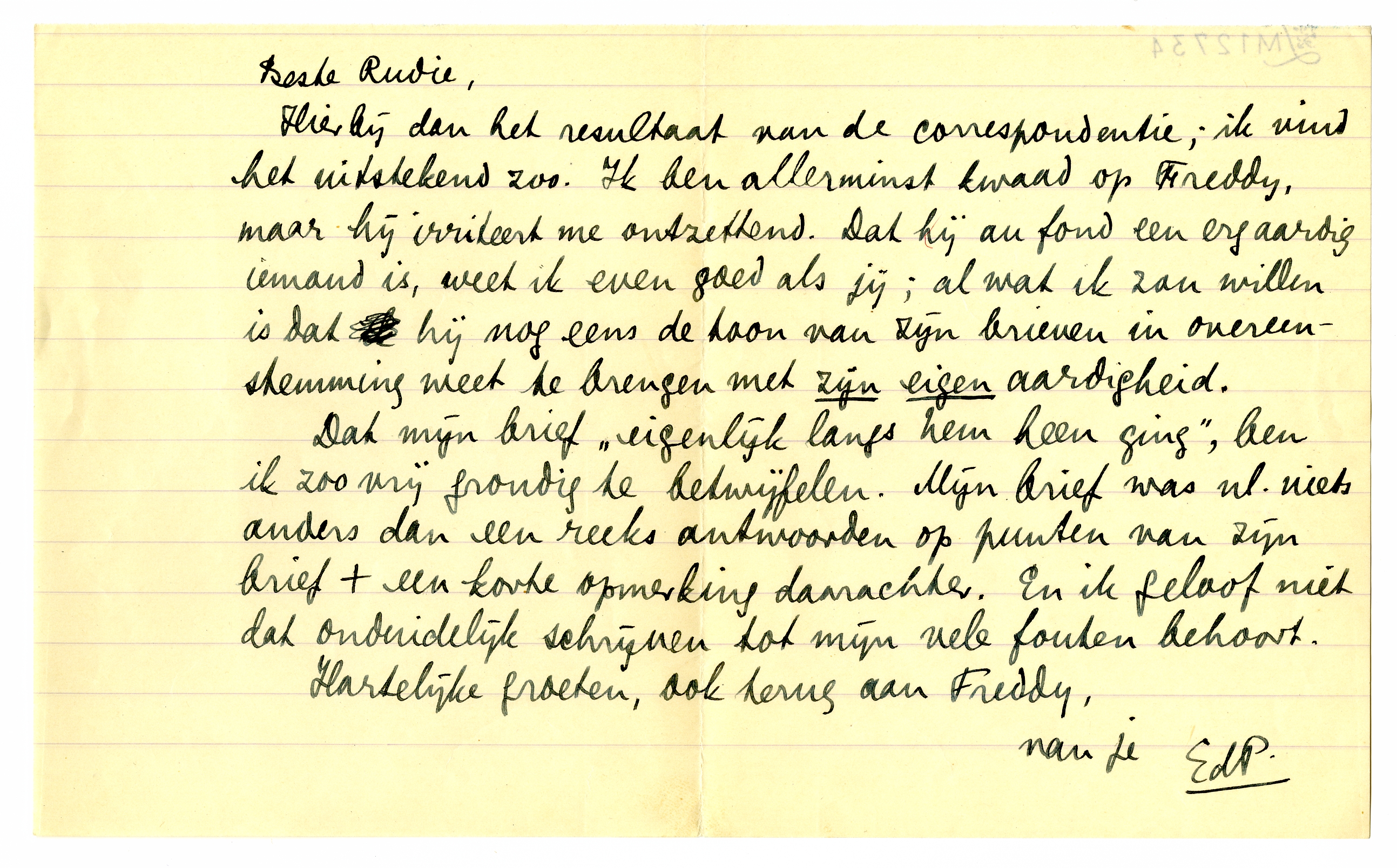 Hierbij dan het resultaat van de correspondentie; ik vind het uitstekend zoo. Ik ben allerminst kwaad op Freddy, maar hij irriteert me ontzettend. Dat hij au fond een erg aardig iemand is, weet ik even goed als jij; al wat ik zou willen is dat hij nog eens de toon van zijn brieven in overeenstemming weet te brengen met zijn eigen aardigheid.