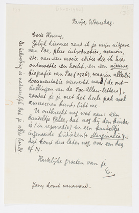 Gelijk hiermee zend ik je mijn uitgave van Poe, plus introducties, memoir, etc. van een mooie editie die ik hier ontmoette en kocht, en een nieuwe biografie van Poe (1926),4189 waarin allerlei documentatie verwerkt werd (de onthullingen van de Poe-Allan-letters), zoodat je je met het heele pak wel amuseeren kunt, lijkt me.