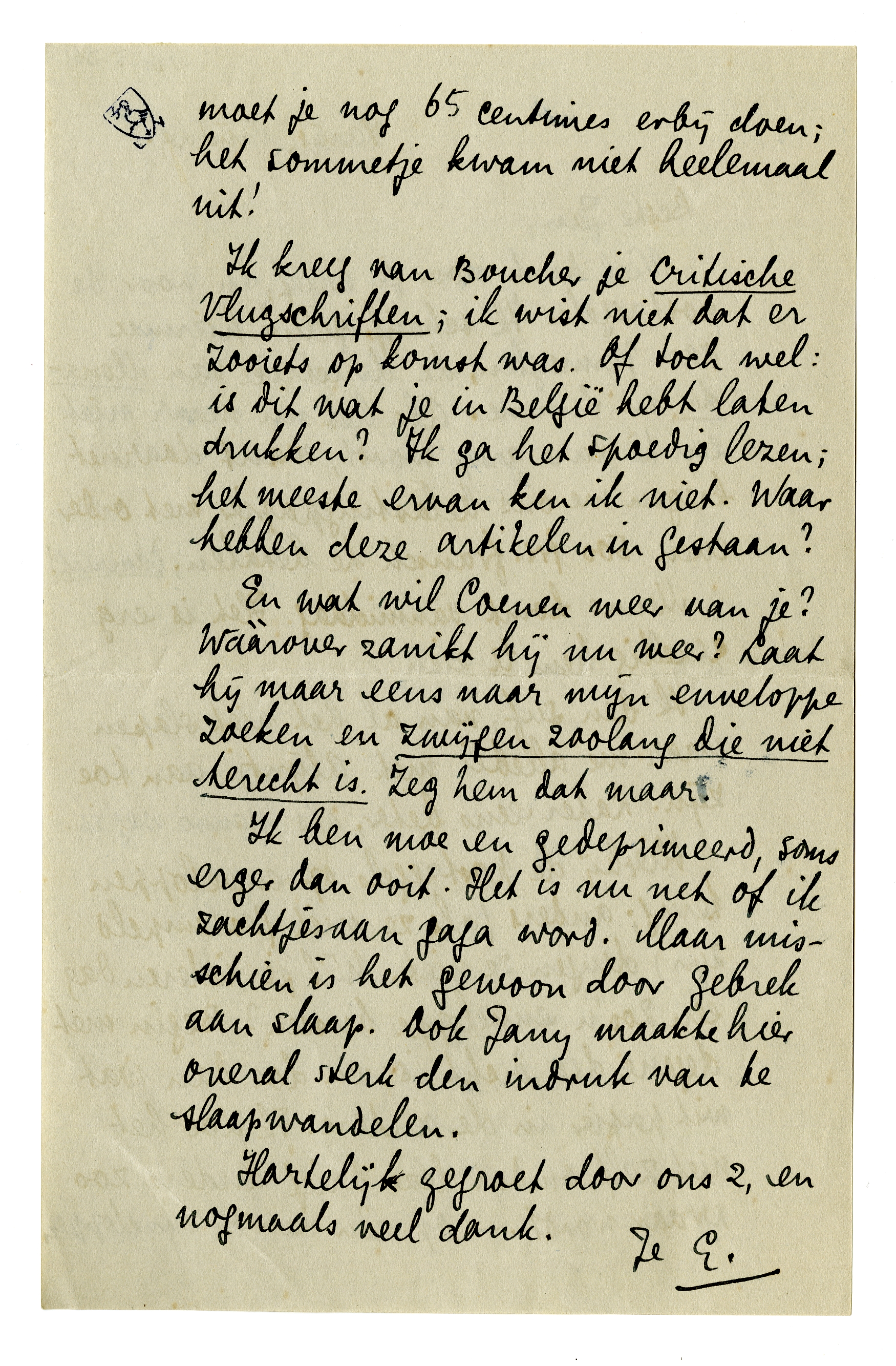 Veel dank voor je brief, en voor de postzegels. Ik schrijf gelijk hiermee aan Vermeylen, de directrice van Monada4195 en Simone.4196 Als het nu maar niet een tè dure grap wordt, want daarnet kregen we ons belastingpapier met order even 500 frs. fransch te betalen, dammit!