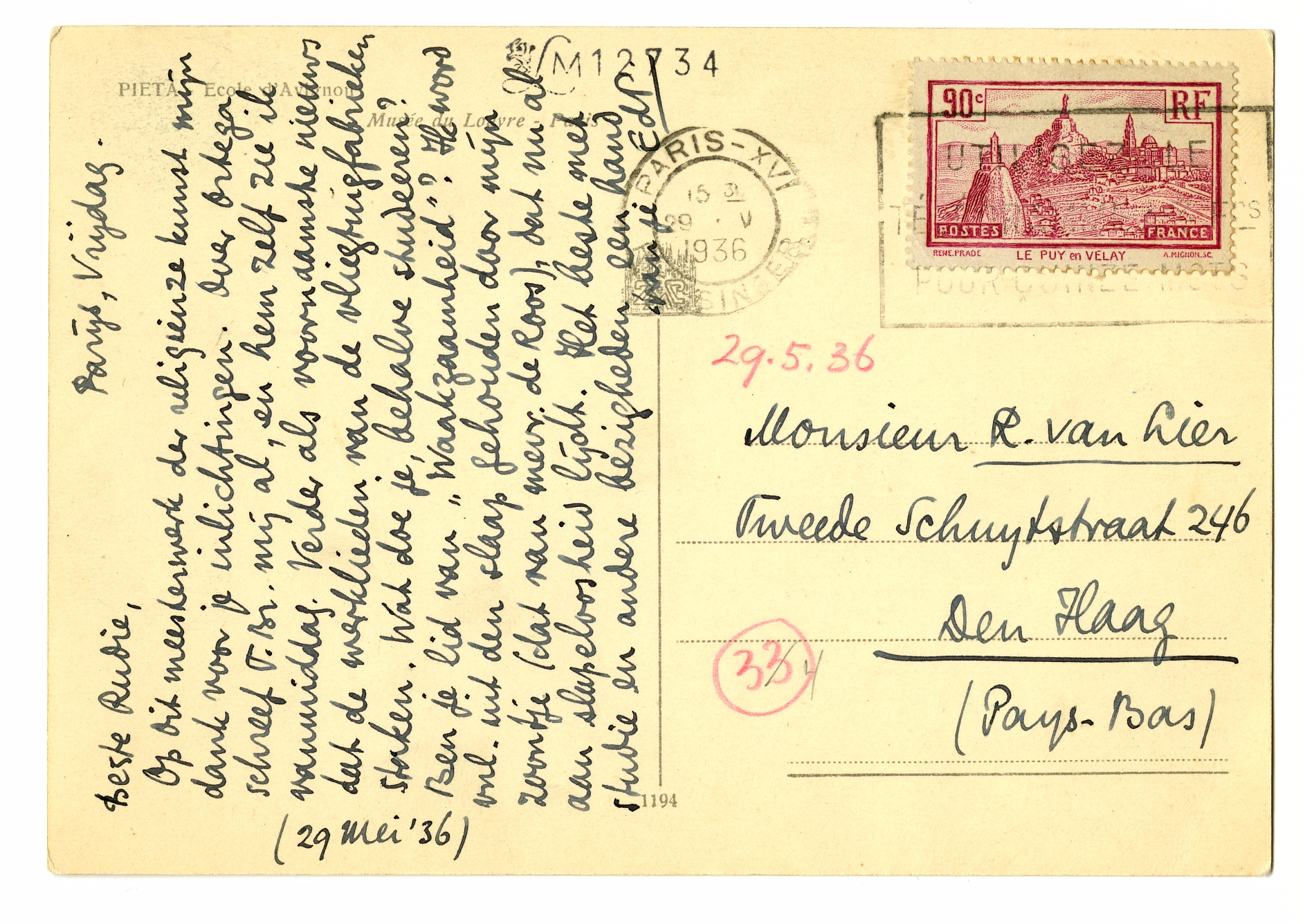 Op dit meesterwerk der religieuze kunst mijn dank voor je inlichtingen. Over Ortega schreef T. Br. mij al,4198 en hem zelf zie ik vanmiddag.4199 Verder als voornaamste nieuws dat de werklieden van de vliegtuigfabrieken staken.4200 Wat doe je, behalve studeeren? Ben je lid van ‘Waakzaamheid’? Ik word vnl. uit den slaap gehouden door mijn zoontje (dat van mevr. de Roos), dat nu al aan slapeloosheid lijdt. Het beste met studie en andere bezigheden. een hand van