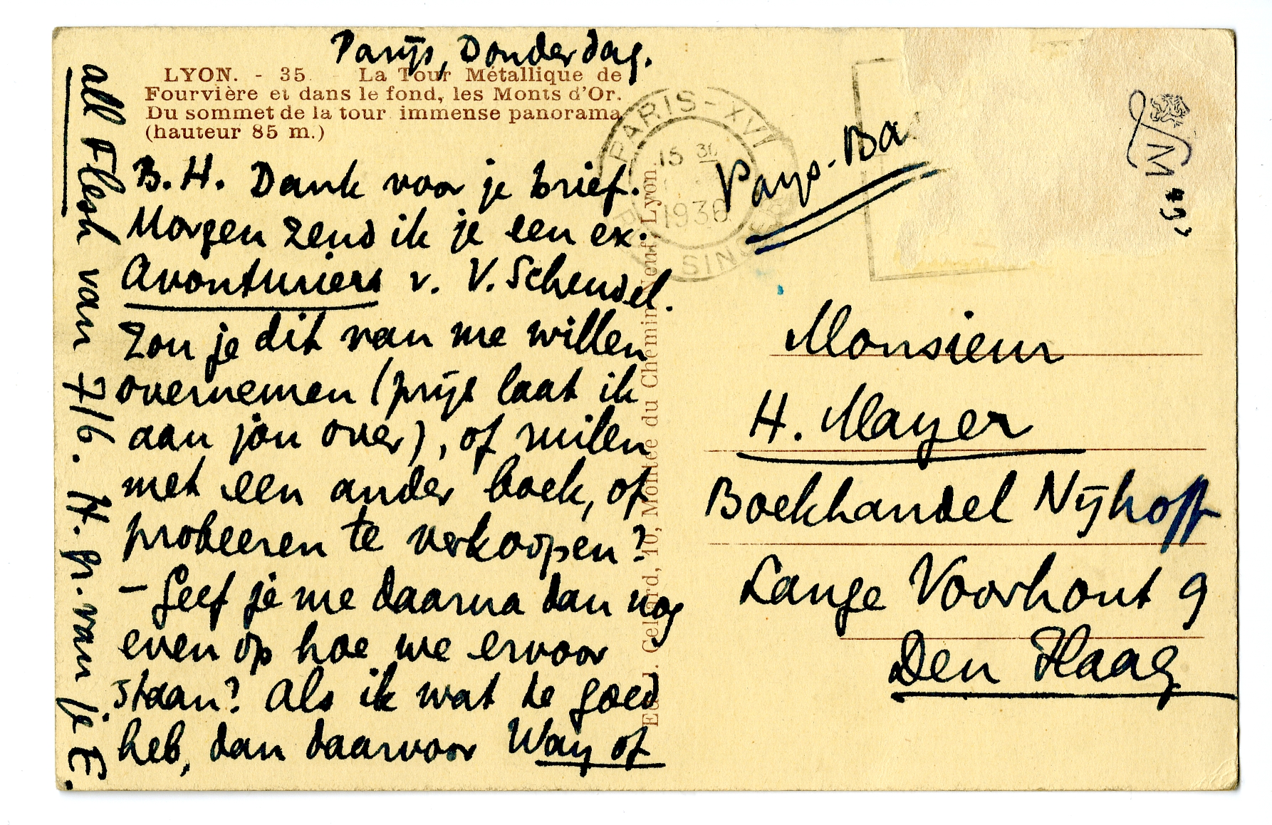 B.H. Dank voor je brief. Morgen zend ik je een ex. Avonturiers v.V. Schendel. Zou je dit van me willen overnemen (prijs laat ik aan jou over), of ruilen met een ander boek, of probeeren te verkoopen? - Geef je me daarna dan nog even op hoe we ervoor staan? Als ik wat te goed heb, dan daarvoor Way of all Flesh van 7/6.