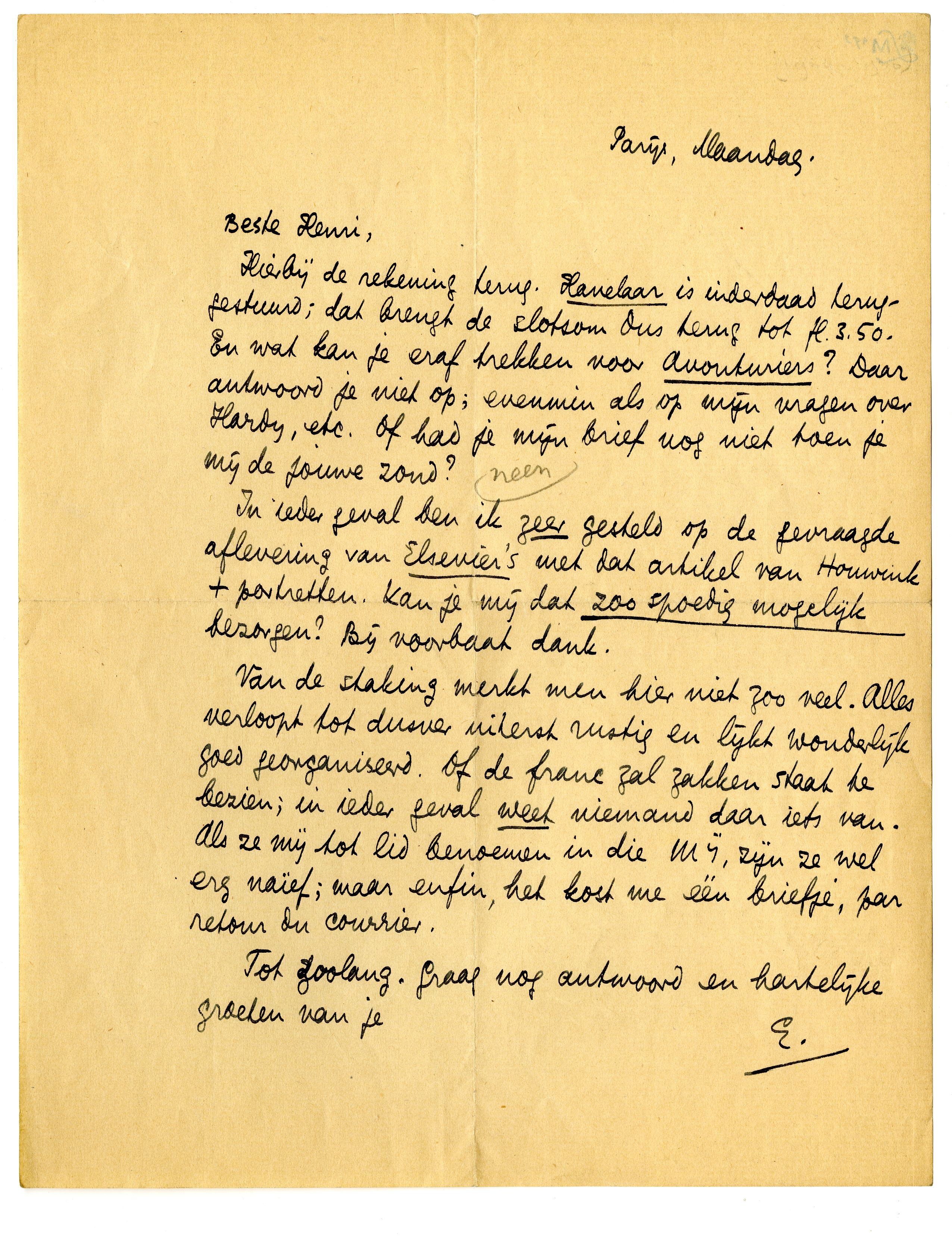 Van de staking merkt men hier niet zoo veel. Alles verloopt tot dusver uiterst rustig en lijkt wonderlijk goed georganiseerd. Of de franc zal zakken staat te bezien; in ieder geval weet niemand daar iets van. Als ze mij tot lid benoemen in die Mij, zijn ze wel erg naïef; maar enfin, het kost me één briefje, par retour du courrier.
