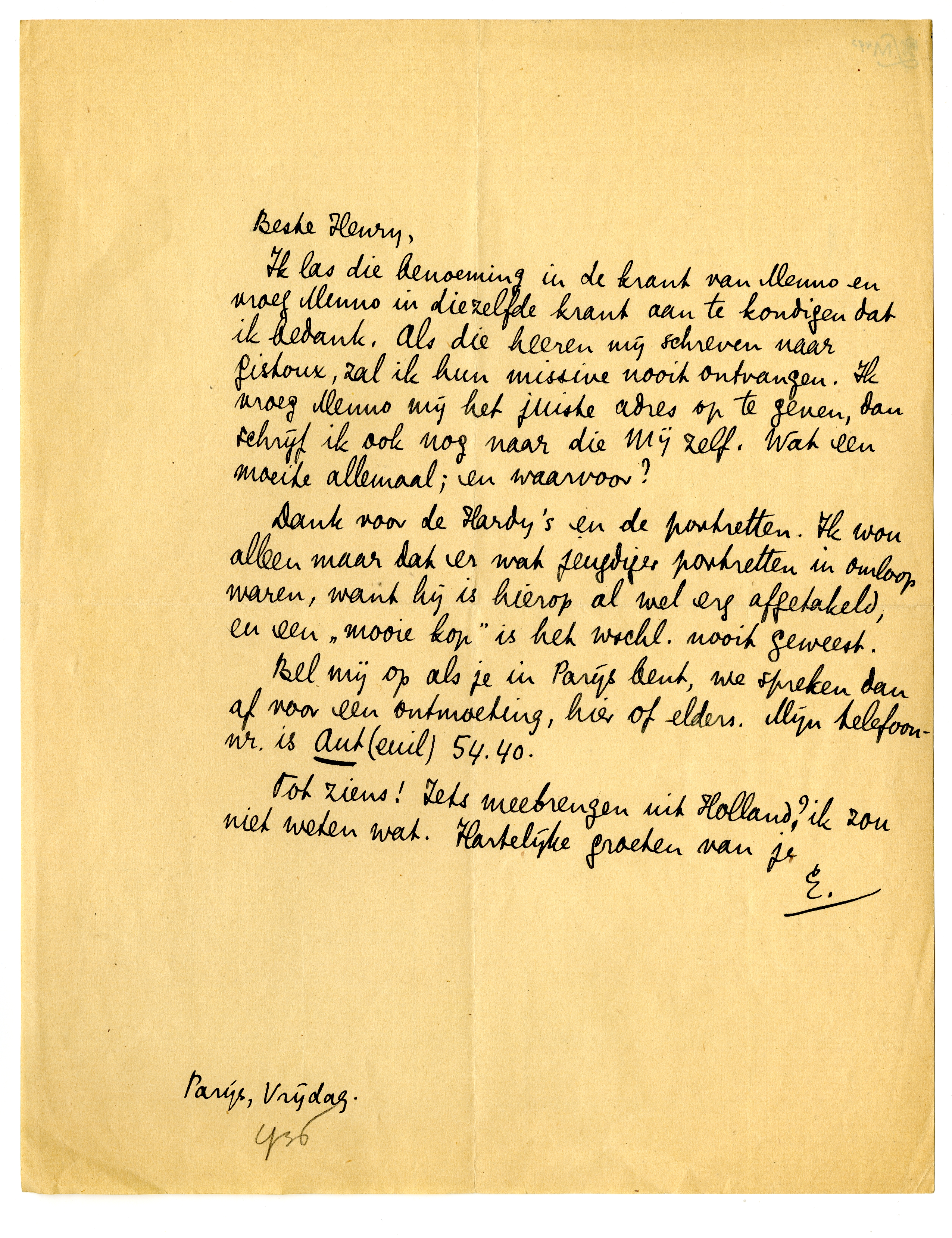 Ik las die benoeming in de krant van Menno en vroeg Menno in diezelfde krant aan te kondigen dat ik bedank. Als die heeren mij schreven naar Gistoux, zal ik hun missive nooit ontvangen. Ik vroeg Menno mij het juiste adres op te geven, dan schrijf ik ook nog naar die Mij zelf.4249 Wat een moeite allemaal; en waarvoor?