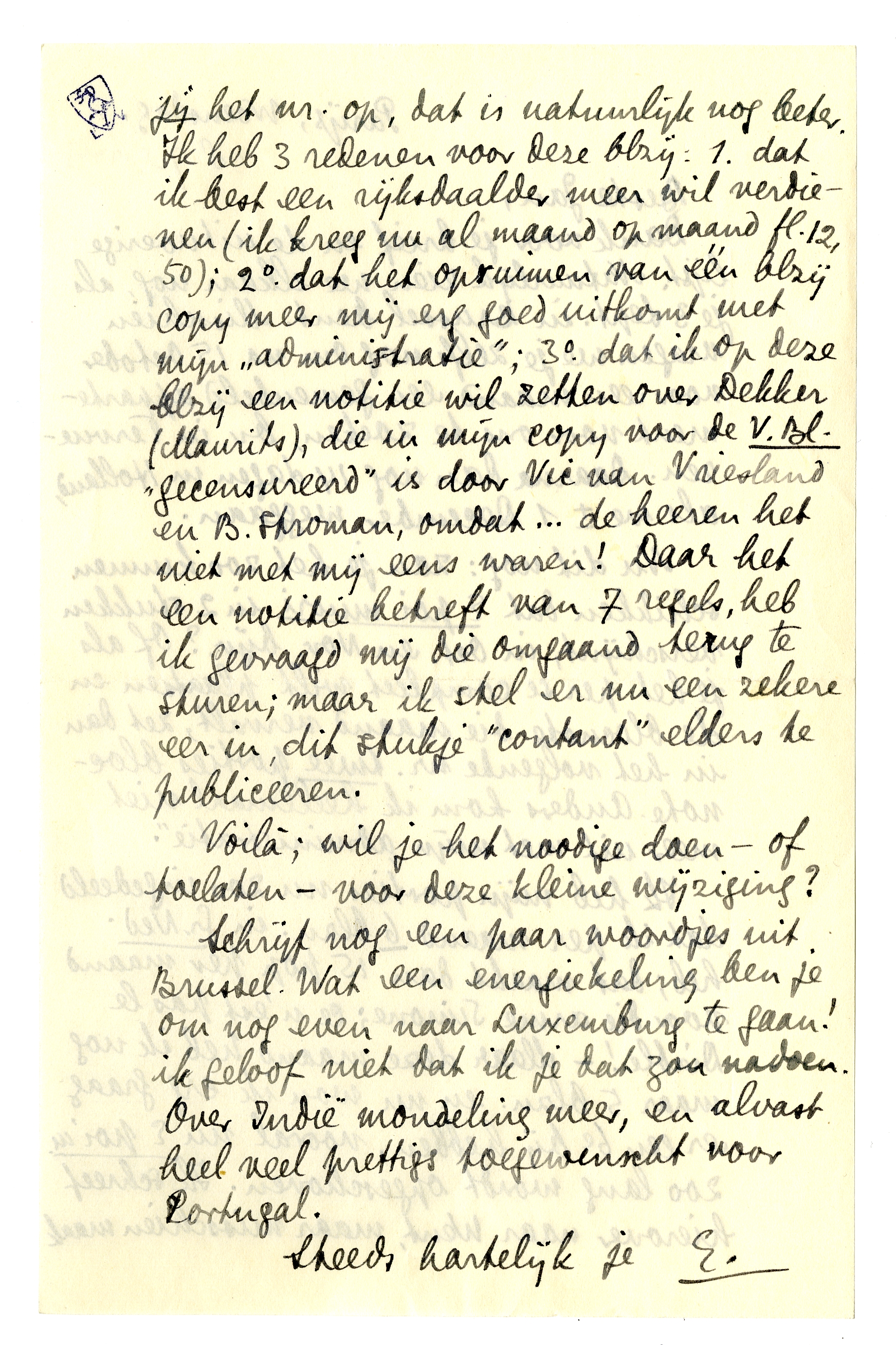 Ik heb mijn porties nu zoo ingedeeld dat ik per maand 6 blzn. in Gr. Ned. heb; dat maakt dan 15 pop per maand voor die arme Simone; ce n'est pas le Diable! - Maar deze maand heb ik nog maar 5 blzn. en nu wou ik erg graag er een 6e bij hebben, vooral nu E poi m. zoo lang wordt opgeschoven. Ik schreef hierover naar Went, maar misschien maak jij het nr. op, dat is natuurlijk nog beter. Ik heb 3 redenen voor deze blzij: 1. dat ik best een rijksdaalder meer wil verdienen (ik kreeg nu al maand op maand fl. 12,50); 2o. dat het opruimen van één blzij copy meer mij erg goed uitkomt met mijn ‘administratie’; 3o. dat ik op deze blzij een notitie wil zetten over Dekker (Maurits), die in mijn copy voor de V. Bl. ‘gecensureerd’ is door Vic van Vriesland en B. Stroman, omdat... de heeren het niet met mij eens waren! Daar het een notitie betreft van 7 regels, heb ik gevraagd mij die omgaand terug te sturen; maar ik stel er nu een zekere eer in, dit stukje ‘contant’ elders te publiceeren.