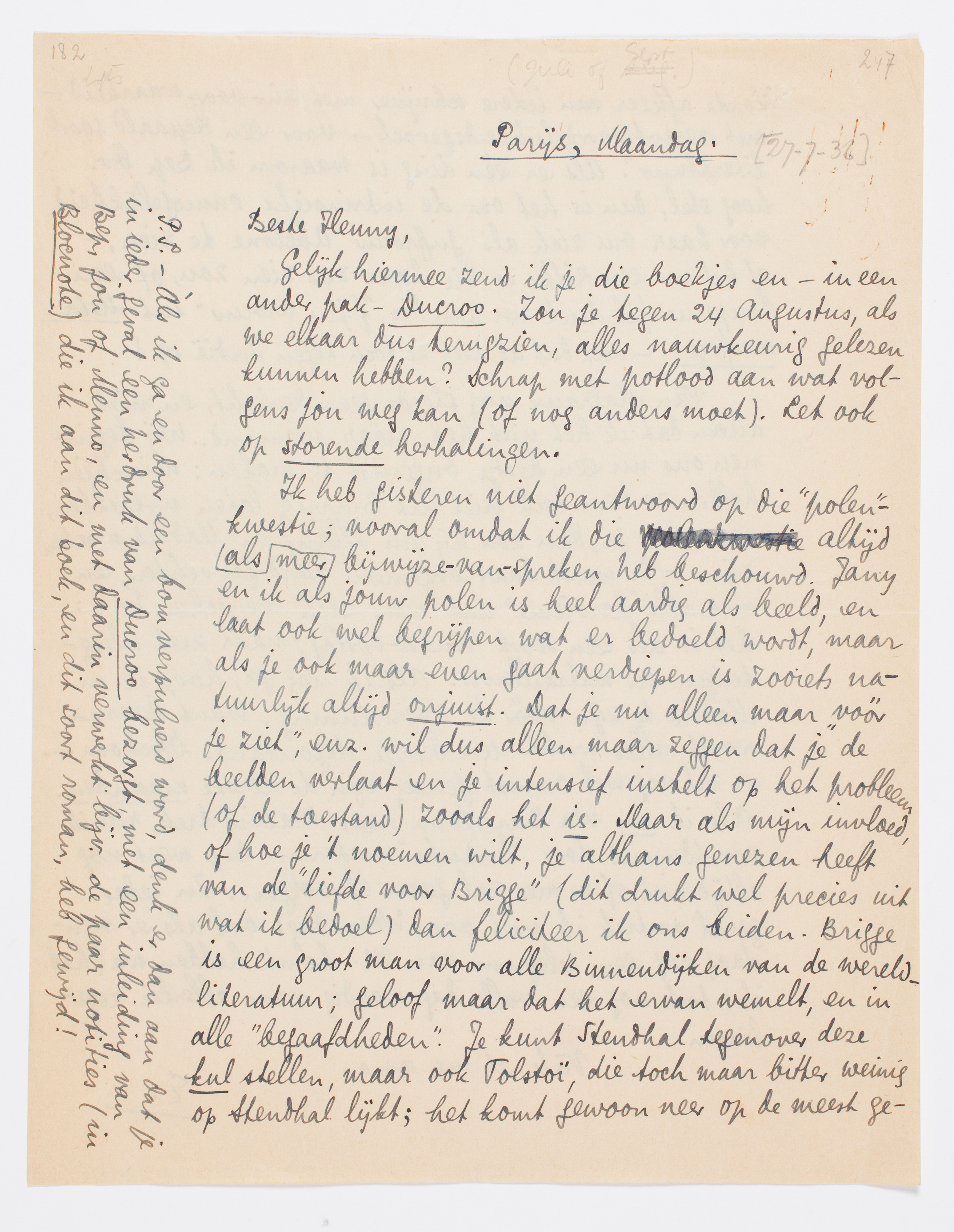 Ik heb gisteren niet geantwoord op die ‘polen’-kwestie; vooral omdat ik die altijd meer als bijwijze-van-spreken heb beschouwd. Jany en ik als jouw polen is heel aardig als beeld, en laat ook wel begrijpen wat er bedoeld wordt, maar als je ook maar even gaat verdiepen is zooiets natuurlijk altijd onjuist. Dat je nu alleen maar ‘vóór je ziet’, enz. wil dus alleen maar zeggen dat je de beelden verlaat en je intensief instelt op het probleem (of de toestand) zooals het is. Maar als mijn invloed, of hoe je 't noemen wilt, je althans genezen heeft van de ‘liefde voor Brigge’4310 (dit drukt wel precies uit wat ik bedoel) dan feliciteer ik ons beiden. Brigge is een groot man voor alle Binnendijken van de wereldliteratuur; geloof maar dat het ervan wemelt, en in alle ‘begaafdheden’. Je kunt Stendhal tegenover deze kul stellen, maar ook Tolstoï, die toch maar bitter weinig op Stendhal lijkt; het komt gewoon neer op de meest gezonde afkeer van iedere schrijver met zin-voor-waarheid - met verantwoordelijkheidsgevoel - voor een bepaald soort ‘literatuur’. Als er één ding is waarom ik Bep bv. hoog stel, dan is het om de intrinsieke onmogelijkheid voor haar om zich als juffrouw Abelone4311 te zien, - of het nu een Rilke is die haar zoo zien zou, of een Couperus (ik denk nu aan die ‘fijne vrouw’ uit Metamorfoze4312). - Met dat al ziet ze toch tegen Indië op!
