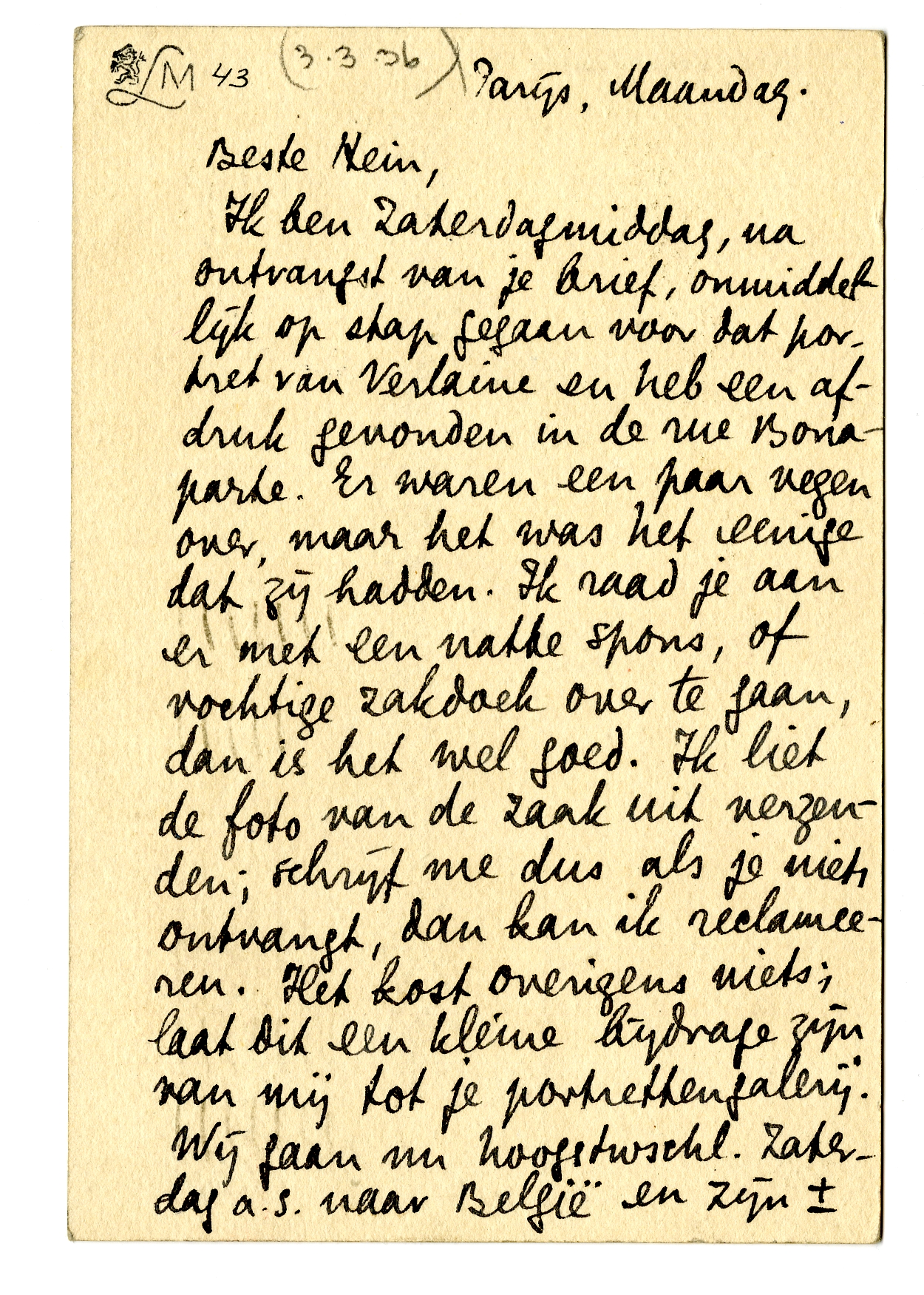 Ik ben Zatermiddag, na ontvangst van je brief, onmiddellijk op stap gegaan voor dat portret van Verlaine4325 en heb een afdruk gevonden in de rue Bonaparte. Er waren een paar vegen over, maar het was het eenige dat zij hadden. Ik raad je aan er met een natte spons, of vochtige zakdoek over te gaan, dan is het wel goed. Ik liet de foto van de zaak uit verzenden; schrijf me dus als je niets ontvangt, dan kan ik reclameeren. Het kost overigens niets; laat dit een kleine bijdrage zijn van mij tot je portrettengalerij. Wij gaan nu hoogstwschl. Zaterdag a.s. naar België en zijn ± 15 Aug. in Holland (Amersfoort). Ik hoop je spoedig te zien. De rest mondeling.