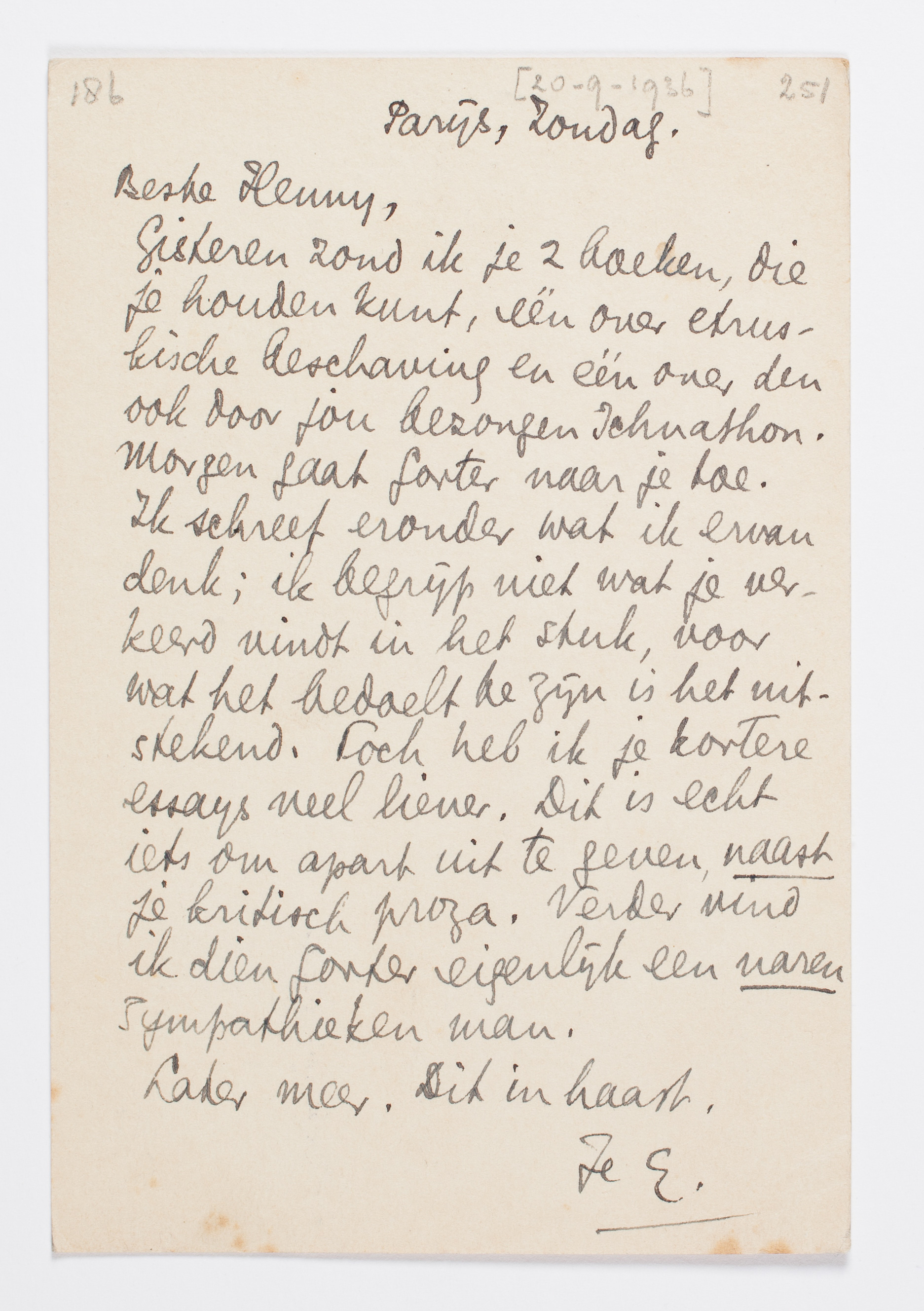 Gisteren zond ik je 2 boeken, die je houden kunt, één over etruskische beschaving en één over den ook door jou bezongen Ichnathon.4361 Morgen gaat Gorter naar je toe. Ik schreef eronder wat ik ervan denk; ik begrijp niet wat je verkeerd vindt in het stuk, voor wat het bedoelt te zijn is het uitstekend. Toch heb ik je kortere essays veel liever. Dit is echt iets om apart uit te geven, naast je kritisch proza. Verder vind ik dien Gorter eigenlijk een naren sympathieken man.