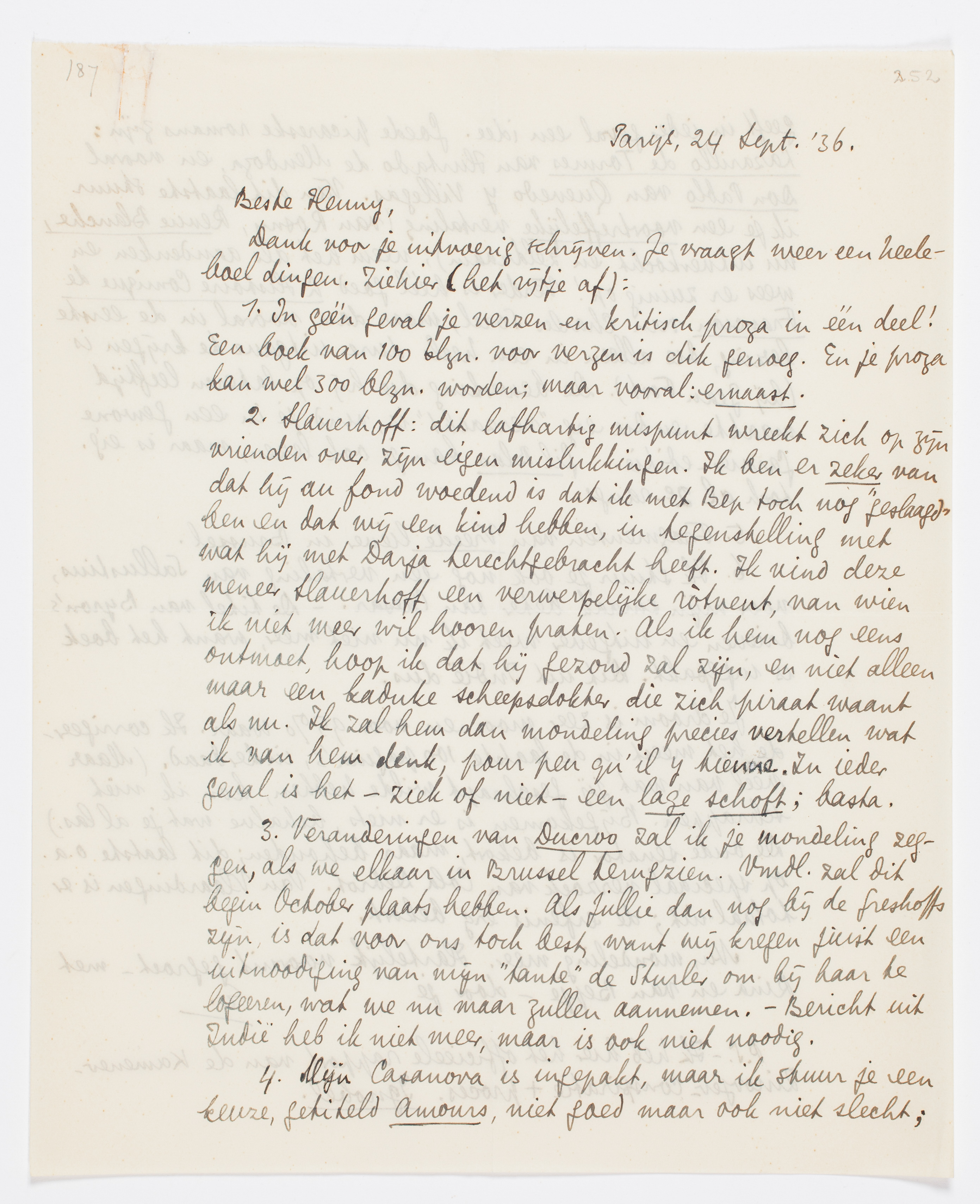 Je droom is zeer mooi en voor 95% waar. Ik corrigeerde het meest in de laatste 100 pagina's, inderdaad. (Maar veel van wat jij geschrapt wilde hebben, kon ik niet schrappen.4366 Bijgekomen is er niets, behalve wat je al las.) De oude senator is bekort, maar behouden4367; dit laatste o.a. op speciaal verzoek van Cola Debrot. Van Vlaardingen is er totaal uit; de erfenis èrg bekort.4368