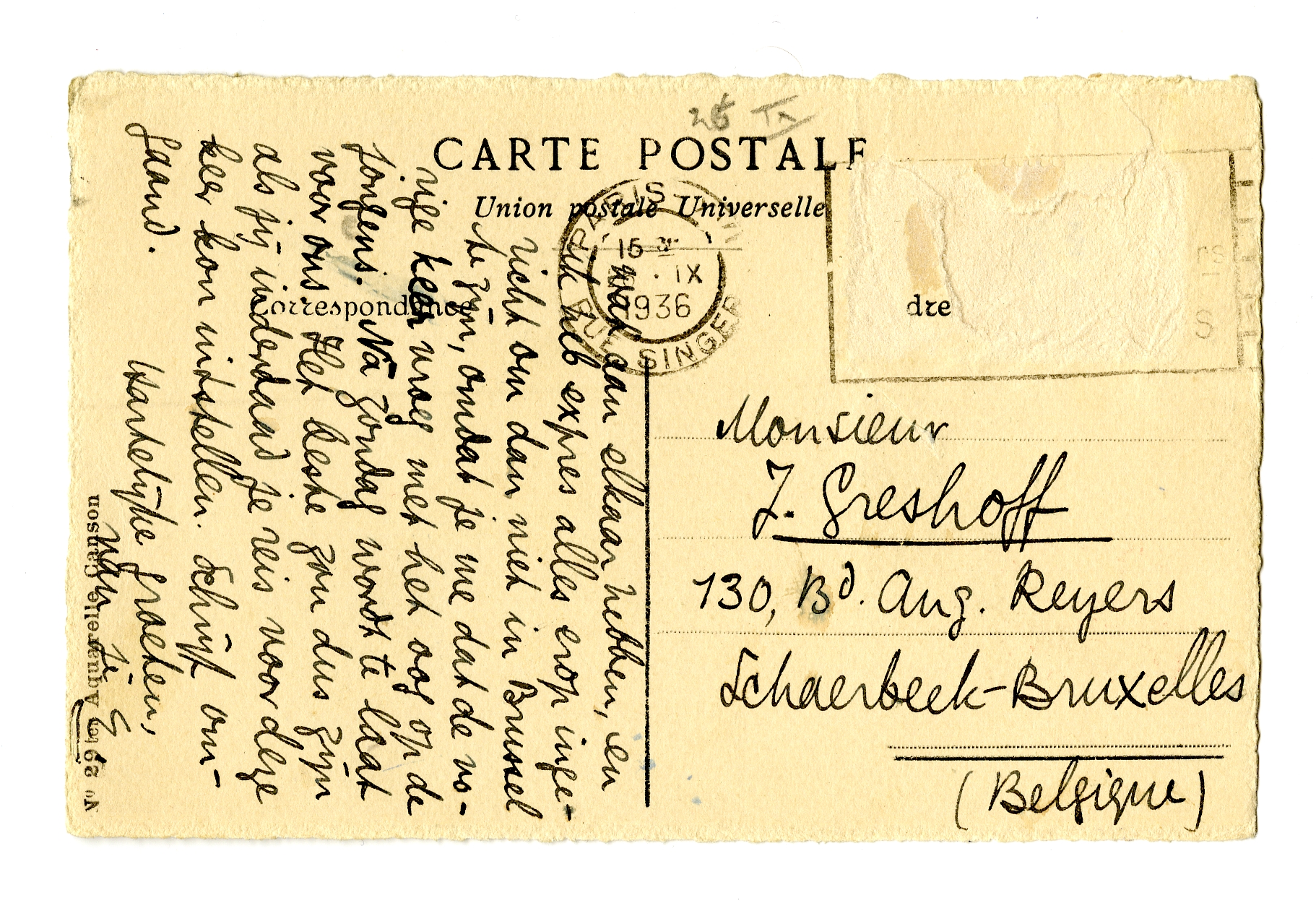 Achter elkaar kwamen nu je 2 brieven: het spijt me erg, maar we kunnen geen andere dagen. In je eerste missive stond dat Atie alleen Donderdag weg zou zijn; in dat geval hadden we onze komst één dag kunnen uitstellen (dus Donderdag komen inpl. van Woensdag), zoodat we Atie Vrijdag zouden hebben teruggehad. Maar nu schrijf je dat jullie beiden èn Donderdag èn Vrijdag weg willen. We zouden dan nog later moeten gaan, wat niet alleen ten opzichte van de tante slecht gaat, maar ook ten opzichte van de dingen die we hier nog doen moeten. Bovendien zouden we dan eerst Zaterdag en Zondag wat aan elkaar hebben, en ik heb expres alles erop ingericht om dan niet in Brussel te zijn, omdat je me dat de vorige keer vroeg met het oog op de jongens. Na Zondag wordt te laat voor ons. Het beste zou dus zijn als jij inderdaad je reis voor deze keer kon uitstellen. Schrijf omgaand.