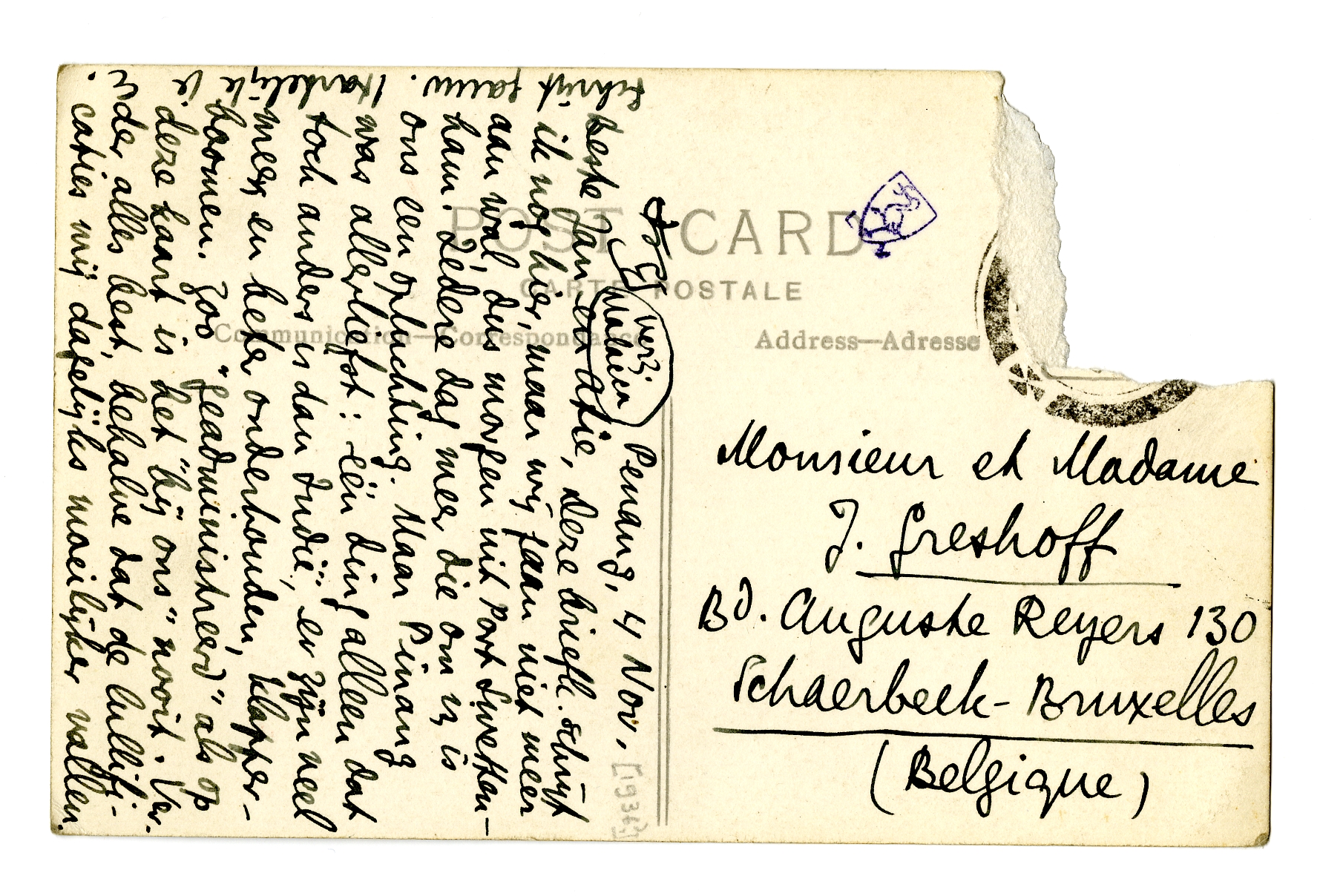Beste Jan en Atie, Deze briefk. schrijf ik nog hier, maar wij gaan niet meer aan wal, dus morgen uit Port Swettenham. Iedere dag meer die om is, is ons een opluchting. Maar Pinang was allerliefst: één ding alleen dat toch anders is dan Indië, er zijn veel meer en beter onderhouden, klapperboomen. Zoo ‘geadministreerd’ als op deze kaart is het ‘bij ons’ nooit. Verder alles best, behalve dat de lullificaties mij dagelijks moeilijker vallen.4392 Schrijf gauw.
