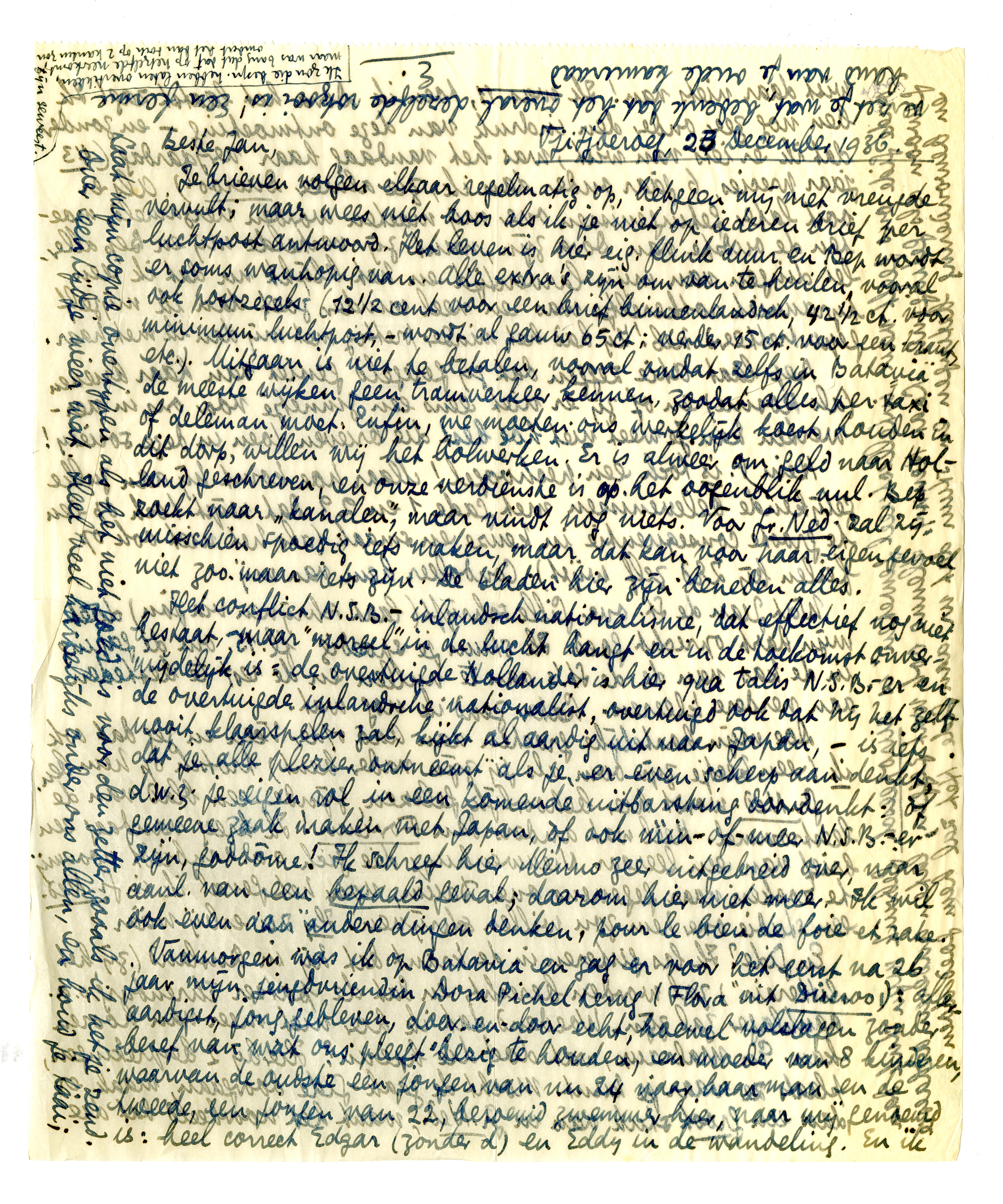 Je brieven volgen elkaar regelmatig op, hetgeen mij met vreugde vervult; maar wees niet boos als ik je niet op iederen brief per luchtpost antwoord. Het leven is hier eig. flink duur en Bep wordt er soms wanhopig van. Alle extra's zijn om van te huilen, vooral ook postzegels (12½ cent voor een brief binnenlandsch, 42½ ct. voor minimum luchtpost, - wordt al gauw 65 ct; verder 15 ct. voor een krant, etc). Uitgaan is niet te betalen, vooral omdat zelfs in Batavia de meeste wijken geen tramverkeer kennen, zoodat alles per taxi of deleman moet. Enfin, we moeten ons werkelijk koest houden in dit dorp, willen wij het bolwerken. Er is alweer om geld naar Holland geschreven, en onze verdienste is op het oogenblik nul. Bep zoekt naar ‘kanalen’, maar vindt nog niets. Voor Gr. Ned. zal zij misschien spoedig iets maken, maar dat kan voor haar eigen gevoel niet zoo maar iets zijn. De bladen hier zijn beneden alles.