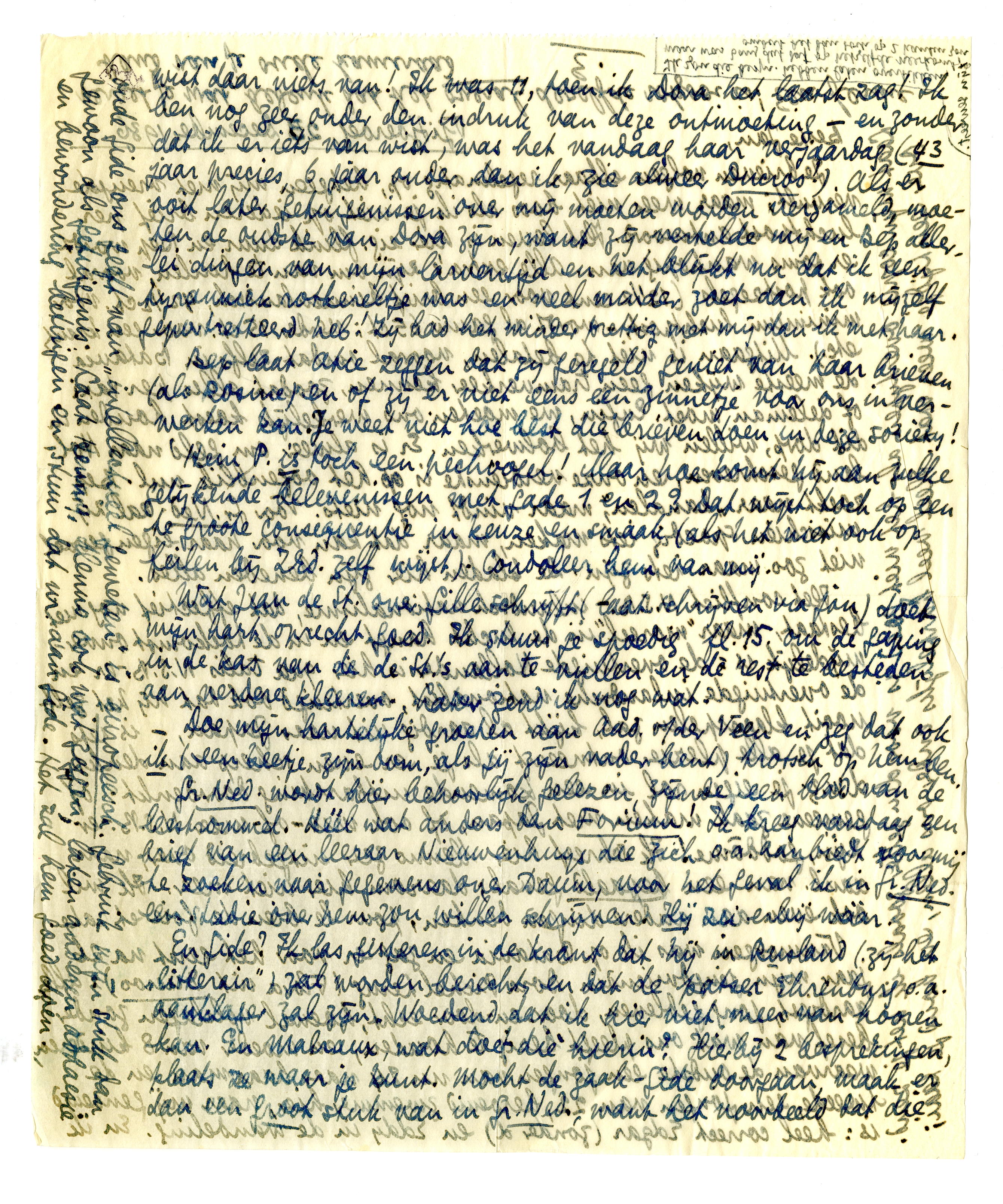 En Gide? Ik las gisteren in de krant dat hij in Rusland (zij het ‘litterair’) zal worden berecht en dat de patser Ehrenburg o.a. aanklager zal zijn. Woedend dat ik hier niet meer van hooren kan. En Malraux, wat doet diè hierin? Hierbij 2 besprekingen, plaats ze waar je kunt.4422 Mocht de zaak-Gide doorgaan, maak er dan een groot stuk van in Gr. Ned., want het voorbeeld dat die oude Gide ons geeft van ‘intellectueel geweten’ is europeesch. Gebruik mijn stuk dan gewoon als getuigenis. Laat Henny, Menno ook wat zeggen; laten anderen adhaesie en bewondering betuigen en stuur dat nu aan Gide. Het zal hem goed doen.