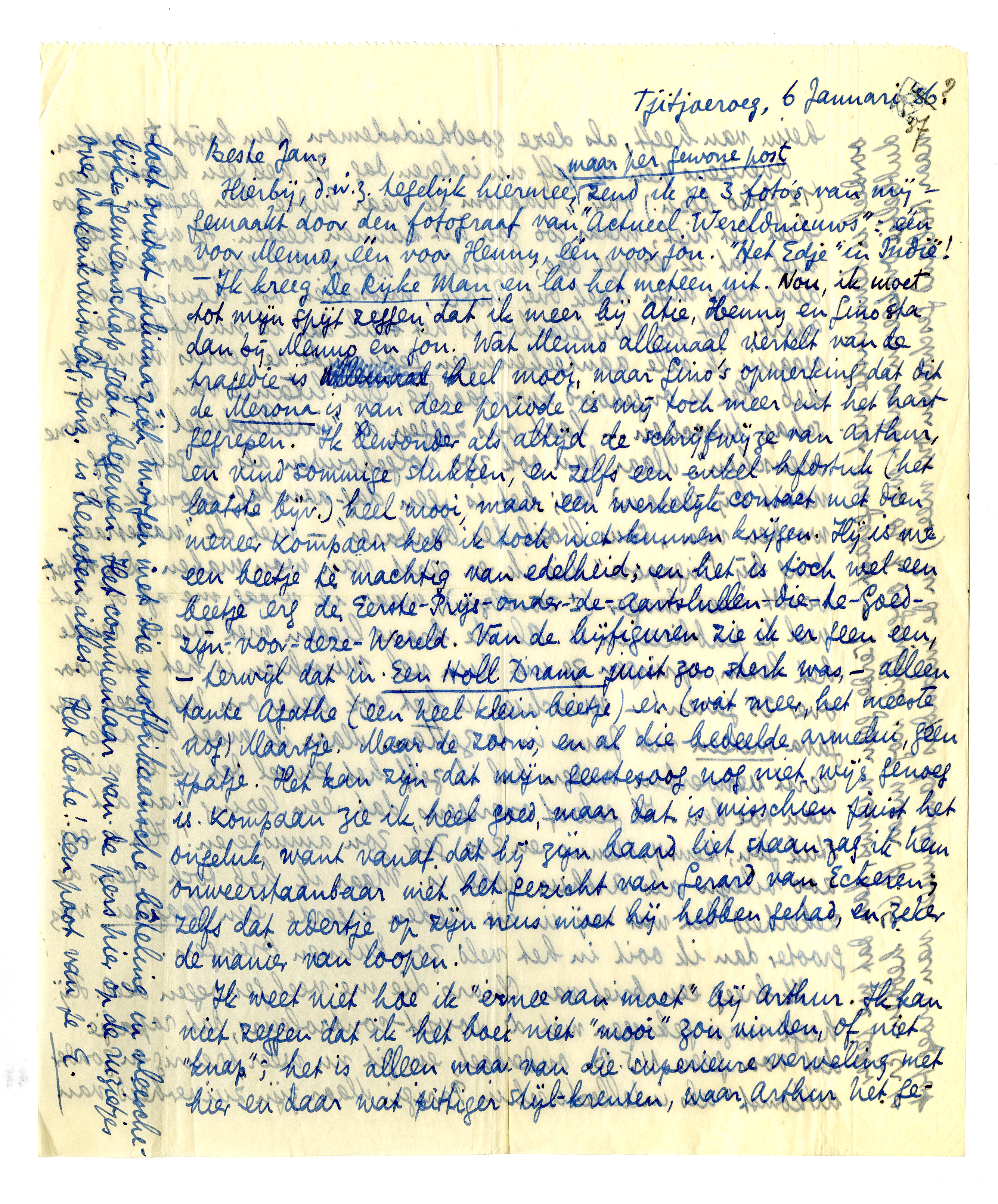 Hierbij, d.w.z. tegelijk hiermee maar per gewone post zend ik je 3 foto's van mij - gemaakt door den fotograaf van ‘Actueel Wereldnieuws’: één voor Menno, één voor Henny, één voor jou. ‘Het Edje’ in Indië! - Ik kreeg De Rijke Man en las het meteen uit. Nou, ik moet tot mijn spijt zeggen dat ik meer bij Atie, Henny en Gino sta dan bij Menno en jou. Wat Menno allemaal vertelt van de tragedie is heel mooi, maar Gino's opmerking dat dit de Merona is van deze periode is mij toch meer uit het hart gegrepen. Ik bewonder als altijd de schrijfwijze van Arthur, en vind sommige stukken, en zelfs een enkel hoofdstuk (het laatste bijv.) heel mooi, maar een werkelijk contact met dien meneer Kompaan heb ik toch niet kunnen krijgen. Hij is me een beetje tè machtig van edelheid; en het is toch wel een beetje erg den Eerste-Prijs-onder-de-Aartslullen-die-te-Goed-zijn-voor-deze-Wereld. Van de bijfiguren zie ik er geen een, - terwijl dat in Een Holl. Drama juist zoo sterk was, - alleen tante Agathe (een heel klein beetje) en (wat meer, het meeste nog) Maartje. Maar de zoons, en al die bedeelde armelui, geen spatje. Het kan zijn dat mijn geestesoog nog niet wijs genoeg is. Kompaan zie ik heel goed, maar dat is misschien juist het ongeluk, want vanaf dat hij zijn baard liet staan zag ik hem onweerstaanbaar met het gezicht van Gerard van Eckeren; zelf dat adertje op zijn neus moet hij hebben gehad, en zeker de manier van loopen.