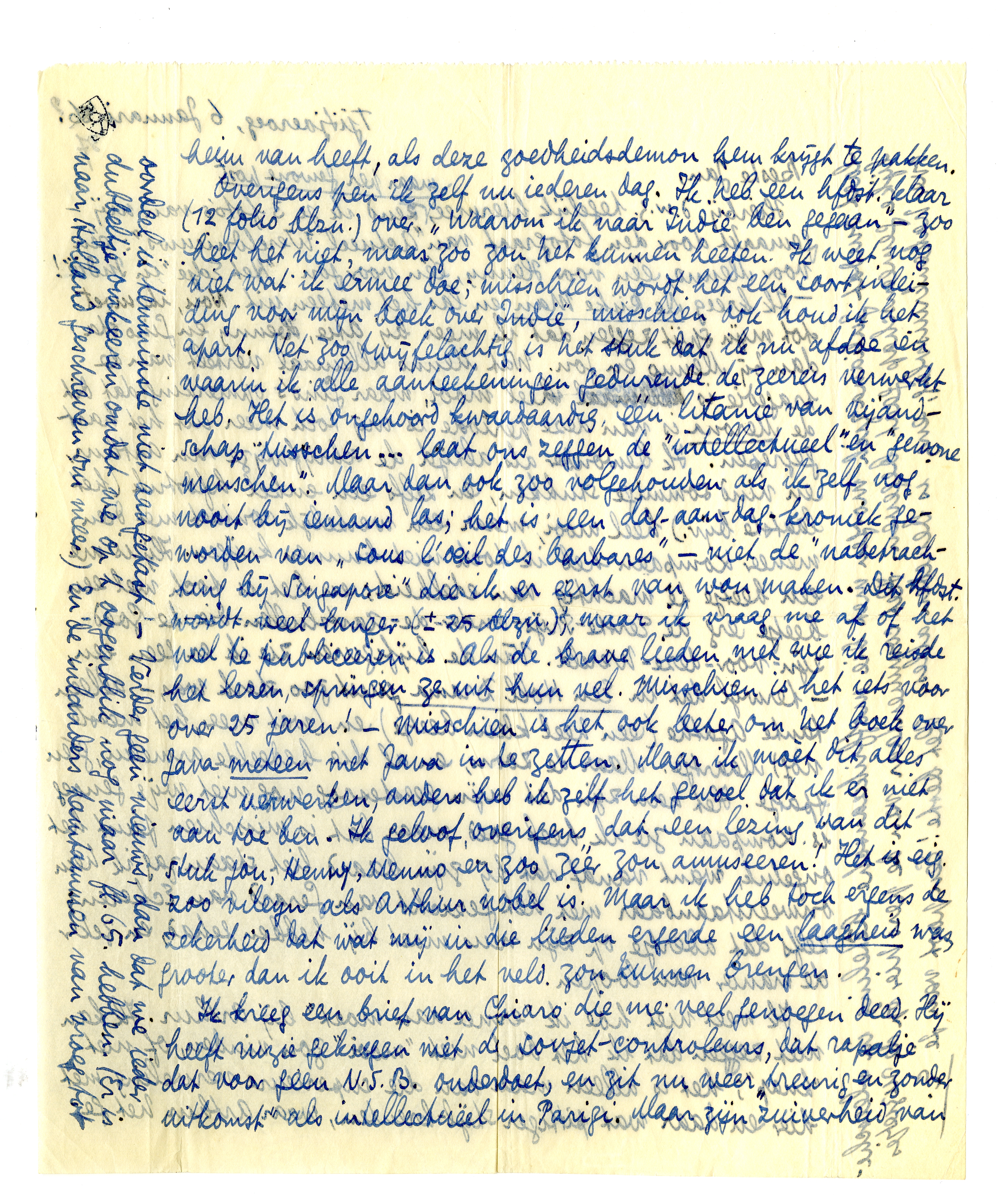 Overigens pen ik zelf nu iederen dag. Ik heb een hfdst. klaar (12 folio blzn.) over ‘Waarom ik naar Indië ben gegaan’ - zoo heet het niet, maar zoo zou het kunnen heeten. Ik weet nog niet wat ik ermee doe; misschien wordt het een soort inleiding voor mijn boek over Indië, misschien ook houd ik het apart.4436 Net zoo twijfelachtig is het stuk dat ik nu afdoe en waarin ik alle aanteekeningen gedurende de zeereis verwerkt heb. Het is ongehoord kwaadaardig één litanie van vijandschap tusschen... laat ons zeggen de ‘intellectueel’ en ‘gewone menschen’. Maar dan ook zoo volgehouden als ikzelf nog nooit bij iemand las; het is een dag-aan-dag-kroniek geworden van ‘sous l'oeil des barbares’4437 - niet de ‘nabetrachting bij Singapore’ die ik er eerst van wou maken. Dit hfst. wordt veel langer (± 25 blzn.), maar ik vraag me af of het wel te publiceeren is. Als de brave lieden met wie ik reisde het lezen, springen ze uit hun vel. Misschien is het iets voor over 25 jaren! - Misschien is het ook beter om het boek over Java meteen met Java in te zetten. Maar ik moèt dit alles eerst verwerken, anders heb ik zelf het gevoel dat ik er niet aan toe ben. Ik geloof overigens dat een lezing van dit stuk jou, Henny, Menno en zoo zéér zou amuseeren! Het is eig. zoo vileyn als Arthur nobel is. Maar ik heb toch ergens de zekerheid dat wat mij in die lieden ergerde een laagheid was, grooter dan ik ooit in het veld zou kunnen brengen.