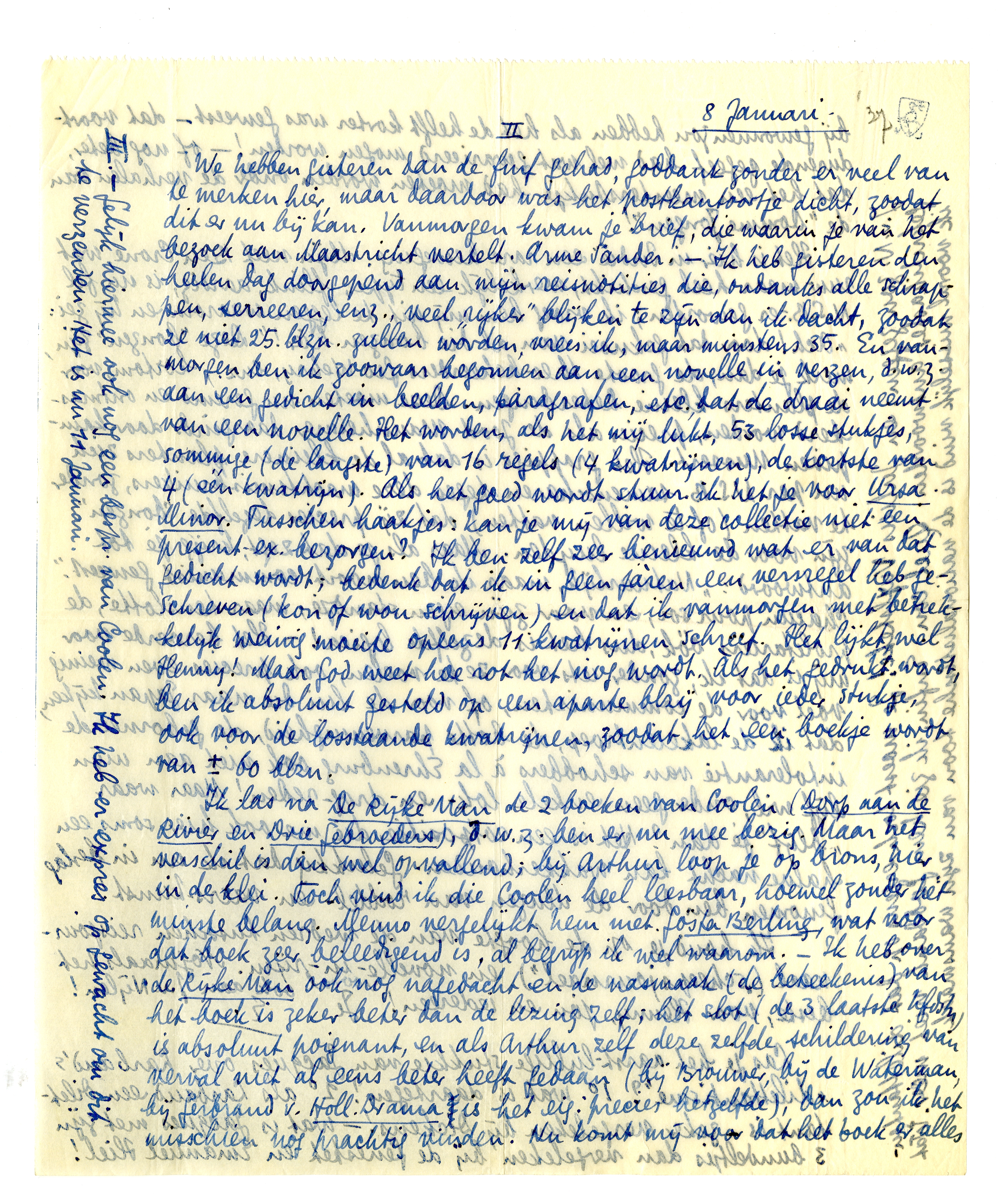 We hebben gisteren dan de fuif gehad, goddank zonder er veel van te merken hier, maar daardoor was het postkantoortje dicht, zoodat dit er nu bij kan. Vanmorgen kwam je brief, die waarin je van het bezoek aan Maastricht vertelt. Arme Sander. - Ik heb gisteren den heelen dag doorgepend aan mijn reisnotities die, ondanks alle schrappen, serreeren, enz., veel ‘rijker’ blijken te zijn dan ik dacht, zoodat ze niet 25 blzn. zullen worden, vrees ik, maar minstens 35. En vanmorgen ben ik zoowaar begonnen aan een novelle in verzen, d.w.z. aan een gedicht in beelden, paragrafen, etc., dat de draai neemt van een novelle. Het worden, als het mij lukt, 53 losse stukjes, sommige (de langste) van 16 regels (4 kwatrijnen), de kortste van 4 (één kwatrijn). Als het goed wordt stuur ik het je voor Ursa Minor.4439 Tusschen haakjes: kan je mij van deze collectie niet een present-ex. bezorgen? Ik ben zelf zeer benieuwd wat er van dat gedicht wordt; bedenk dat ik in geen jàren een versregel heb geschreven (kon of wou schrijven) en dat ik vanmorgen met betrekkelijk weinig moeite opeens 11 kwatrijnen schreef. Het lijkt wel Henny! Maar God weet hoe rot het nog wordt. Als het gedrukt wordt, ben ik absoluut gesteld op een aparte blzij voor ieder stukje, ook voor de losstaande kwatrijnen, zoodat het een boekje wordt van ± 60 blzn.