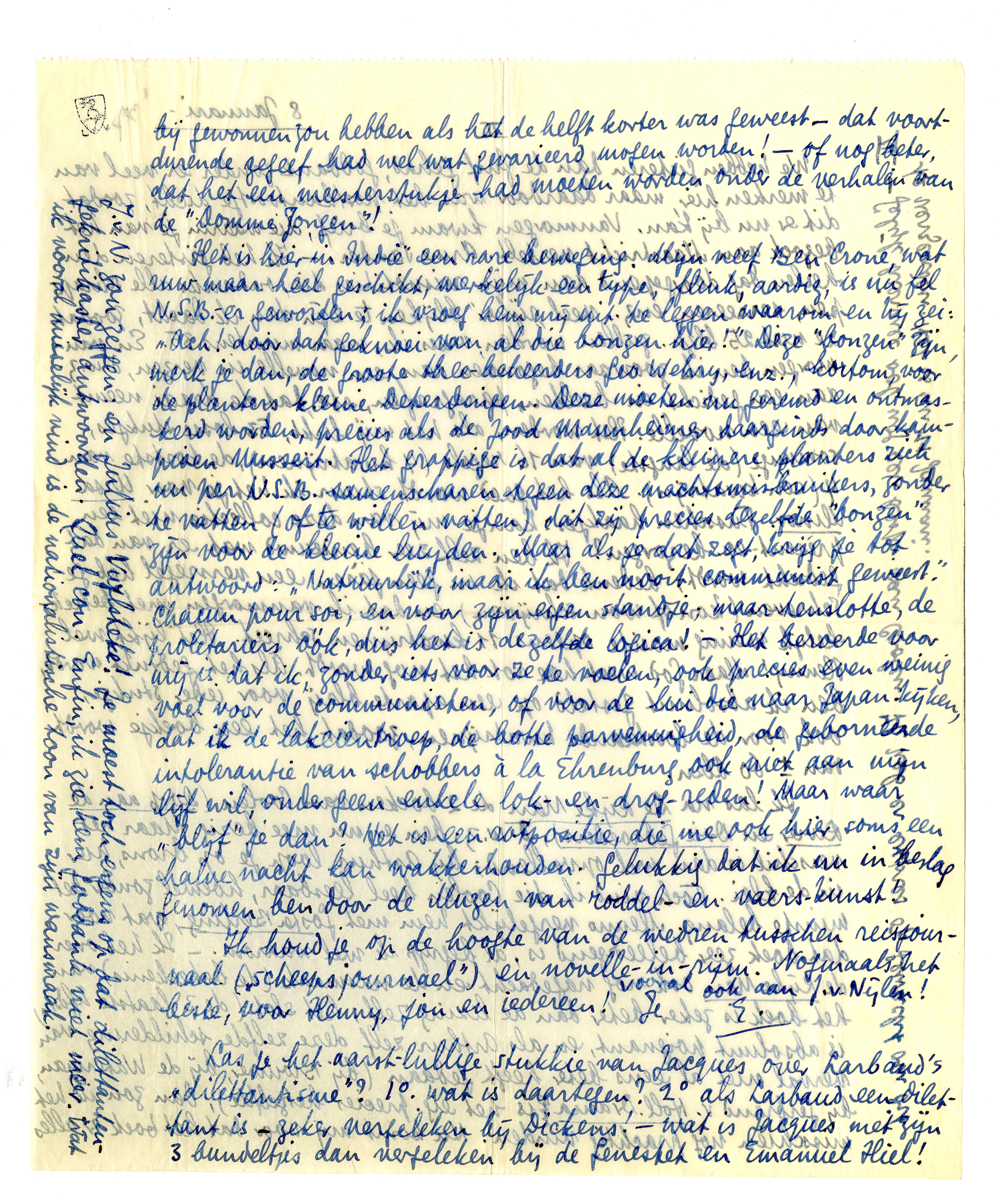 Het is hier in Indië een rare beweging. Mijn neef Ben Crone, wat ruw maar heel geschikt, werkelijk een type, flink, aardig, is nu fel N.S.B.-er geworden; ik vroeg hem mij uit te leggen waarom en hij zei: ‘Ach! door dat geknoei van al die bonzen hier!’ Deze ‘bonzen’ zijn, merk je dan, de groote thee-beheerders Geo Wehry, enz., kortom, voor de planters kleine Deterdingen. Deze moeten nu geremd en ontmaskerd worden, precies als de Jood Mannheimer daarginds door kampioen Mussert.4441 Het grappige is dat al de kleinere planters zich nu per N.S.B. samenscharen tegen deze machtsmisbruikers, zonder te vatten (of te willen vatten) dat zij precies dezelfde ‘bonzen’ zijn voor de kleine luyden. Maar als je dat zegt, krijg je tot antwoord: ‘Natuurlijk, maar ik ben nooit communist geweest.’ Chacun pour soi, en voor zijn eigen standje; maar tenslotte, de proletariërs óók, dus het is dezelfde logica! - Het beroerde voor mij is dat ik, zonder iets voor ze te voelen, ook precies even weinig voel voor de communisten, of voor de lui die naar Japan kijken, dat ik de lakeientroep, de botte parvenuïgheid, de geborneerde intolerantie van schobbers à la Ehrenburg ook niet aan mijn lijf wil, onder geen enkele lok-endrog-reden! Maar waar ‘blijf’ je dan? Het is een rotpositie, die me ook hier soms een halve nacht kan wakkerhouden. Gelukkig dat ik nu in beslag genomen ben door de Muzen van roddel- en vaerskunst!