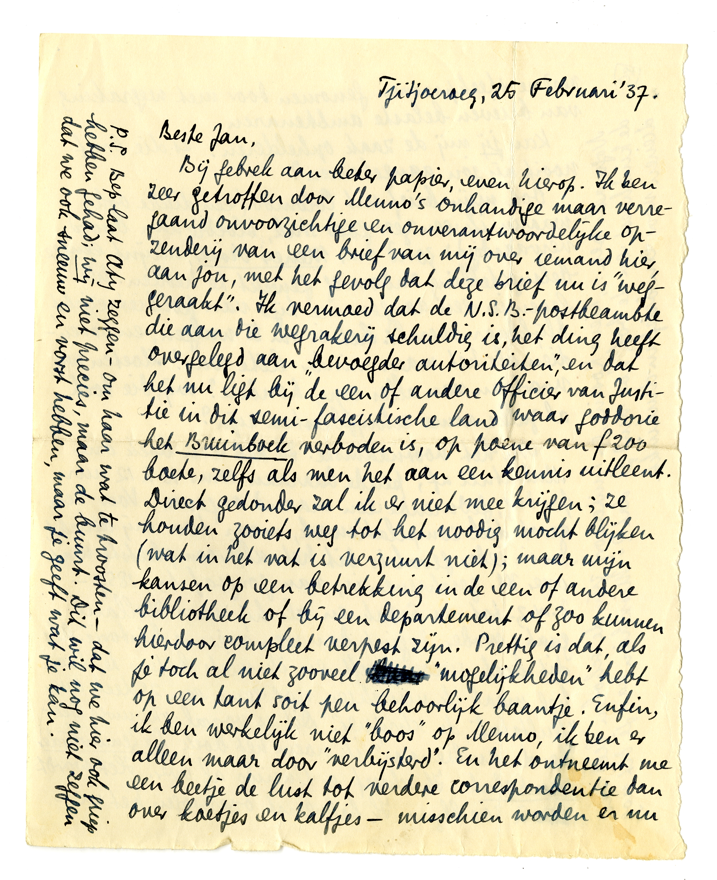 Bij gebrek aan beter papier, even hierop. Ik ben zeer getroffen door Menno's onhandige maar verregaand onvoorzichtige en onverantwoordelijke opzenderij van een brief van mij over iemand hier, aan jou, met het gevolg dat deze brief nu is ‘weggeraakt’.4469 Ik vermoed dat de N.S.B.-postbeambte die aan die wegrakerij schuldig is, het ding heeft overgelegd aan ‘bevoegder autoriteiten’, en dat het nu ligt bij de een of andere Officier van Justitie in dit semi-fascistische land waar goddorie het Bruinboek4470 verboden is, op poene van f200 boete, zelfs als men het aan een kennis uitleent. Direct gedonder zal ik er niet mee krijgen; ze houden zooiets weg tot het noodig mocht blijken (wat in het vat is verzuurt niet); maar mijn kansen op een betrekking in de een of andere bibliotheek of bij een departement of zoo kunnen hierdoor compleet verpest zijn. Prettig is dat, als je toch al niet zooveel ‘mogelijkheden’ hebt op een tant soit peu behoorlijk baantje. Enfin, ik ben werkelijk niet ‘boos’ op Menno, ik ben er alleen maar door ‘verbijsterd’. En het ontneemt me een beetje de lust tot verdere correspondentie dan over koetjes en kalfjes - misschien worden er nu verdere steekproeven genomen door met wegraking van brieven belaste ambtenaren.