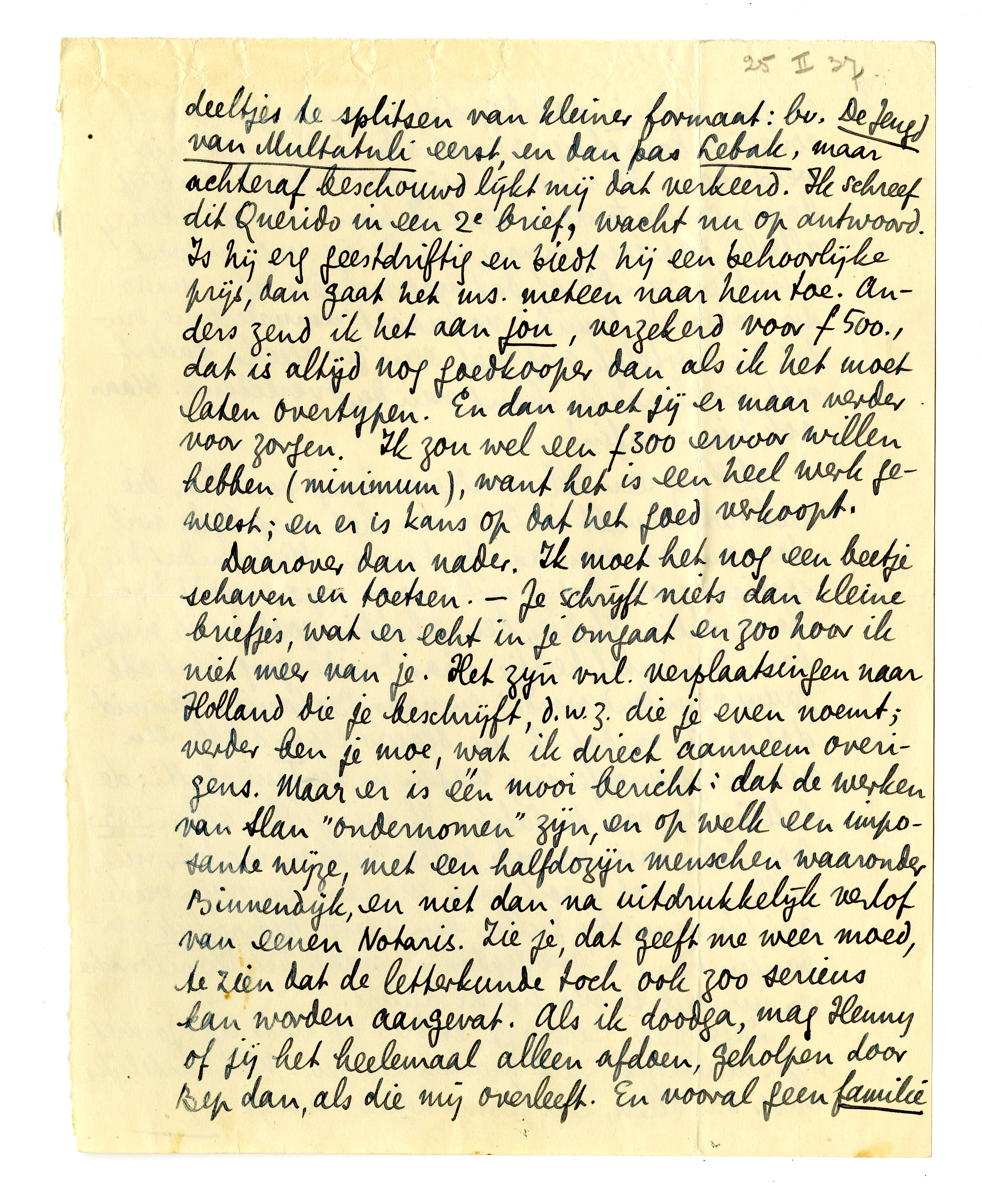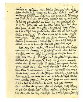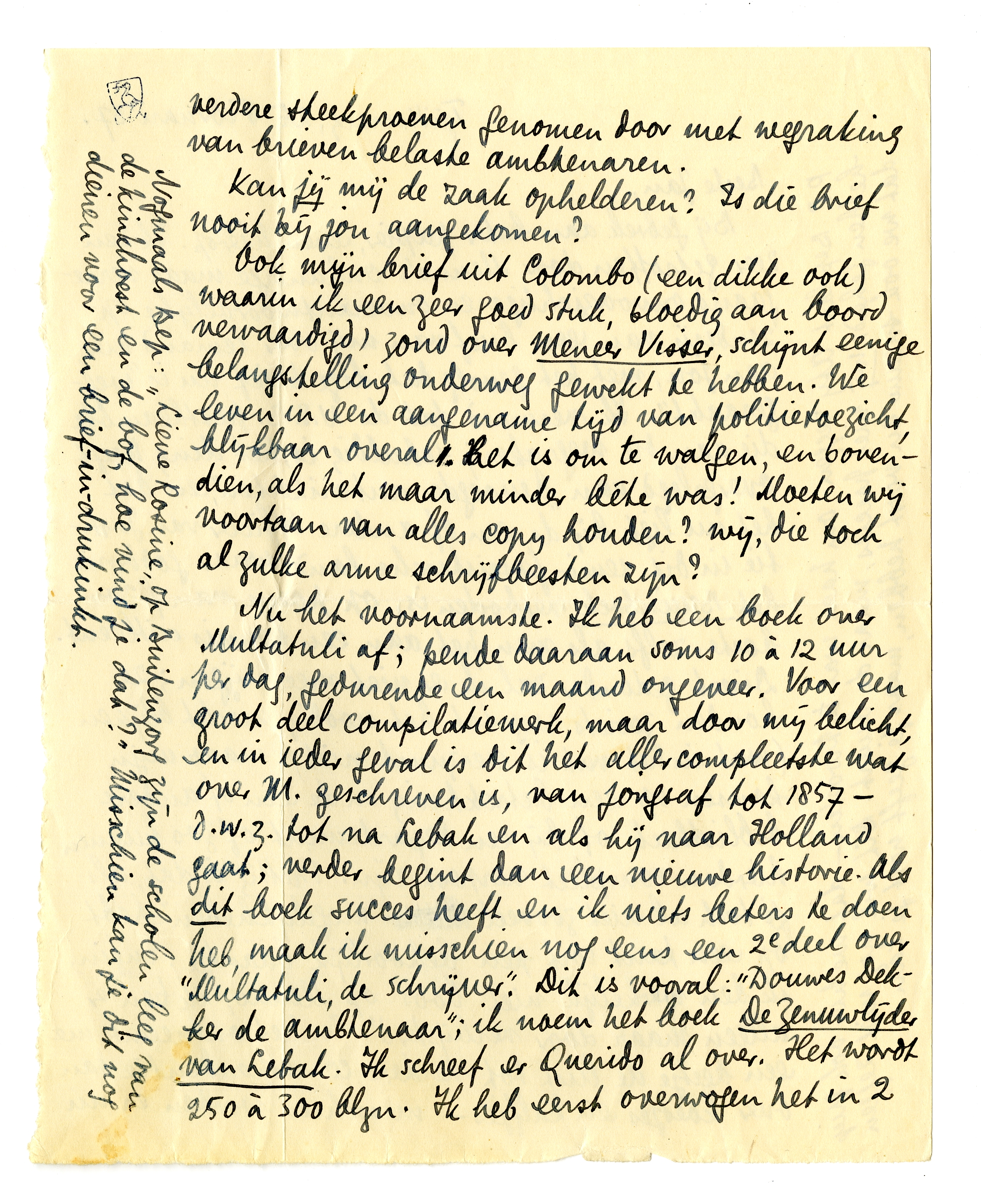 Nu het voornaamste. Ik heb een boek over Multatuli af; pende daaraan soms 10 à 12 uur per dag, gedurende een maand ongeveer. Voor een groot deel compilatiewerk, maar door mij belicht, en in ieder geval is dit het allercompleetste wat over M. geschreven is, van jongsaf tot 1857 - d.w.z. tot na Lebak en als hij naar Holland gaat; verder begint dan een nieuwe historie. Als dit boek succes heeft en ik niets beters te doen heb, maak ik misschien nog eens een 2e deel over ‘Multatuli, de schrijver’. Dit is vooral: ‘Douwes Dekker de ambtenaar’; ik noem het boek De Zenuwlijder van Lebak. Ik schreef er Querido al over. Het wordt 250 à 300 blzn. Ik heb eerst overwogen het in 2 deeltjes te splitsen van kleiner formaat: bv. De Jeugd van Multatuli eerst, en dan pas Lebak, maar achteraf beschouwd lijkt mij dat verkeerd. Ik schreef dit Querido in een 2e brief, wacht nu op antwoord.4472 Is hij erg geestdriftig en biedt hij een behoorlijke prijs, dan gaat het ms. meteen naar hem toe. Anders zend ik het aan jou, verzekerd voor f 500., dat is altijd nog goedkooper dan als ik het moet laten overtypen. En dan moet jij er maar verder voor zorgen. Ik zou wel een f300 ervoor willen hebben (minimum), want het is een heel werk geweest; en er is kans op dat het goed verkoopt.