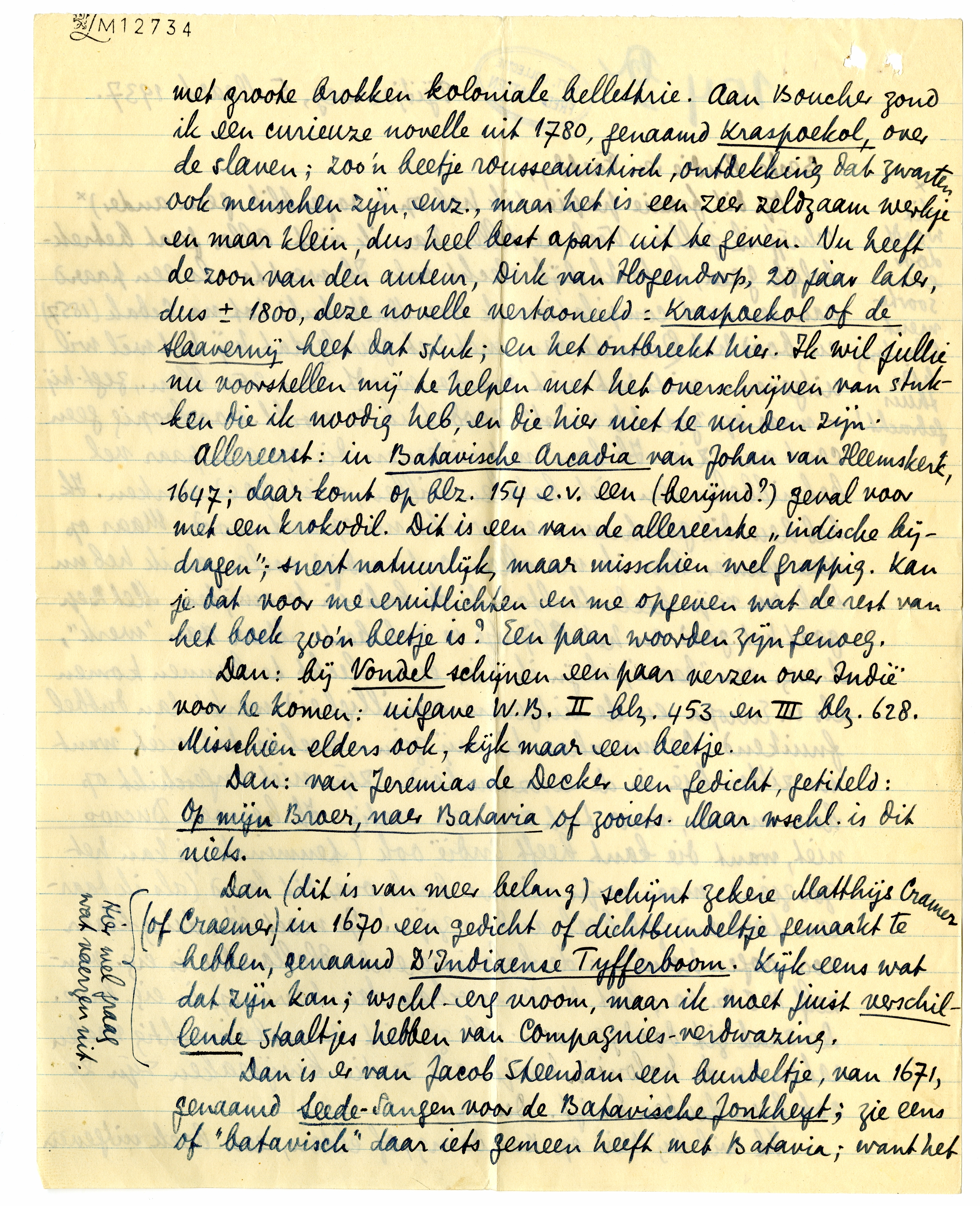 Ik wil bij Nix op Bandoeng, of elders, een boek uitgeven met groote brokken koloniale bellettrie.4511 Aan Boucher zond ik een curieuze novelle uit 1780, genaamd Kraspoekol, over de slaven; zoo'n beetje rousseauistisch, ontdekking dat zwarten ook menschen zijn, enz., maar het is een zeer zeldzaam werkje en maar klein, dus heel best apart uit te geven. Nu heeft de zoon van den auteur, Dirk van Hogendorp, 20 jaar later, dus ± 1800, deze novelle vertooneeld: Kraspoekol of de Slaavernij heet dat stuk; en het ontbreekt hier. Ik wil jullie nu voorstellen mij te helpen met het overschrijven van stukken die ik noodig heb, en die hier niet te vinden zijn.