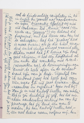 Ik schreef je dezer dagen naar het adres van R. Schorer 2 gewone brieven, meen ik, en 1 luchtpostbrief; het kan ook zijn dat dit de 2e gewone is. Reden hièrvoor is de komst van je Proloog.4513 Zoowel Bep als ik vinden dit stuk héél goed. Op zichzelf bevat het niet veel, maar het is verblijdend omdat het aangeeft dat je je stijl zùlt vinden, zooniet gevonden hebt. Voor het eerst misschien (of op sommige stukken van Heden ik... na) is hier een ding, waarin je geslaagd bent ‘klassiek’ te schrijven, zonder dat de naaktheid tegelijk kaal was; hier zijn nuances en diepten in en telkens volkomen marsmaniaansch. Je bent er dus in geslaagd je eigen stijl te depouilleeren, inplaats van een nieuwe (kale) stijl te leenen; verder ontbreken er ook de kinderachtige rarigheden in, die in Angèle bv. zooveel nog voorkwamen en waar Drievoudig Afscheid eig. niet uit loskwam. Zet ‘Annie’ voort (een zuster van ‘Jacques’?) en behoud dit fragment; vul het liever aan dan het te schrappen. Dat het ‘proloog’ heet is maar onzin; als je die titel verandert en het stukje schrapt waaruit alleen blijken moet dat J.F. hierna zijn boek gaat schrijven, is het een hoofdstuk als een ander. Het wandelen met A.M.-L. (vermoeden we), de herinneringen aan ‘Annie’, de heele sfeer èn de verhaaltrant, zijn van je beste. Eigenlijk zou ik verdomd graag het heele pak copy zien, waar J.F. uit gaat bestaan. Hoort ‘naamloos en ongekend’ daar ook bij? Kan je er niet Rudolf Snellen van maken? Het is zóóduidelijk jij zelf, dat het misschien aanbeveling verdient om van dit personage, dat jij bent, één man te maken, die dan Rudolf Snellen heet, - een veel betere naam, volgens mij, dan Jacques Fontein en Hans Zoo-en-zoo. Eig. heb je van de jeugd en andere omstandigheden van dien R.S. niet veel verteld; we weten dat hij óók verzen schrijft en getrouwd is. Zelfs De Bezoeker zou een stuk van hem kunnen zijn. Balzac had zoo zijn personage, Tolstoï ook (prins Nechloedov). En je ontloopt het verwijt dat je maar één mensch kunt maken, want Charles de Blécourt, en zelfs de mannelijke personages uit Hedda (?) zijn toch anders. Ik vind deze R.S. in A.M.B., De Bezoeker en nu hier; die losse stukken als ‘Naamloos etc.’ zouden, lijkt mij van hier gezien, ook uitstekend erbij komen.