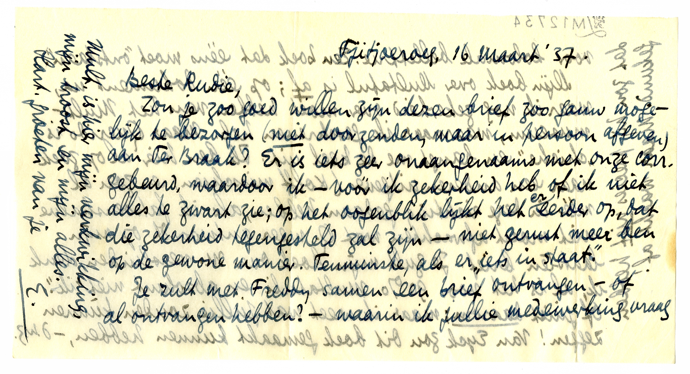 Zou je zoo goed willen zijn dezen brief4532 zoo gauw mogelijk te bezorgen (niet doorzenden, maar in persoon afgeven) aan Ter Braak? Er is iets zeer onaangenaams met onze corr. gebeurd, waardoor ik - vóór ik zekerheid heb of ik niet alles te zwart zie; op het oogenblik lijkt het er eerder op, dat die zekerheid tegengesteld zal zijn - niet gerust meer ben op de gewone manier. Tenminste, als er ‘iets in staat’.