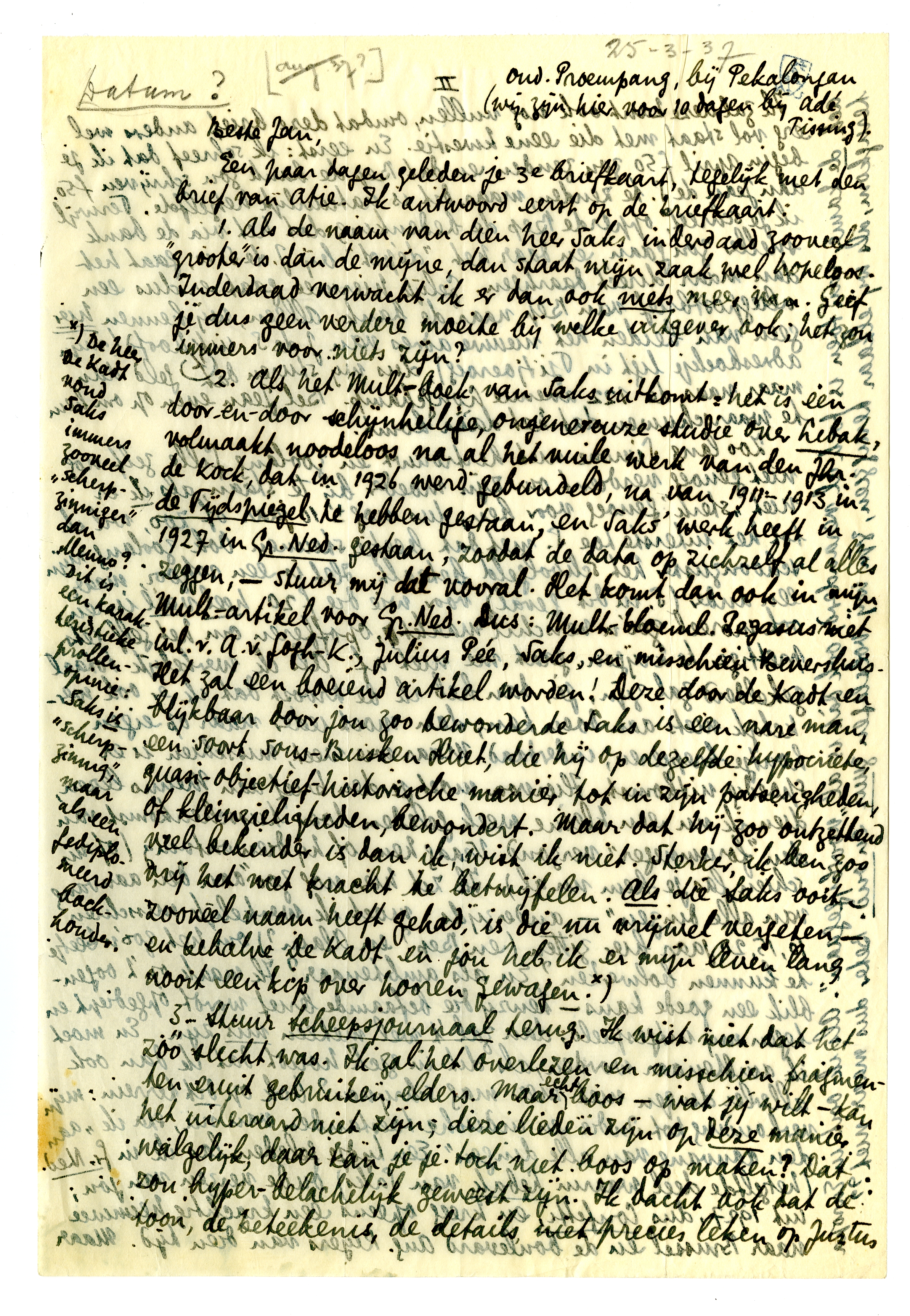 | 2. | Als het Mult.-boek van Saks uitkomt: het is een door-en-door schijnheilige, ongenereuze studie over Lebak, volmaakt noodeloos na al het vuile werk van den Jhr. de Kock, dat in 1926 werd gebundeld, na van 1911-1913 in de Tijdspiegel te hebben gestaan, en Saks' werk heeft in 1927 in Gr. Ned. gestaan, zoodat de data op zichzelf al alles zeggen, - stuur mij dat vooral. Het komt dan ook in mijn Mult.-artikel voor Gr. Ned. dus: Mult.-bloeml. Pegasus met inl. v.A.v. Gogh-K., Julius Pée, Saks, en misschien Beversluis. Het zal een boeiend artikel worden! Deze door de Kadt en blijkbaar door jou zoo bewonderde Saks is een nare man, een soort sous-Busken Huet, die hij op dezelfde hypocriete, quasi-objectief-historische manier tot in zijn patserigheden of kleinzieligheden, bewondert. Maar dat hij zoo ontzettend veel bekender is dan ik, wist ik niet. Sterker, ik ben zoo vrij het met kracht te betwijfelen. Als die Saks ooit zooveel naam heeft gehad, is die nu vrijwel vergeten - en behalve De Kadt en jou heb ik er mijn leven lang nooit een kip over hooren gewagen* |