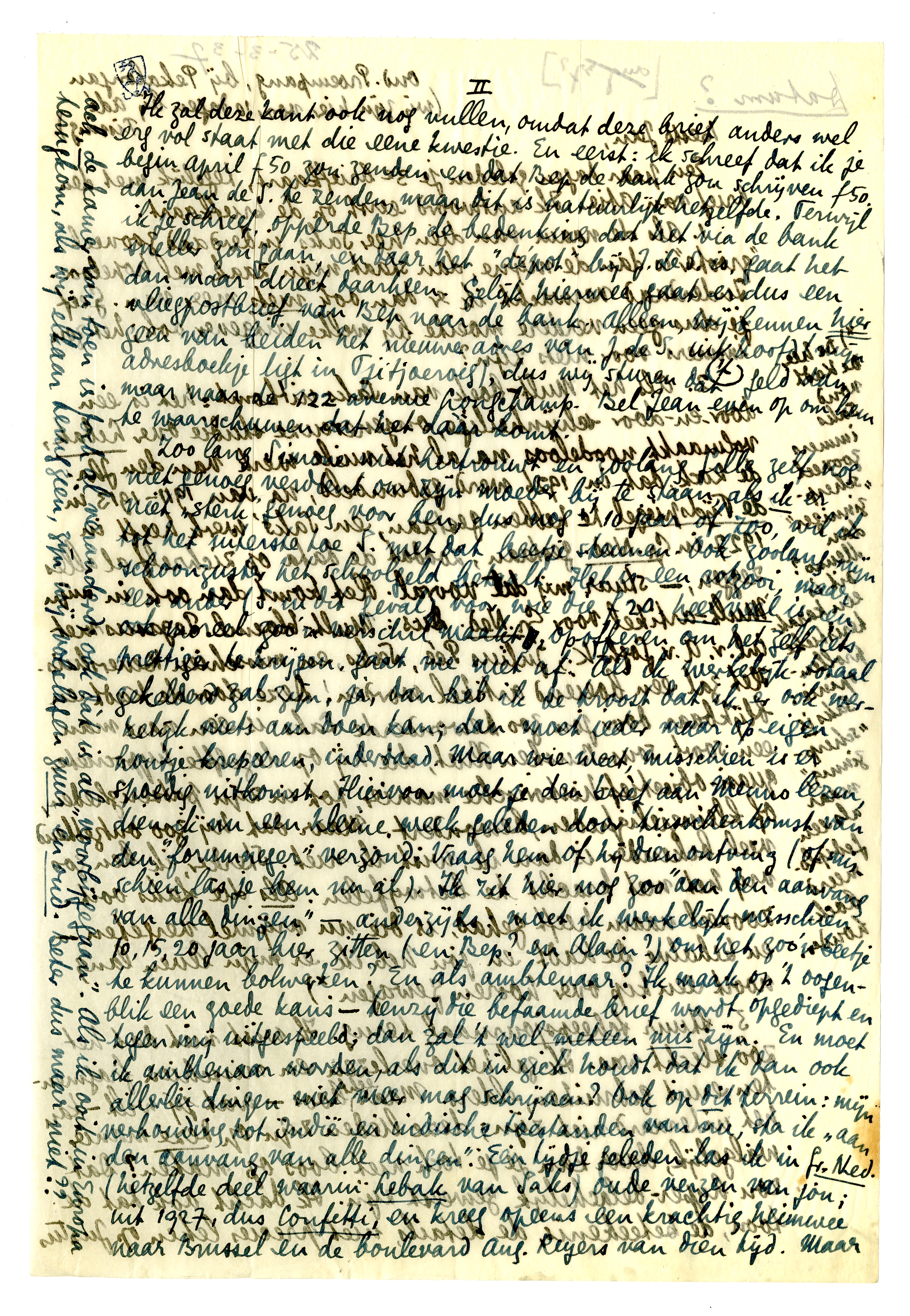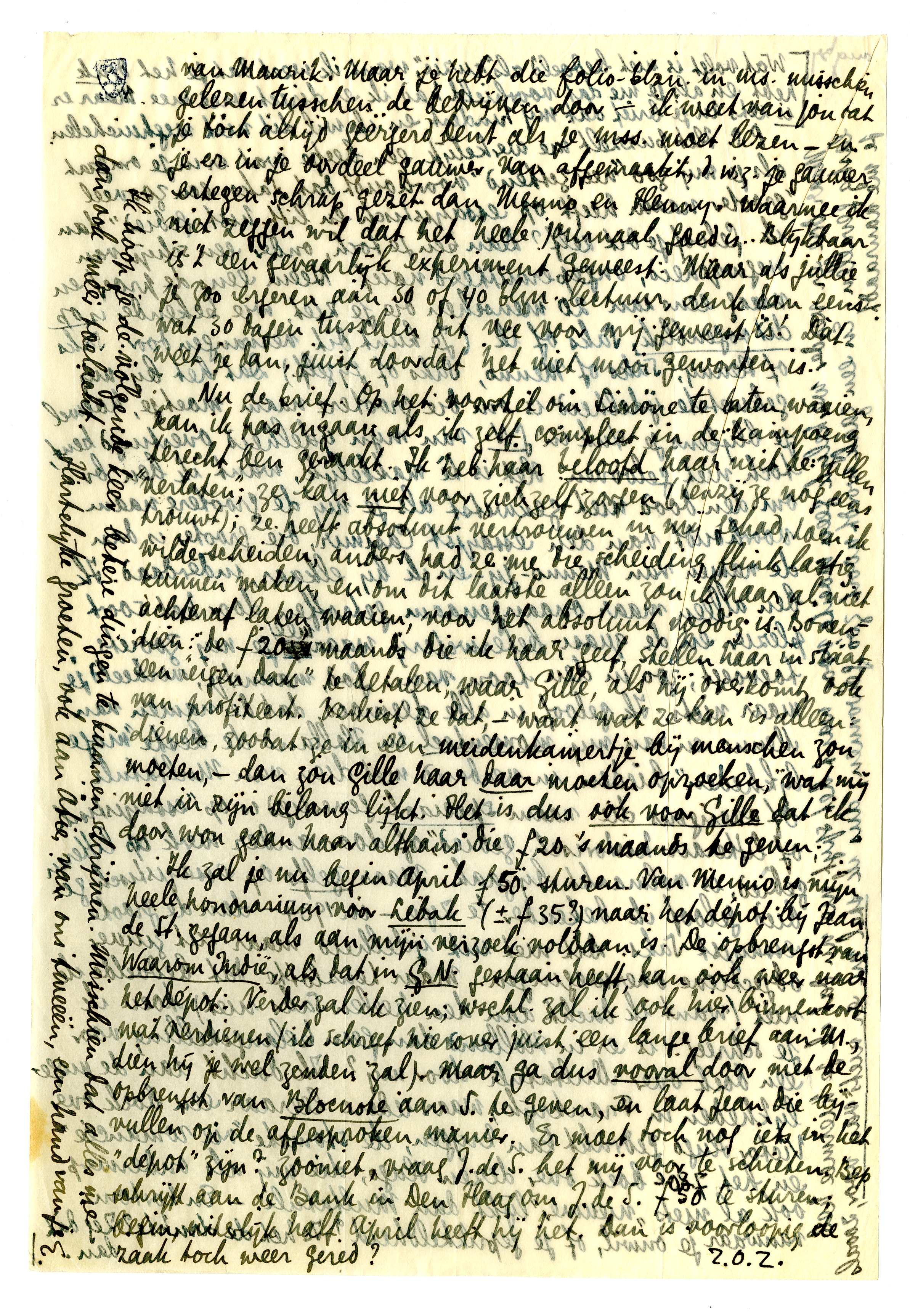 Ik zal je nu begin April f 50. sturen. Van Menno is mijn heele honorarium voor Lebak (± f 35?) naar het dépot bij Jean de St. gegaan, als aan mijn verzoek voldaan is. De opbrengst van Waarom Indië, als dat in G.N. gestaan heeft, kan ook weer naar het dépot. Verder zal ik zien; wschl. zal ik ook hier binnenkort wat verdienen (ik schreef hierover juist een lange brief aan M.,4540 dien hij je wel zenden zal). Maar ga dus vooral door met de opbrengst van Blocnote aan S. te geven, en laat Jean die bijvullen op de afgesproken manier. Er moet toch nog ièts in het ‘dépot’ zijn? Zooniet, vraag J. de S. het mij voor te schieten. Bep schrijft aan de Bank in Den Haag om J. de S. f 50 te sturen; begin, uiterlijk half April heeft hij het. Dan is voorloopig de zaak toch weer gered?