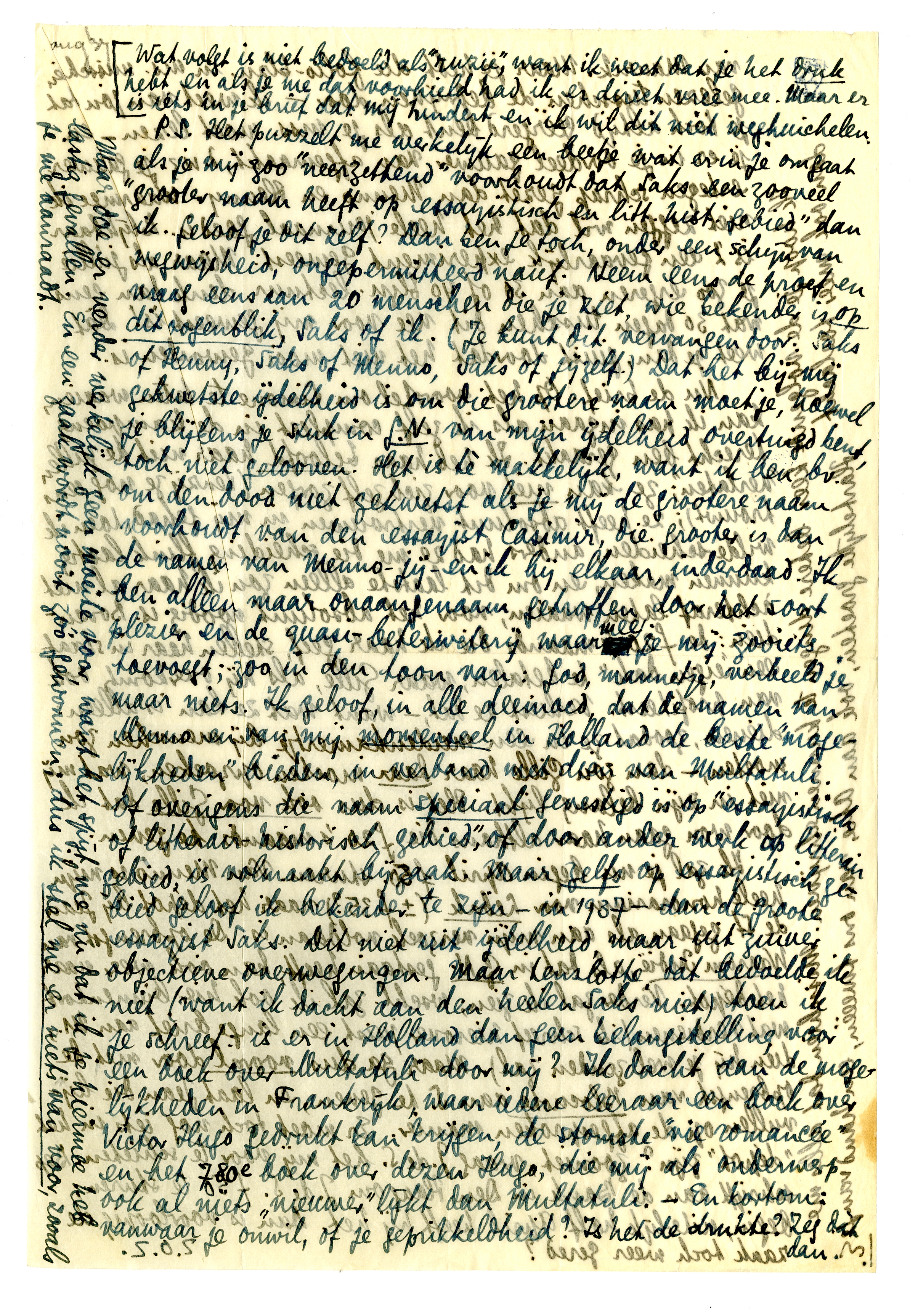 P.S. Het puzzelt me werkelijk een beetje wat er in je omgaat als je mij zoo ‘neerzettend’ voorhoudt dat Saks een zooveel ‘grooter naam heeft op essayistisch en litt. hist. gebied’ dan ik. Geloof je dit zelf? Dan ben je toch, onder een schijn van wegwijsheid, ongepermitteerd naief Neem eens de proef en vraag eens aan 20 menschen die je ziet, wie bekender is op dit oogenblik, Saks of ik. (Je kunt dit vervangen door: Saks of Henny, Saks of Menno, Saks of jijzelf.) Dat het bij mij gekwetste ijdelheid is om die grootere naam moet je, hoewel je blijkens je stuk in G.N. van mijn ijdelheid overtuigd bent, toch niet gelooven. Het is tè makkelijk, want ik ben bv. om den-dood niet gekwetst als je mij de grootere naam voorhoudt van den essayist Casimir,4541 die grooter is dan de namen van Menno-jij-en ik bij elkaar, inderdaad. Ik ben alleen maar onaangenaam getroffen door het soort plezier en de quasi-beterweterij waarmee je mij zooiets toevoegt; zoo in den toon van: God, mannetje, verbeeld je maar niets. Ik geloof, in alle deemoed, dat de namen van Menno en van mij momenteel in Holland de beste ‘mogelijkheden’ bieden, in verband met dien van Multatuli. Of overigens die naam speciaal gevestigd is op ‘essayistisch of litterair-historisch gebied’, of door ander werk op litterair gebied, is volmaakt bijzaak. Maar zelfs op essayistisch gebied geloof ik bekender te zijn - in 1937 - dan de groote essayist Saks. Dit niet uit ijdelheid, maar uit zuiver objectieve overwegingen. Maar tenslotte, dàt bedoelde ik niet (want ik dacht aan den heelen Saks niet) toen ik je schreef: is er in Holland dan geen belangstelling voor een boek over Multatuli door mij? Ik dacht aan de mogelijkheden in Frankrijk, waar iedere leeraar een boek over Victor Hugo gedrukt kan krijgen, de stomste ‘vie romancée’ en het 780e boek over dezen Hugo, die mij als onderwerp ook al niets ‘nieuwer’ lijkt dan Multatuli. - En kortom: vanwaar je onwil, of je geprikkeldheid? Is het de drukte? Zeg dàt dan. Maar doe er verder werkelijk geen moeite voor, want het spijt me nu dat ik je hiermee heb lastig gevallen. En een zaak wordt nooit zóógewonnen; dus ik stel me er niets van voor, zooals je me aanraadt.