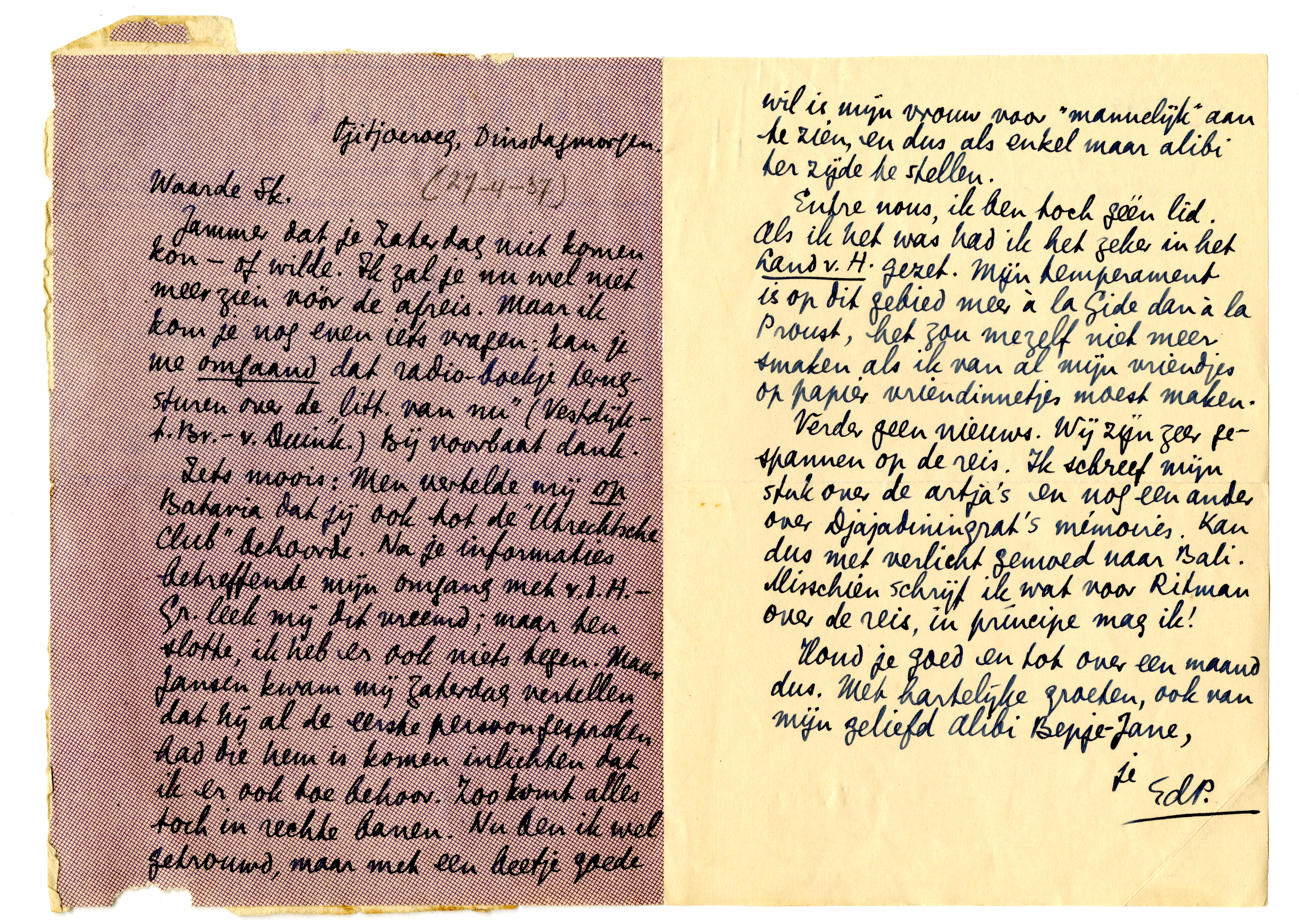 Iets moois: Men vertelde mij op Batavia dat jij ook tot de ‘Utrechtsche Club’4609 behoorde. Na je informaties betreffende mijn omgang met v.d.H.-Gr. leek mij dit vreemd; maar ten slotte, ik heb er ook niets tegen. Maar Jansen kwam mij Zaterdag vertellen dat hij al de eerste persoon gesproken had die hem is komen inlichten dat ik er ook toe behoor. Zoo komt alles toch in rechte banen. Nu ben ik wel getrouwd, maar met een beetje goede wil is mijn vrouw voor ‘mannelijk’ aan te zien, en dus als enkel maar alibi terzijde te stellen.