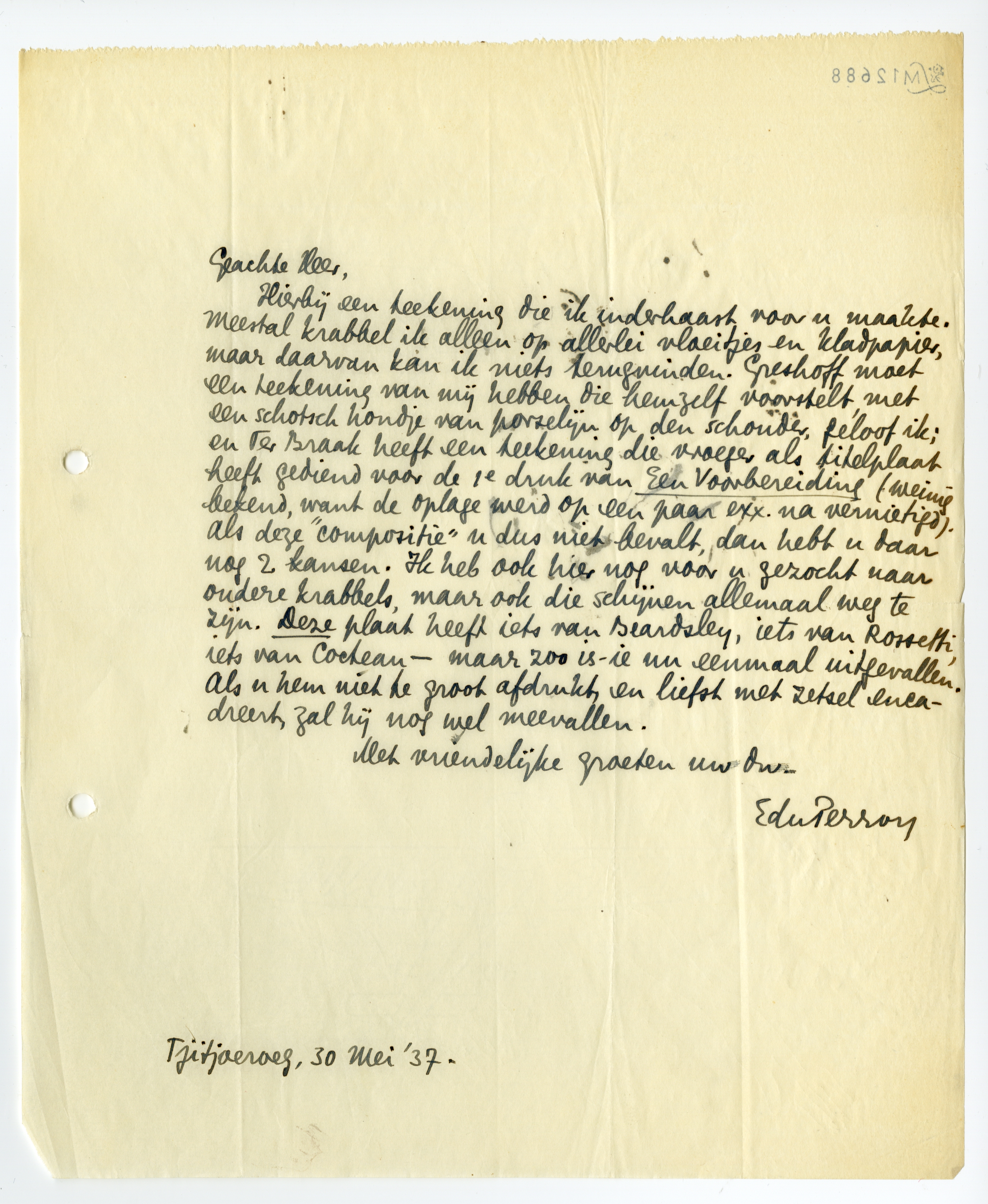 Hierbij een teekening die ik inderhaast voor u maakte. Meestal krabbel ik alleen op allerlei vloeitjes en kladpapier, maar daarvan kan ik niets terugvinden. Greshoff moet een teekening van mij hebben die hemzelf voorstelt, met een schotsch hondje van porselijn op den schouder, geloof ik4656; en Ter Braak heeft een teekening die vroeger als titelplaat heeft gediend voor de 1e druk van Een Voorbereiding (weinig bekend, want de oplage werd op een paar exx. na vernie-tigd). Als deze ‘compositie’ u dus niet bevalt, dan hebt u daar nog 2 kansen. Ik heb ook hier nog voor u gezocht naar oudere krabbels, maar ook die schijnen allemaal weg te zijn. Deze plaat heeft iets van Beardsley, iets van Rossetti, iets van Cocteau - maar zoo is-ie nu eenmaal uitgevallen. Als u hem niet te groot afdrukt, en liefst met zetsel encadreert, zal hij nog wel meevallen.