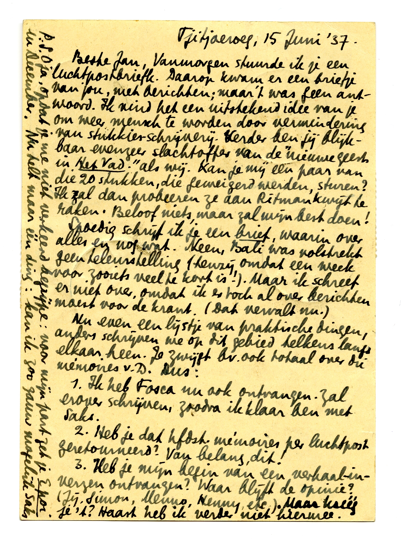 Beste Jan, Vanmorgen stuurde ik je een luchtpostbriefk. Daarop kwam er een briefje van jou, met berichten; maar 't was geen antwoord. Ik vind het een uitstekend idee van je om weer mensch te worden door vermindering van stukkies-schrijverij. Verder ben jij blijkbaar evenzeer slachtoffer van de ‘nieuwe geest in Het Vad.’ als wij. Kan je mij een paar van die 20 stukken, die geweigerd werden, sturen? Ik zal dan probeeren ze aan Ritman kwijt te raken. Beloof niets, maar zal mijn best doen!