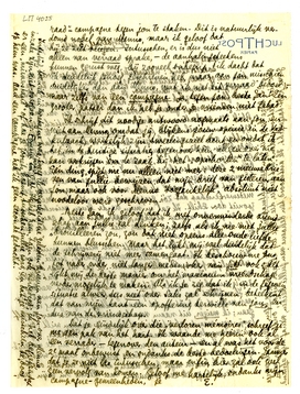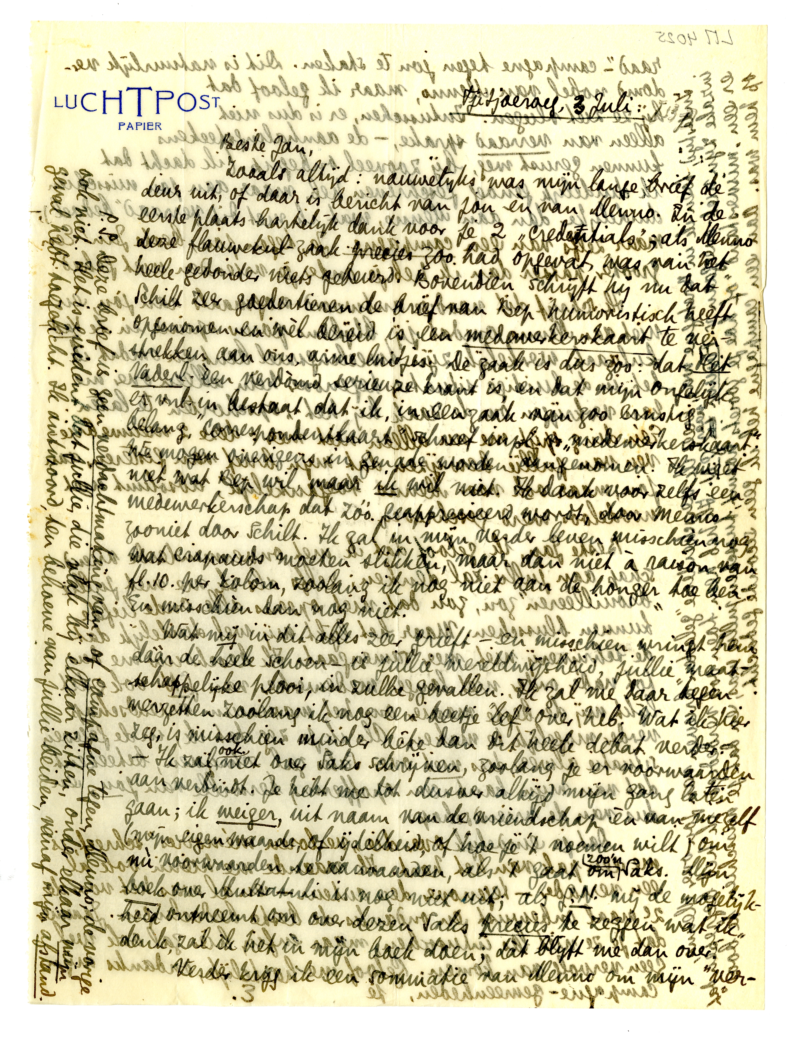 Zooals altijd: nauwelijks was mijn lange brief de deur uit, of daar is bericht van jou èn van Menno.4725 In de eerste plaats hartelijk dank voor je 2 ‘credentials’; als Menno deze flauwekul-zaak precies zoo had opgevat, was van het heele gedonder niets gebeurd. Bovendien schrijft hij nu dat Schilt zeer goedertieren de brief van Bep humoristisch heeft opgenomen en wèl bereid is een medewerkerskaart te verstrekken aan ons, arme luitjes. De zaak is dus zoo: dat Het Vaderl. een verdòmd serieuze krant is en dat mijn ongelijk er vnl. in bestaat dat ik, in een zaak van zoo ernstig belang, ‘correspondentkaart’ schreef inpl. v. ‘medewerkerskaart’. We mogen overigens in genade worden aangenomen. Ik weet niet wat Bep wil, maar ik wil niet. Ik dank voor zelfs een medewerkerschap dat zóó geapprecieerd wordt, door Menno zooniet door Schilt. Ik zal in mijn verder leven misschien nog wat crapauds moeten slikken, maar dan niet à raison van fl. 10. per kolom, zoolang ik nog niet aan de honger toe ben. En misschien dan nog niet.