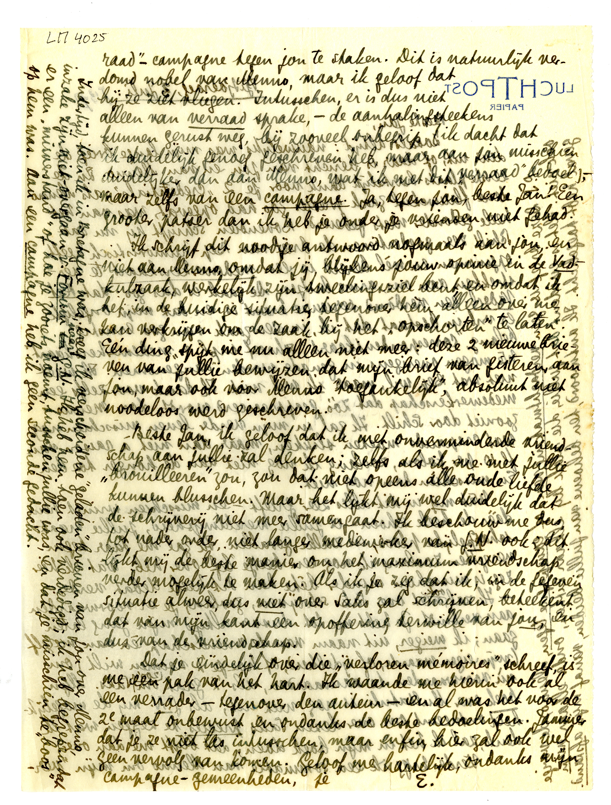 Dat je eindelijk over de ‘verloren mémoires’ schreef, is me een pak van het hart. Ik waande me hierin ook al een verrader - tegenover den auteur - en al was het voor de 2e maal onbewust en ondanks de beste bedoelingen. Jammer dat je ze niet las intusschen, maar enfin, hier zal ook wel geen vervolg van komen. Geloof me hartelijk, ondanks mijn campagne-gemeenheden. Je E.