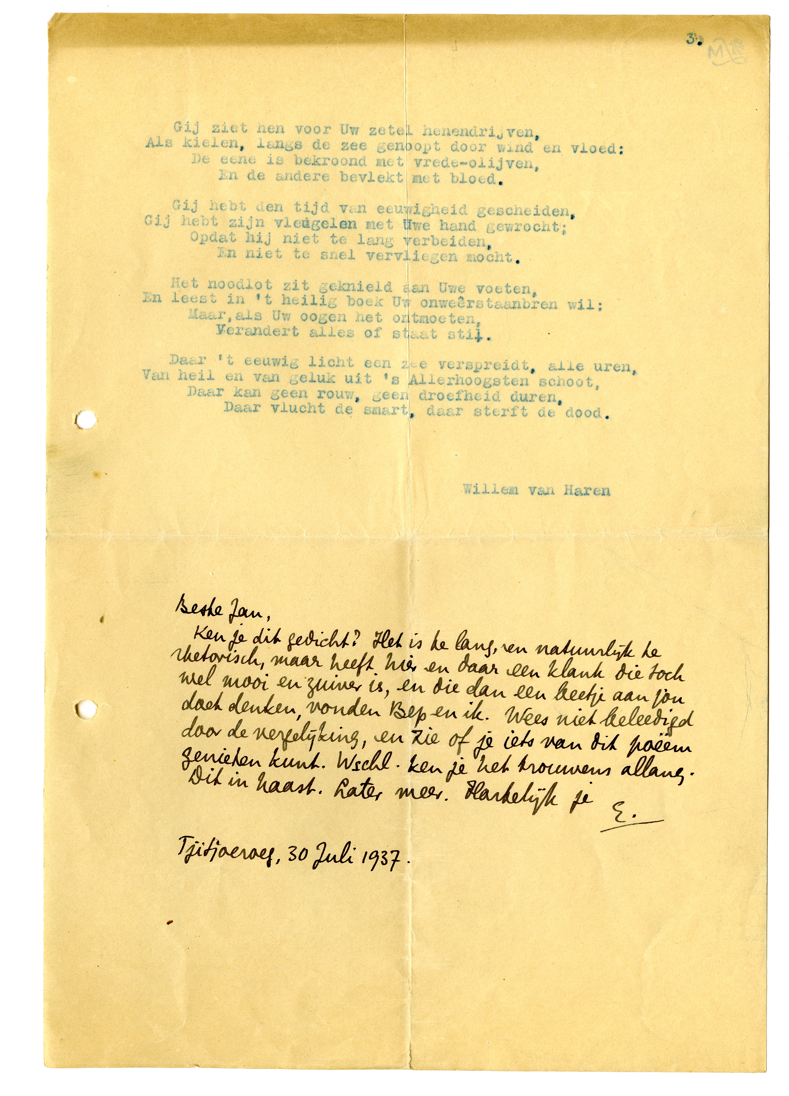 Ken je dit gedicht? Het is te lang, en natuurlijk te rhetorisch, maar heeft hier en daar een klank die toch wel mooi en zuiver is, en die dan een beetje aan jou doet denken, vonden Bep en ik. Wees niet beleedigd door de vergelijking, en zie of je iets van dit poëem genieten kunt. Wschl. ken je het trouwens allang. Dit in haast. Later meer. Hartelijk je