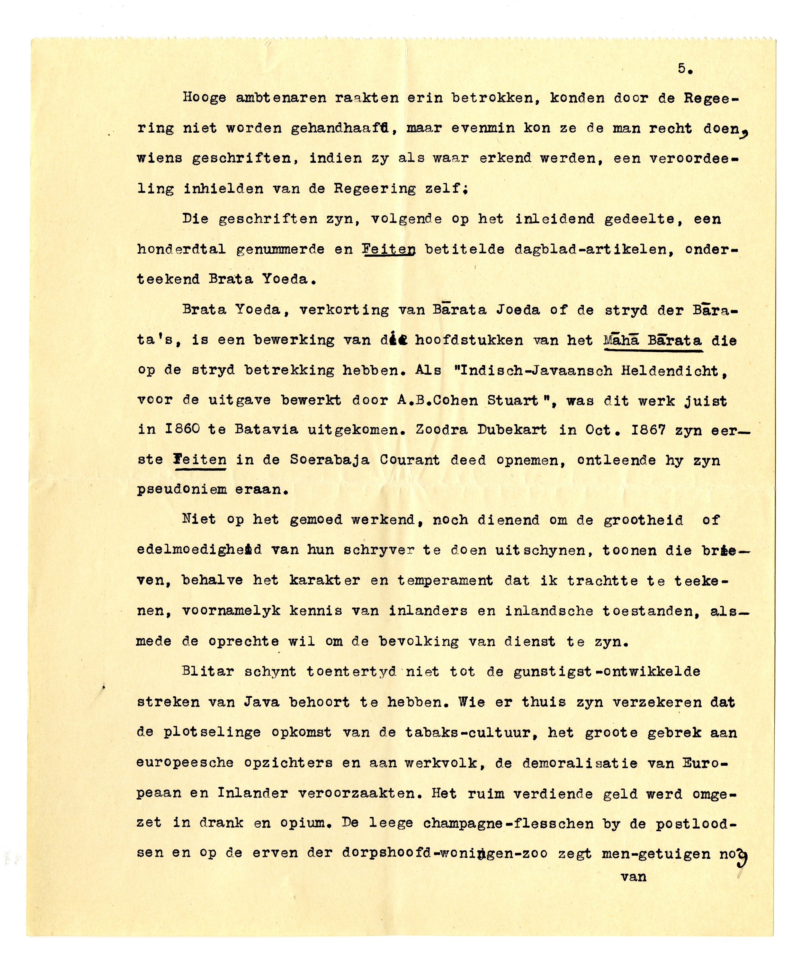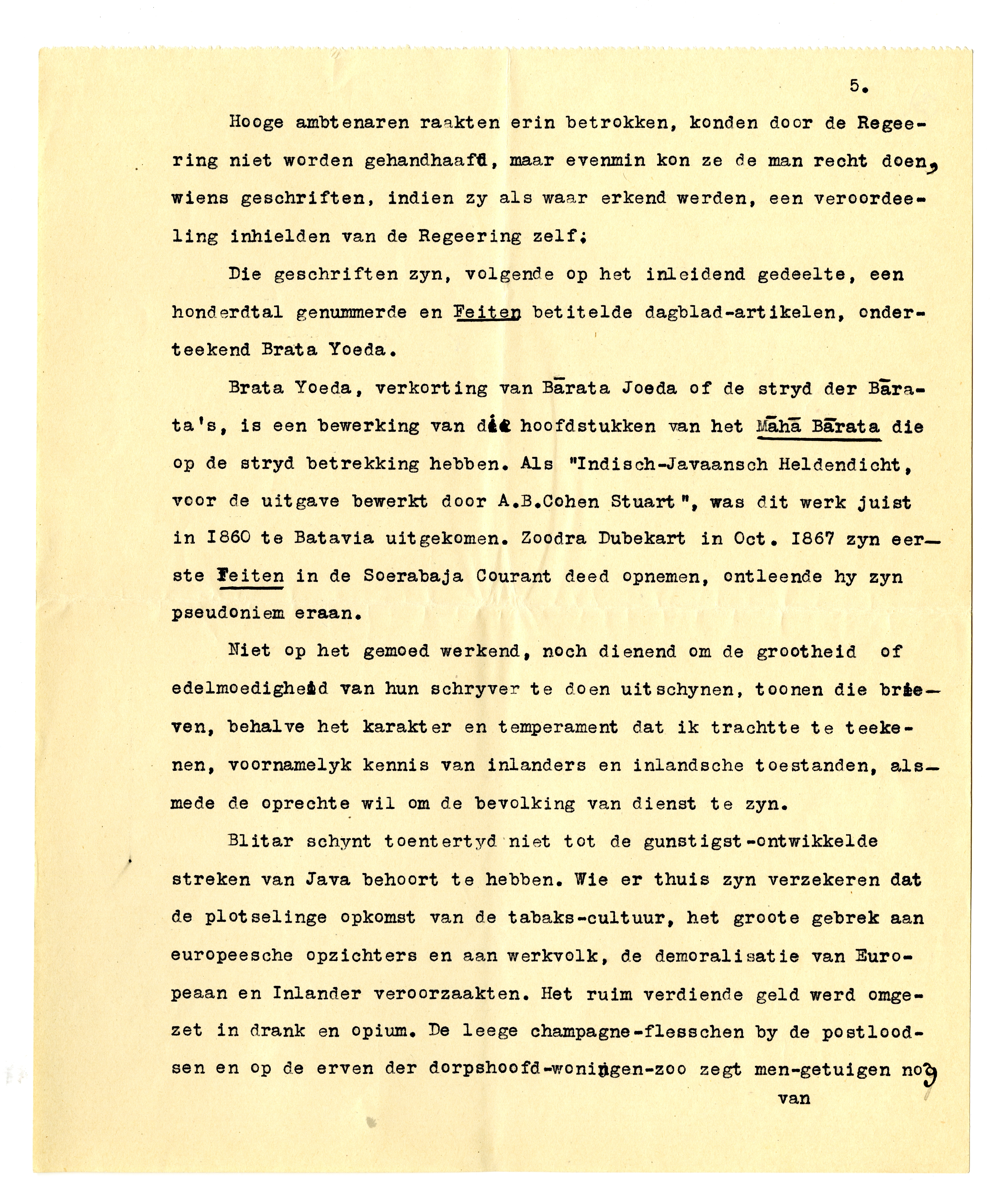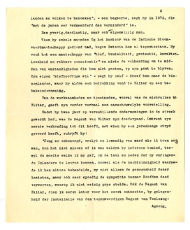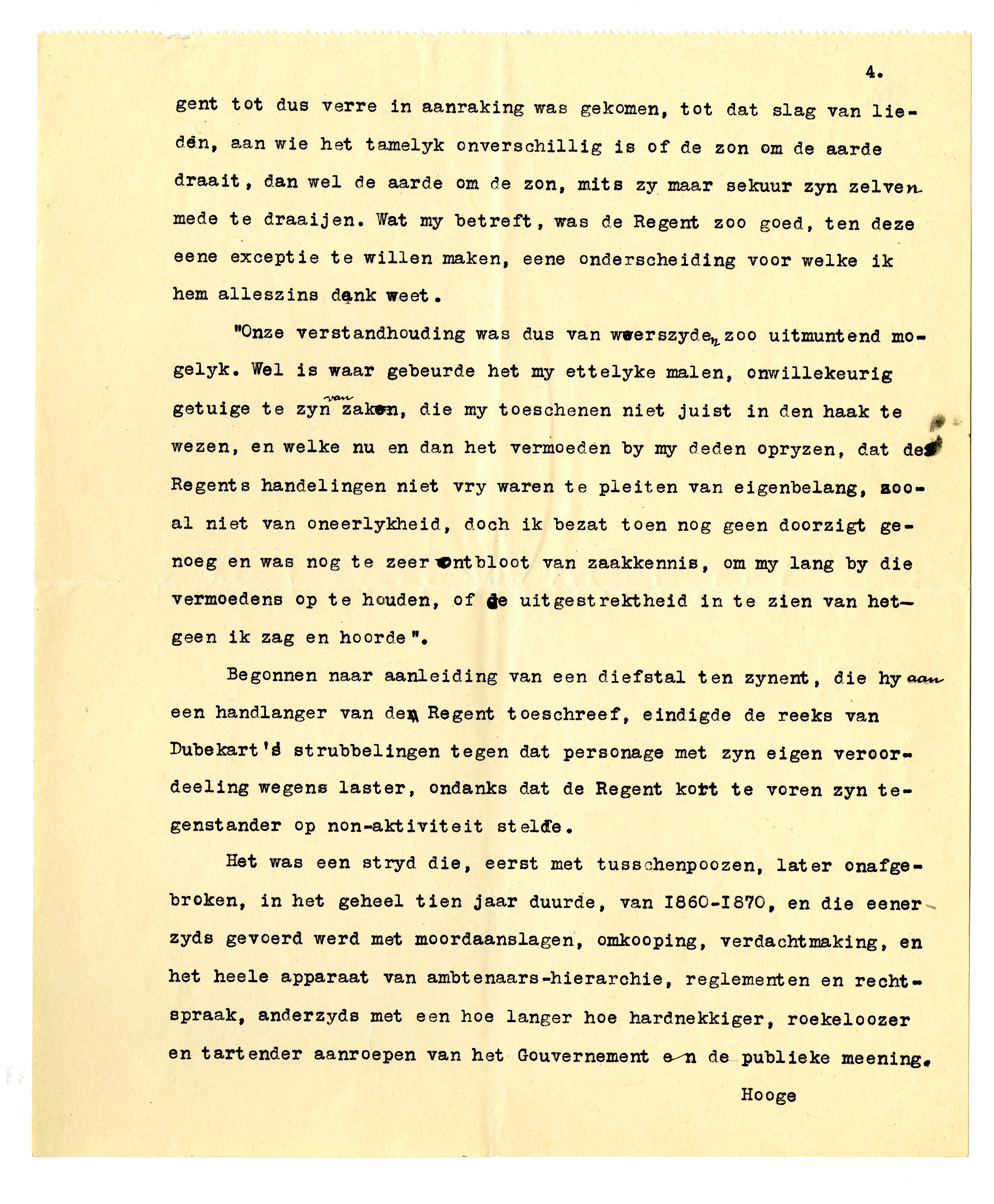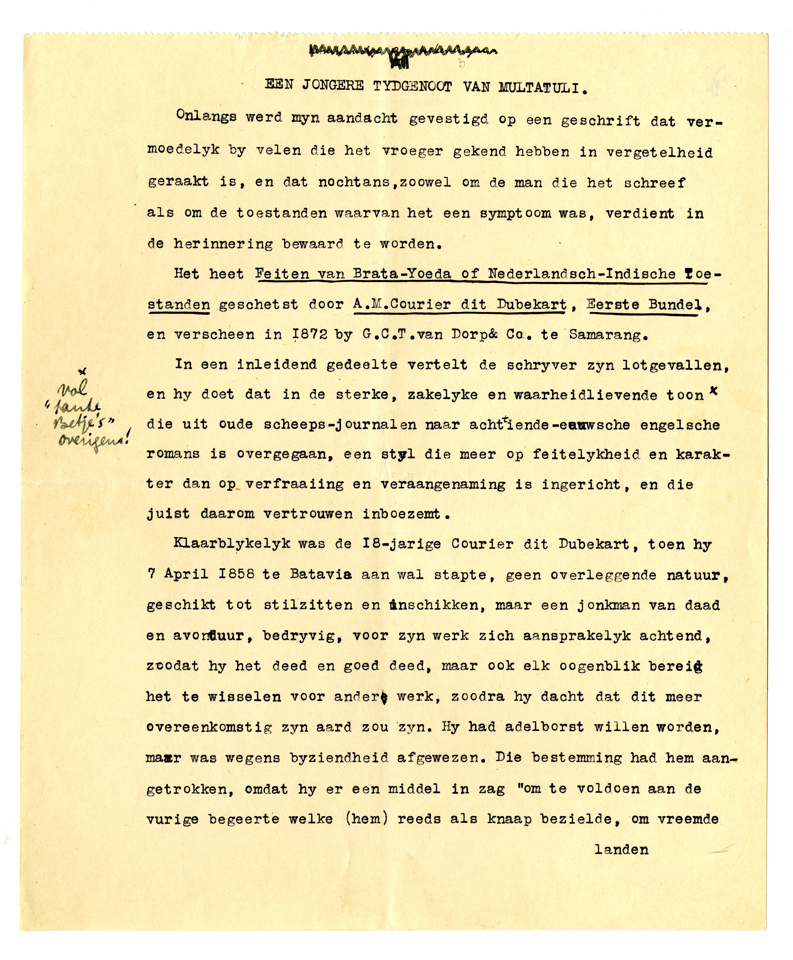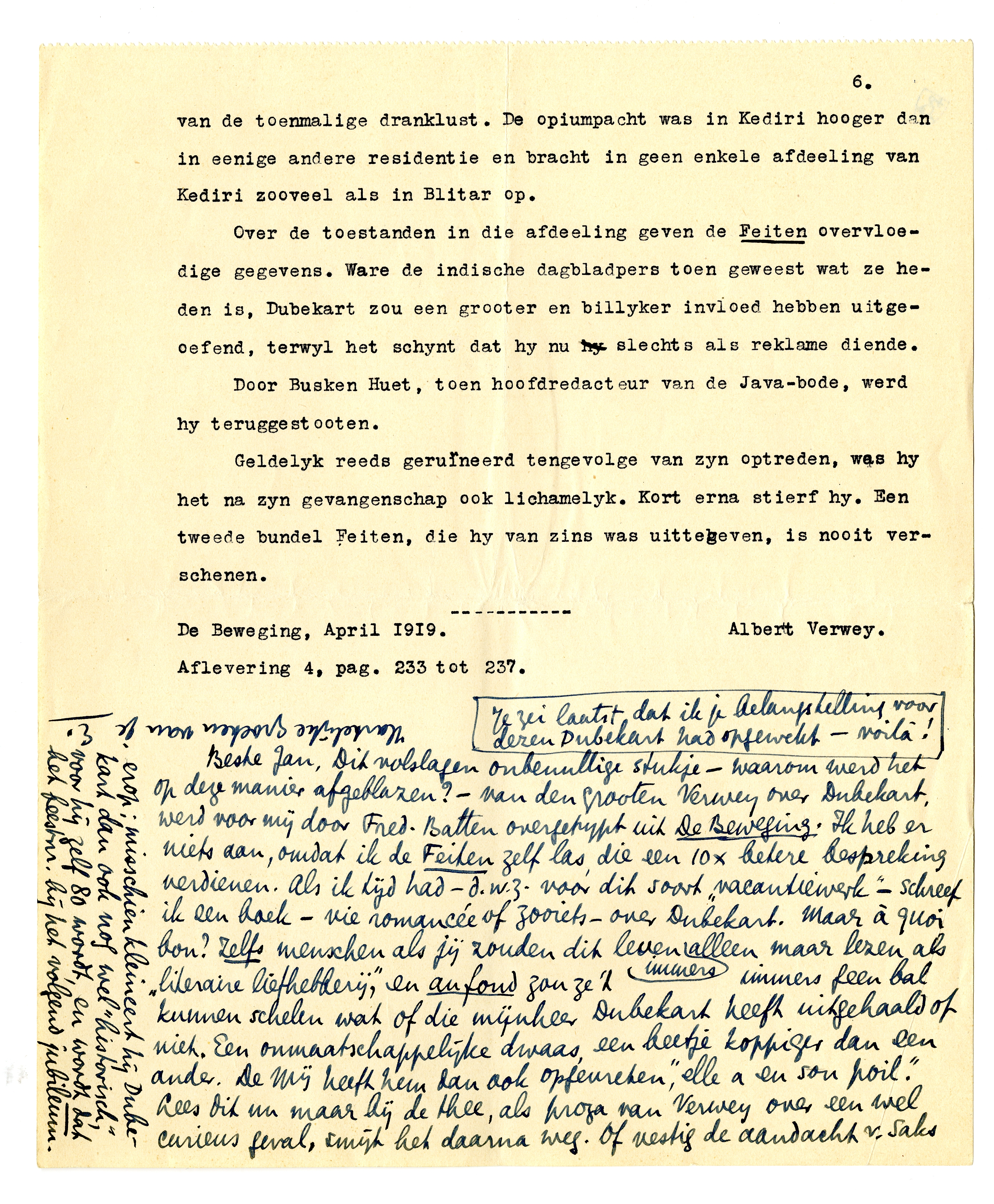Beste Jan, Dit volslagen onbenullige stukje - waarom werd het op deze manier afgeblazen? - van den grooten Verwey over Dubekart, werd voor mij door Fred. Batten overgetypt uit De Beweging. Ik heb er niets aan, omdat ik de Feiten zelf las, die een 10 × betere bespreking verdienen. Als ik tijd had - d.w.z. voor dit soort ‘vacantiewerk’ - schreef ik een boek - vie romancée of zooiets - over Dubekart. Maar à quoi bon? Zelfs menschen als jij zouden dit leven immers alleen maar lezen als ‘literaire liefhebberij’, en au fond zou ze 't immers geen bal kunnen schelen wat of die mijnheer Dubekart heeft uitgehaald of niet. Een onmaatschappelijke dwaas, een beetje koppiger dan een ander. De Mij heeft hem dan ook opgevreten, ‘elle a eu son poil’. Lees dit maar bij de thee, als proza van Verwey over een wel curieus geval, smijt het daarna weg. Of vestig de aandacht v. Saks erop; misschien kleineert hij Dubekart dan ook nog wel ‘historisch’, voor hij zelf 80 wordt, en wordt dat het [...]4793 bij het volgend jubileum.