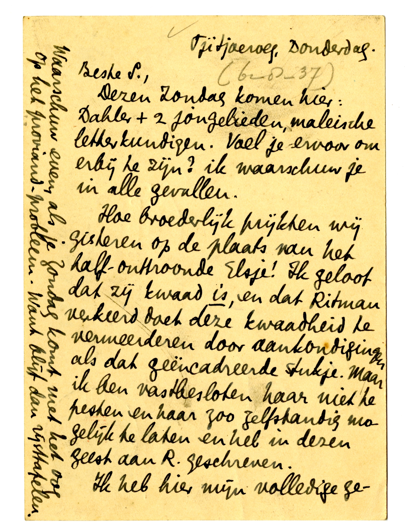 Hoe broederlijk prijkten wij gisteren op de plaats van het halfonttroonde Elsje! Ik geloof dat zij kwaad is, en dat Ritman verkeerd doet deze kwaadheid te vermeerderen door aankondigingen als dat geëncadreerde stukje.4800 Maar ik ben vastbesloten haar niet te pesten en haar zoo zelfstandig mogelijk te laten en heb in dezen geest aan R. geschreven.