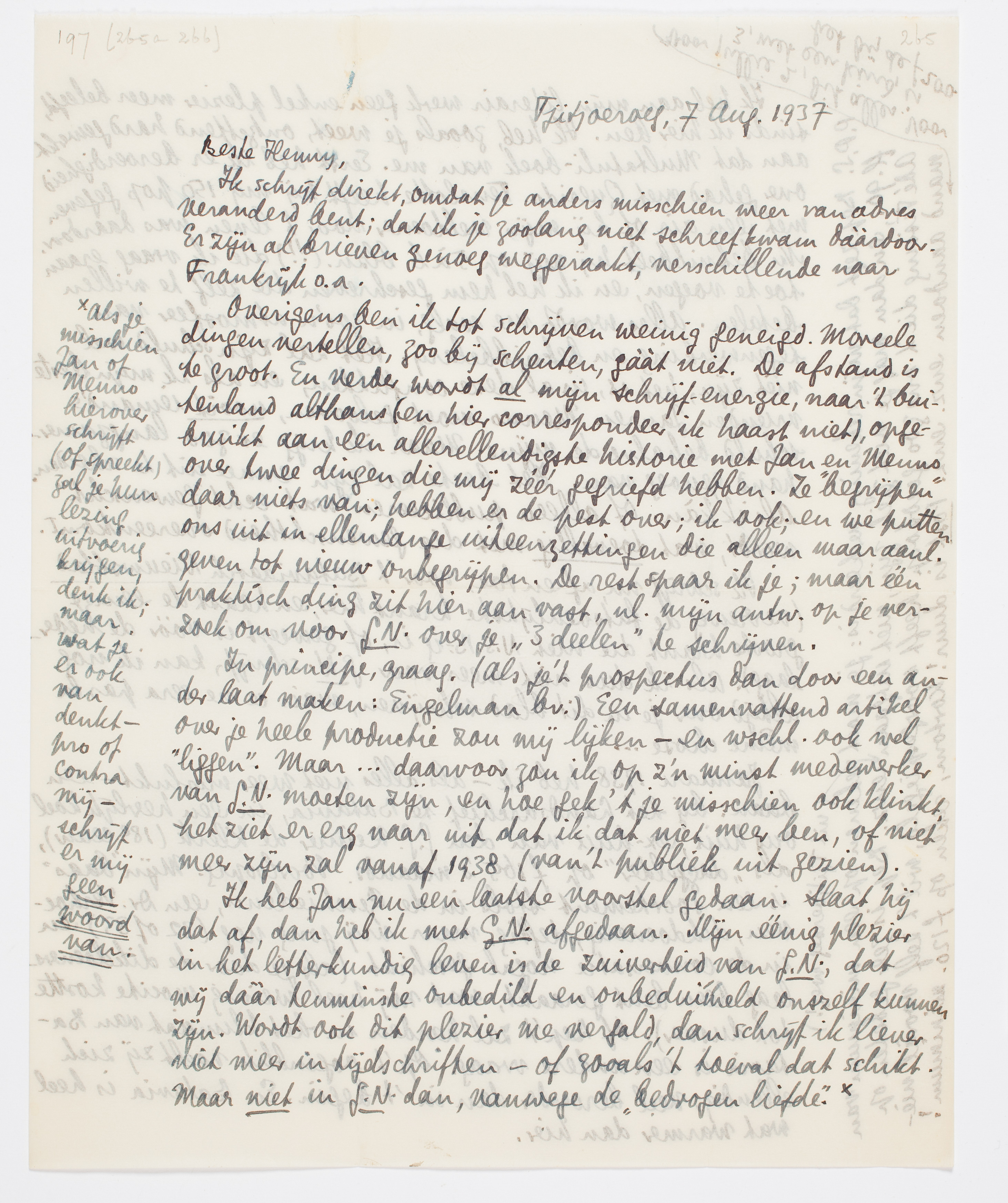 Overigens ben ik tot schrijven weinig geneigd. Moreele dingen vertellen, zoo bij scheuten, gààt niet. De afstand is te groot. En verder wordt al mijn schrijf-energie, naar 't buitenland althans (en hier correspondeer ik haast niet), opgebruikt aan een allerellendigste historie met Jan en Menno over twee dingen die mij zéér gegriefd hebben. Ze ‘begrijpen’ daar niets van; hebben er de pest over; ik ook; en we putten ons uit in ellenlange uiteenzettingen die alleen maar aanl. geven tot nieuw onbegrijpen. De rest spaar ik je; maar één praktisch ding zit hier aan vast, nl. mijn antw. op je verzoek om voor G.N. over je ‘3 deelen’ te schrijven.