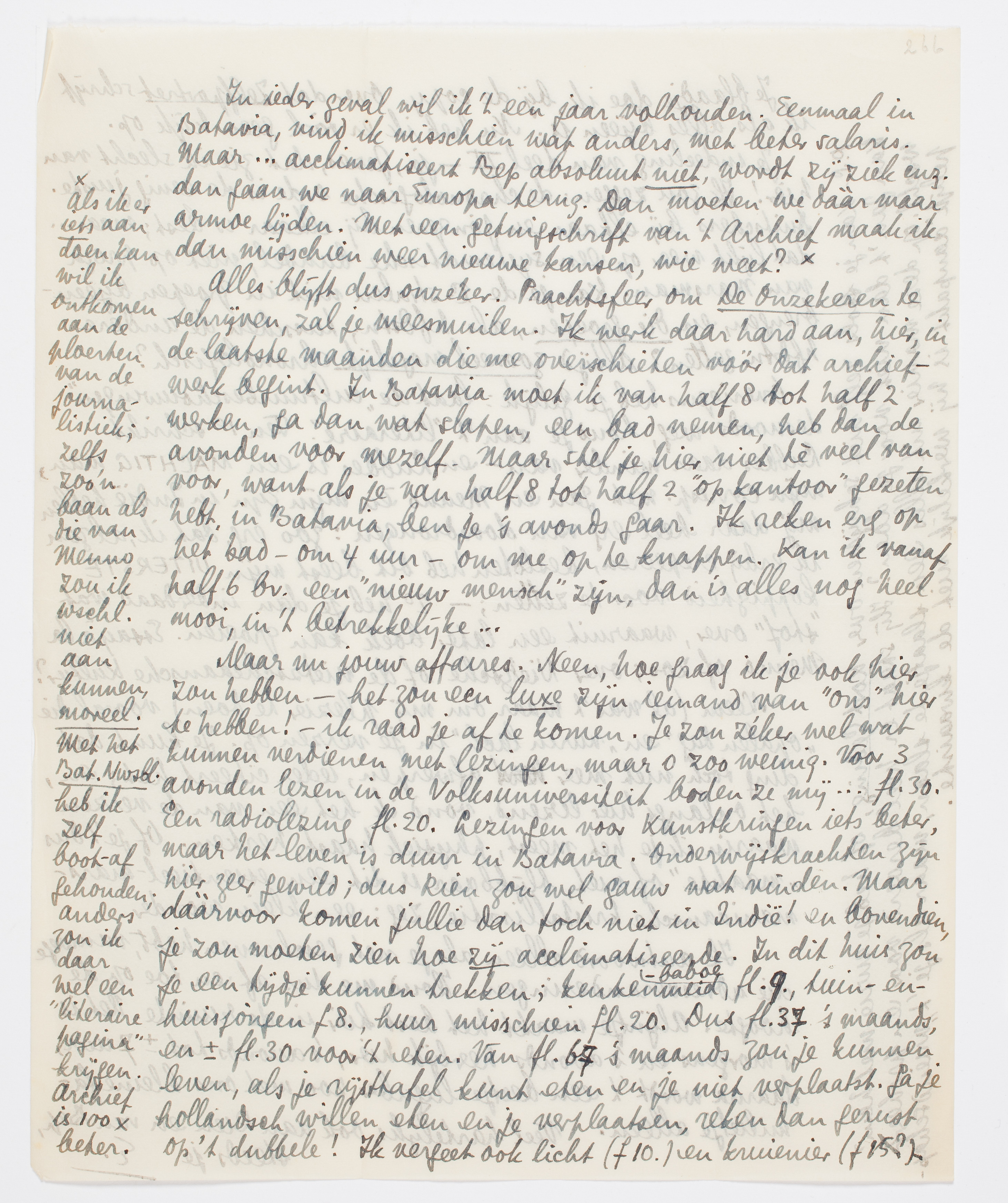 Maar nu jouw affaires. Neen, hoe graag ik je ook hier zou hebben - het zou een luxe zijn iemand van ‘ons’ hier te hebben! - ik raad je af te komen. Je zou zéker wel wat kunnen verdienen met lezingen, maar o zoo weinig. Voor 3 avonden lezen in de Volksuniversiteit boden ze mij... fl. 30. Een radiolezing fl. 20. Lezingen voor Kunstkringen iets beter, maar het leven is duur in Batavia. Onderwijskrachten zijn hier zeer gewild; dus Rien zou wel gauw wat vinden. Maar dààrvoor komen jullie dan toch niet in Indië! en bovendien, je zou moeten zien hoe zij acclimatiseerde. In dit huis zou je een tijdje kunnen trekken; keukenmeid-baboe fl. 9., tuin-en-huisjongen f 8., huur misschien fl. 20. Dus fl. 37 's maands, en ± fl. 30 voor 't eten. Van fl. 67 's maands zou je kunnen leven, als je rijsttafel kunt eten en je niet verplaatst. Ga je hollandsch willen eten en je verplaatsen, reken dan gerust op 't dubbele! Ik vergeet ook licht (f 10.) en kruienier (f 15?).