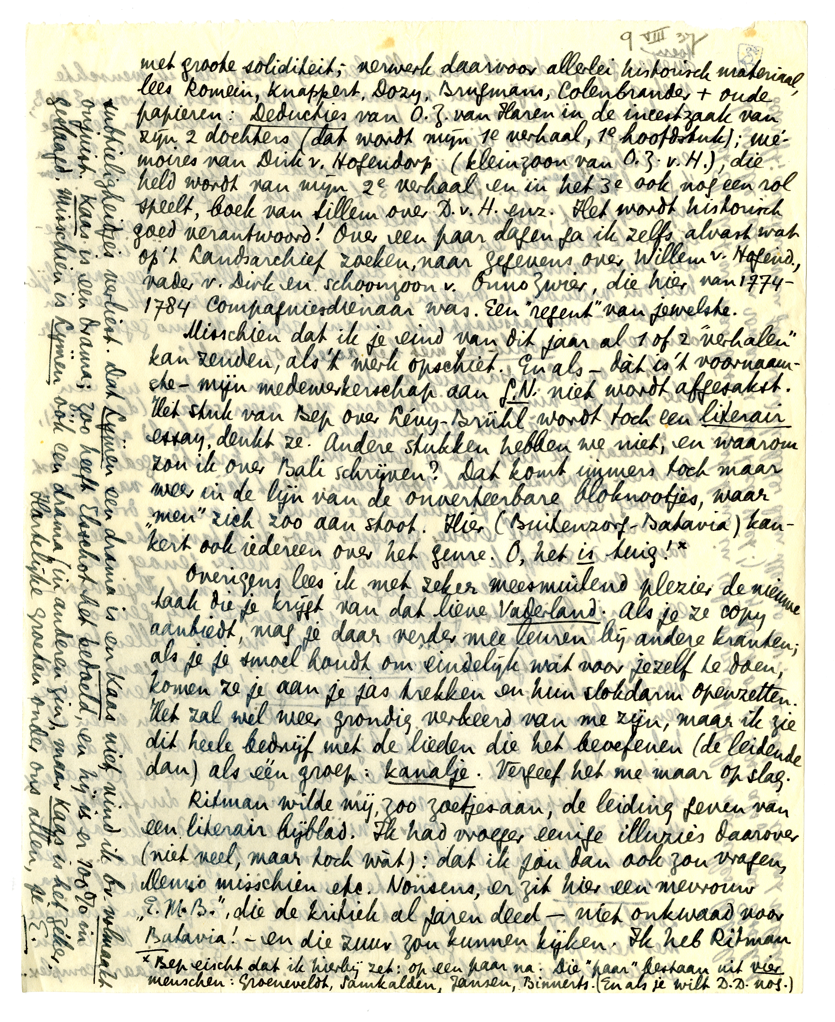 Je ziet dat ik eig. niets doe dan werken. Sinds eenigen tijd vrij hard zelfs. Ik leg de fundamenten voor De Onzekeren met groote soliditeit; verwerk daarvoor allerlei historisch materiaal, lees Romein, Knappert, Dozy, Brugmans, Colenbrander + oude papieren: Deducties van O.Z. van Haren in de incestzaak van zijn 2 dochters (dat wordt mijn 1e verhaal, 1e hoofdstuk); mémoires van Dirk v. Hogendorp (kleinzoon van O.Z.v.H), die held wordt van mijn 2e verhaal en in het 3e ook nog een rol speelt, boek van Sillem over D.V.H. enz. Het wordt historisch goed verantwoord! Over een paar dagen ga ik zelfs alvast wat op 't Landsarchief zoeken, naar gegevens over Willem v. Hogend., vader v. Dirk en schoonzoon v. Onno Zwier, die hier van 1774-1784 compagniesdienaar was. Een ‘regent’ van jewelste.