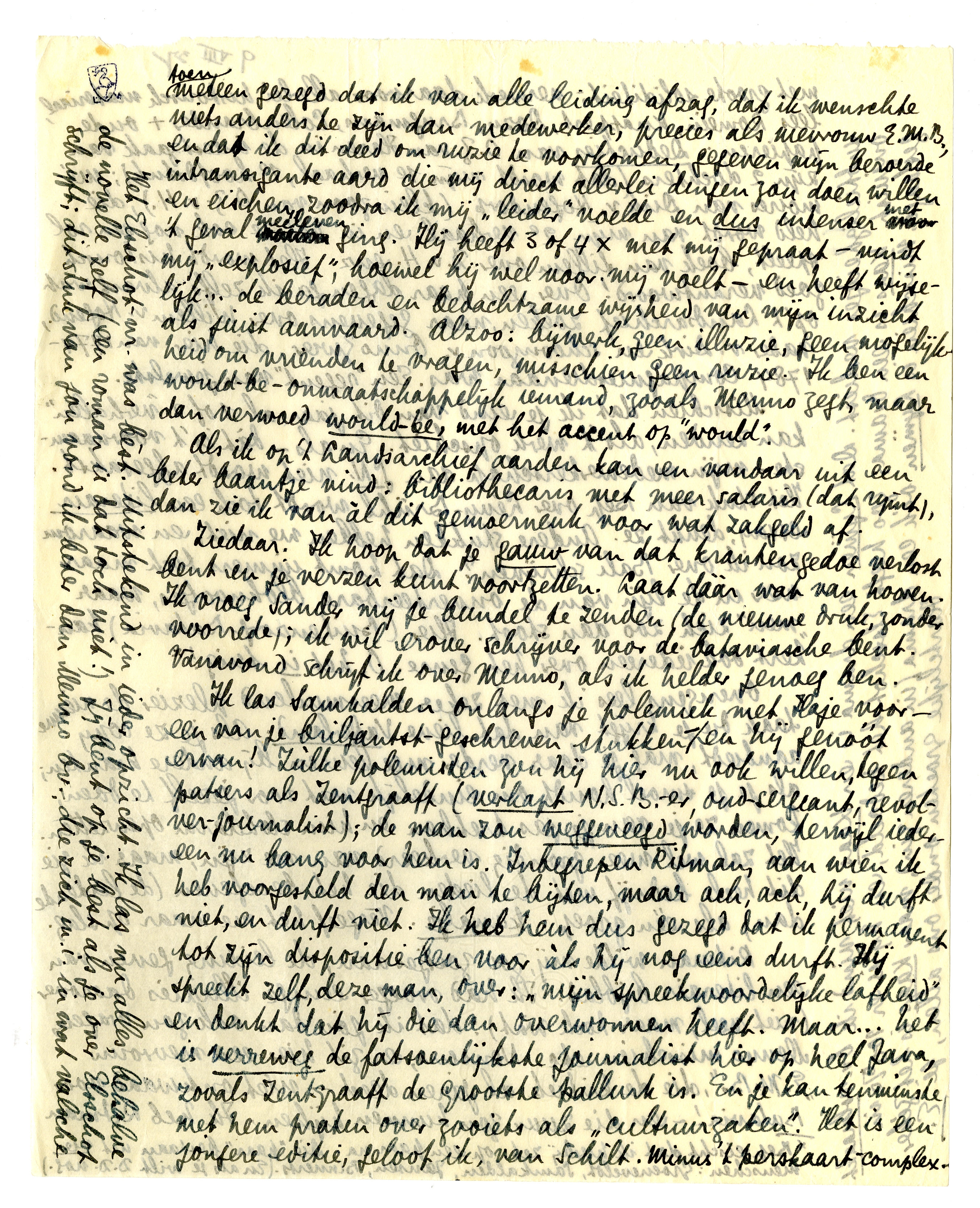 Misschien dat ik je eind van dit jaar al 1 of 2 ‘verhalen’ kan zenden, als 't werk opschiet. En als - dàt is 't voornaamste - mijn medewerkerschap aan G.N. niet wordt afgesakst. Het stuk van Bep over Lévy-Brühl4816 wordt toch een literair essay, denkt ze. Andere stukken hebben we niet, en waarom zou ik over Bali schrijven? Dat komt immers toch maar weer in de lijn van de onverteerbare bloknootjes, waar ‘men’ zich zoo aan stoot. Hier (Buitenzorg-Batavia) kankert ook iedereen over het genre. O, het is tuig!*