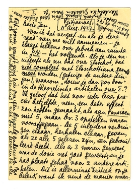 Ik geloof dat het voor ieder lezer precies hetzelfde, neen, een beter effect zou hebben gemaakt, als aan Pensioen niet 5, maar bv. 3 opstellen waren voorafgegaan. De 5 inleiders verdringen elkaar, herhalen elkaar, geven, als ze alle 5 gelezen zijn, een gebrouileerd beeld. Als er 3 waren geweest, was de dosis net goed geweest; en je had plaats gehad voor 2 andere artikelen. Dit is allerminst ‘kritiek op je beleid’, want ik vind de manier waarop je G.N. bestuurt quasi-volmaakt, maar een hint. Ik voor mij zou van de 5 artikelen genomen hebben: Greshoff, Vestdijk, Schepens; en Ter Braak en Paul de Vree hebben laten vervallen. (Schepens en De Vree loopen elkaar telkens in den weg; Menno is hier zeer matigjes in geweest, vind ik.) Bestèl niet zooveel!