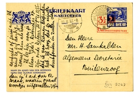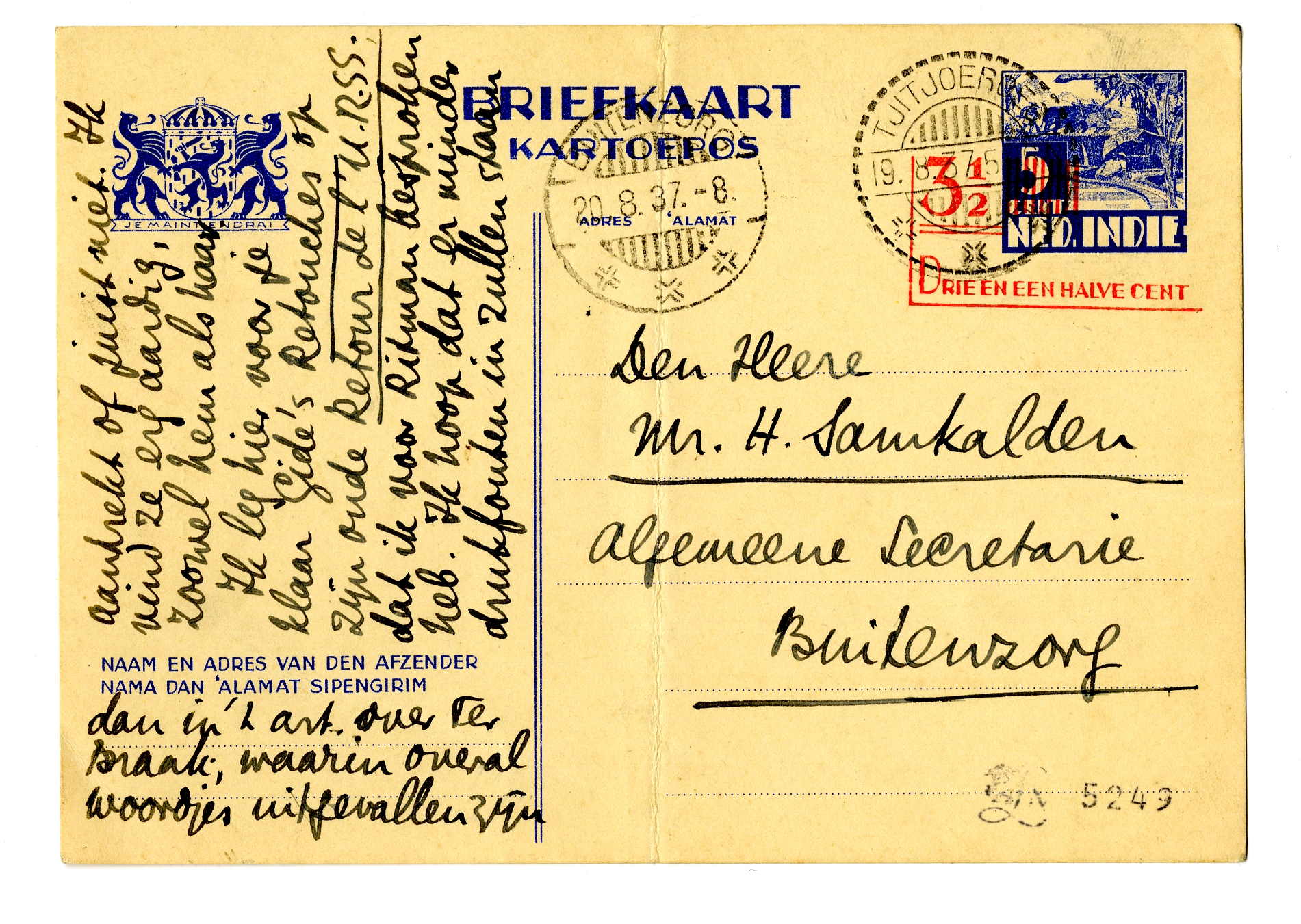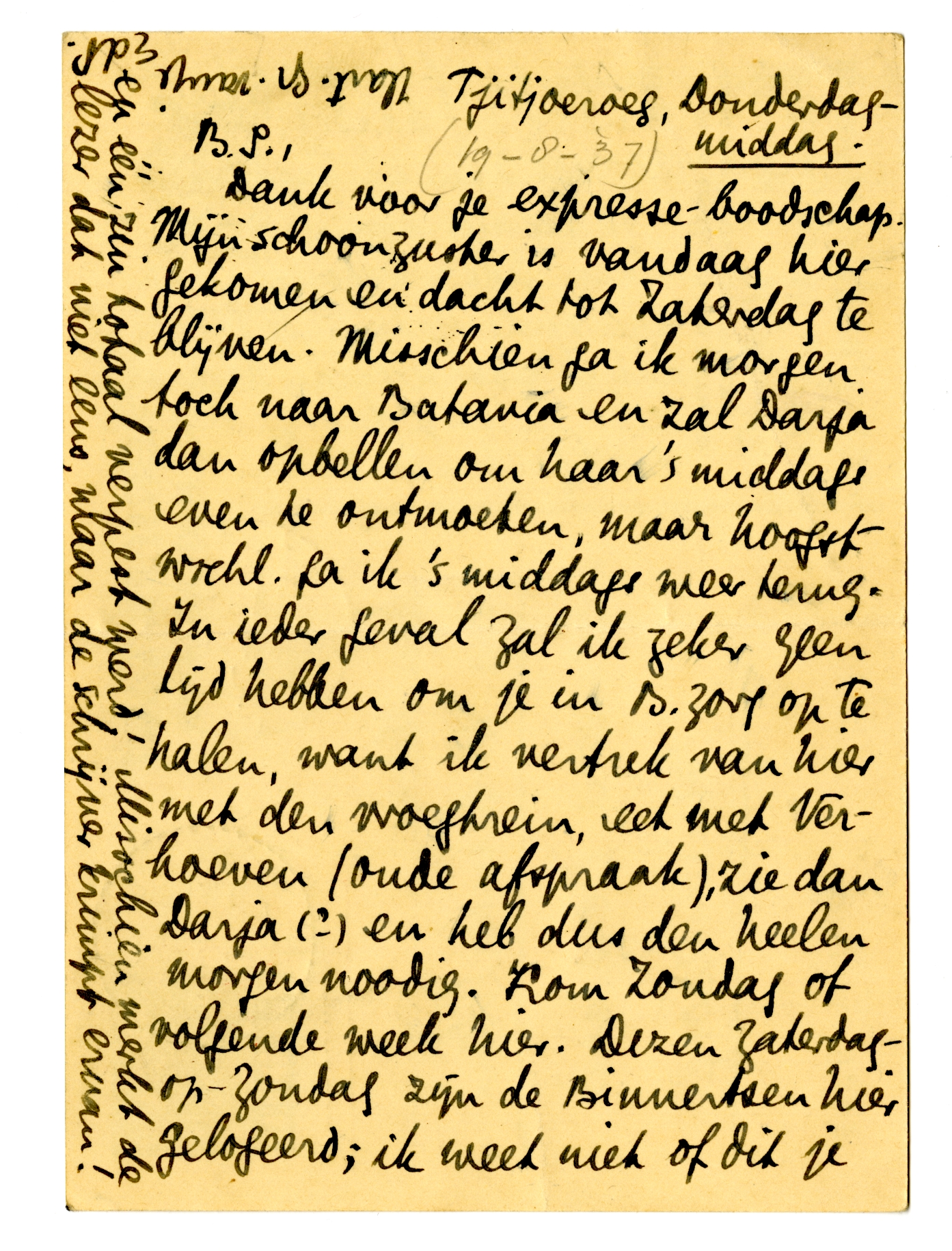 Dank voor je expresse-boodschap. Mijn schoonzuster is vandaag hier gekomen en dacht tot Zaterdag te blijven. Misschien ga ik mor-gen toch naar Batavia en zal Darja4842 dan opbellen om haar 's middags even te ontmoeten, maar hoogstwschl. ga ik 's middags weer terug. In ieder geval zal ik zeker geen tijd hebben om je in B. zorg op te halen, want ik vertrek van hier met den vroegtrein, eet met Verhoeven (oude afspraak), zie dan Darja (?) en heb dus den heelen morgen noodig. Kom Zondag of volgende week hier. Dezen Zaterdag-op-Zondag zijn de Binnertsen hier gelogeerd; ik weet niet of dit je aantrekt of juist niet. Ik vind ze erg aardig, zoowel hem als haar.