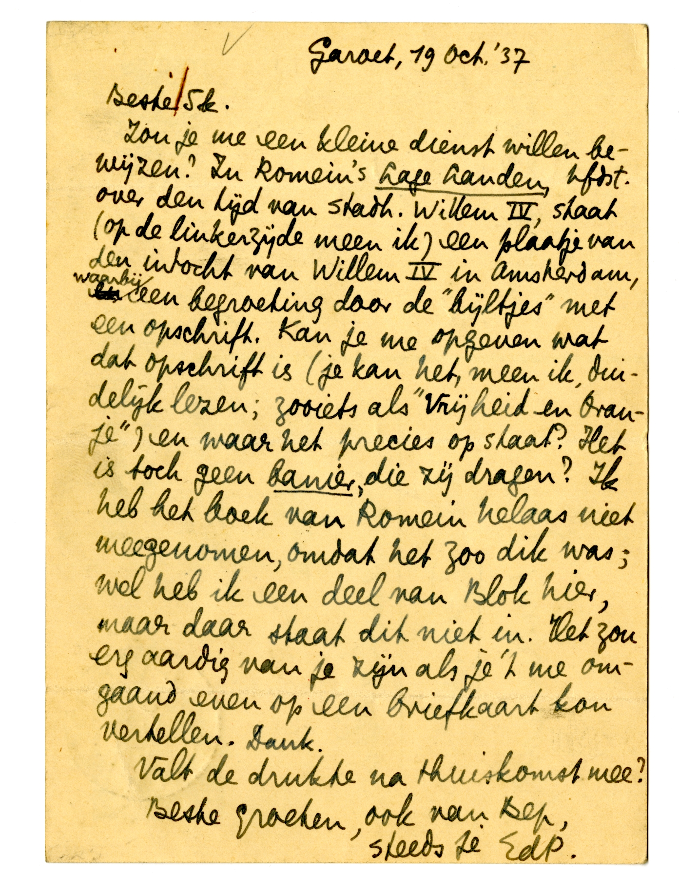 Gelijk hiermee zend ik je G.N. van October. Tegen mijn gewoonte laat ik er dit maal die bloknootjes in staan (die iedereen schrijven kan); het is nl. allergekst, maar deze heele reeks - ± Sept. '36 in Parijs geschreven, vermoed ik - zou met het oog op Mr. Hugo S. te Tjiawi hebben kunnen zijn vastgelegd. Marx, Heden ik morgen gij, etc.
