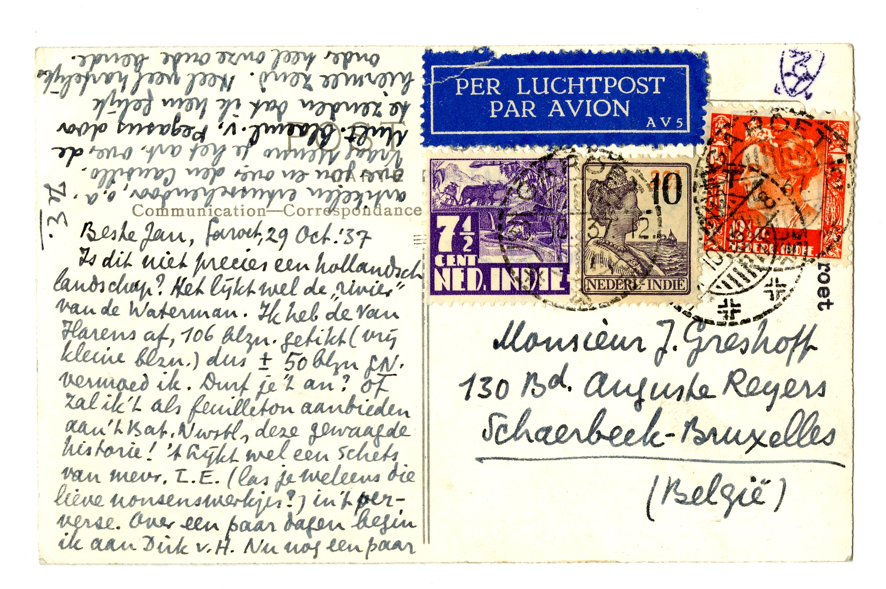 Is dit niet precies een hollandsch landschap? Het lijkt wel de ‘rivier’ van de Waterman. Ik heb de Van Harens af, 106 blzn. getikt (vrij kleine blzn.) dus ± 50 blzn GN. vermoed ik. Durf je 't an? Of zal ik 't als feuilleton aanbieden aan 't Bat. Nwsbl., deze gewaagde historie! 't Lijkt wel een schets van mevr. L.E.4991 (las je weleens die lieve nonsenswerkjes?) in 't perverse. Over een paar dagen begin ik aan Dirk v.H. Nu nog een paar artikelen ertusschendoor, o.a. over jou en over den Caudillo. Vraag Menno je het art. over de Mult. bloeml. v. Pegasus door te zenden dat ik hem gelijk hiermee zend. Heel veel hartelijks onder heel onze oude bende.