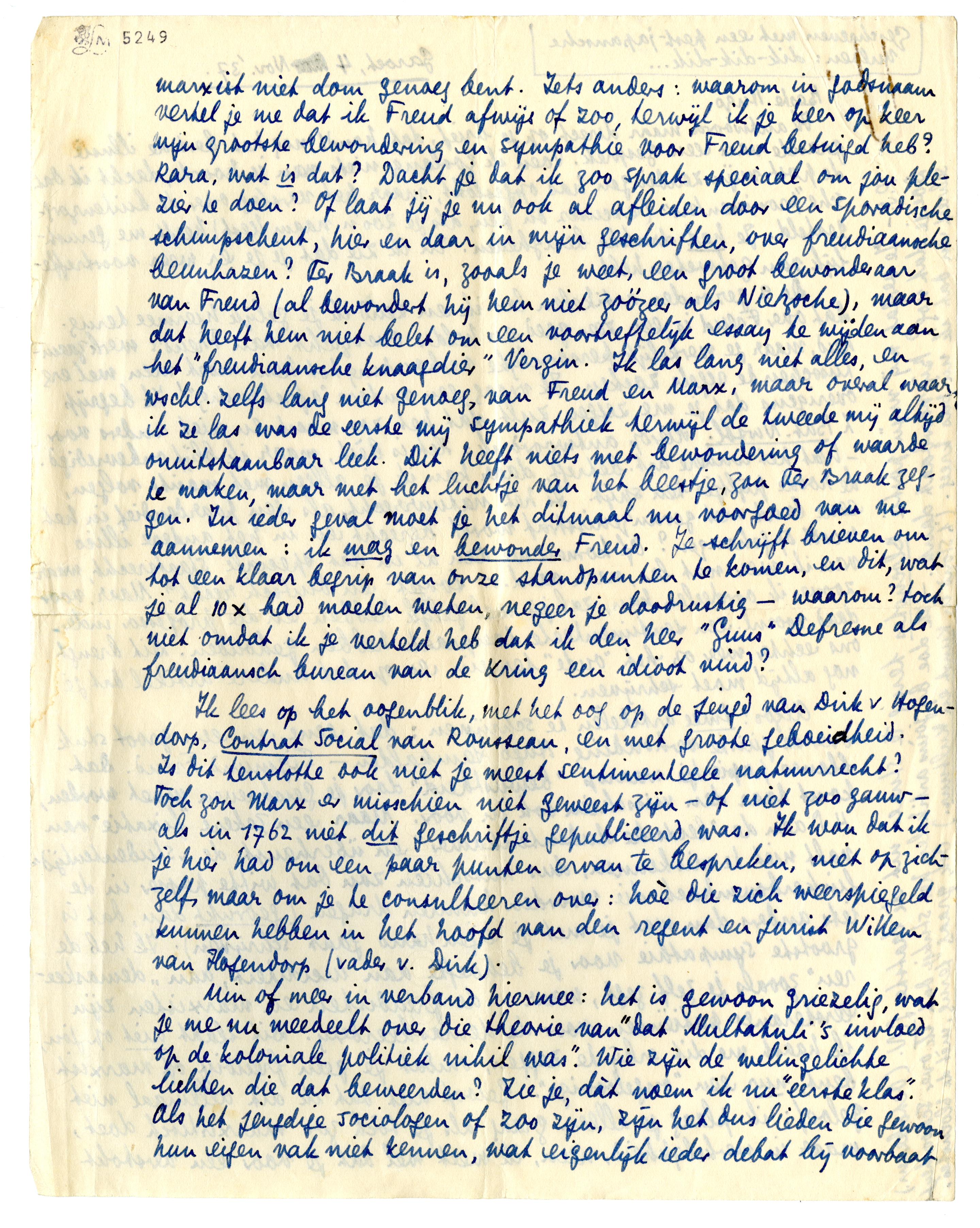 Min of meer in verband hiermee: het is gewoon griezelig, wat je me nu meedeelt over die theorie van ‘dat Multatuli's invloed op de koloniale politiek nihil was’. Wie zijn de welingelichte lichten die dat beweerden? Zie je, dàt noem ik nu ‘eerste klas’. Als het jeugdige sociologen of zoo zijn, zijn het dus lieden die gewoon hun eigen vak niet kennen, wat eigenlijk ieder debat bij voorbaat onnoodig maakt! De eerste ‘ethische’ minister van koloniën, Fransen van de Putte, was doordrenkt van de Havelaar. Evenzoo iemand als C.Th. van Deventer, die zonder den invloed van Multatuli nooit zijn fameuze artikel Een Eereschuld zou hebben geschreven, en die er rond voor uitkwam dat hij er vooral trotsch op zou zijn geweest als men gezegd had dat zijn optreden bijv. de ‘realisatie’ was van Mult.'s ‘idealen’. En hoeveel anderen meer! Dat hier nog over gepraat moet worden is zoo oer-stom. Laten die heeren toch praten over de dingen die ze weten. Dit is precies even stom als om te beweren dat Rousseau's invloed op de fransche revolutie nihil is geweest, of Marx' invloed op de russische. En dergelijke dingen moet je met groote serieusheid eerst vaststellen, en ‘waar maken’ voor je verder kunt debatteeren - als het debat tenminste niet dààrin vastloopt! - en dat godbeter 't, in Indië.*