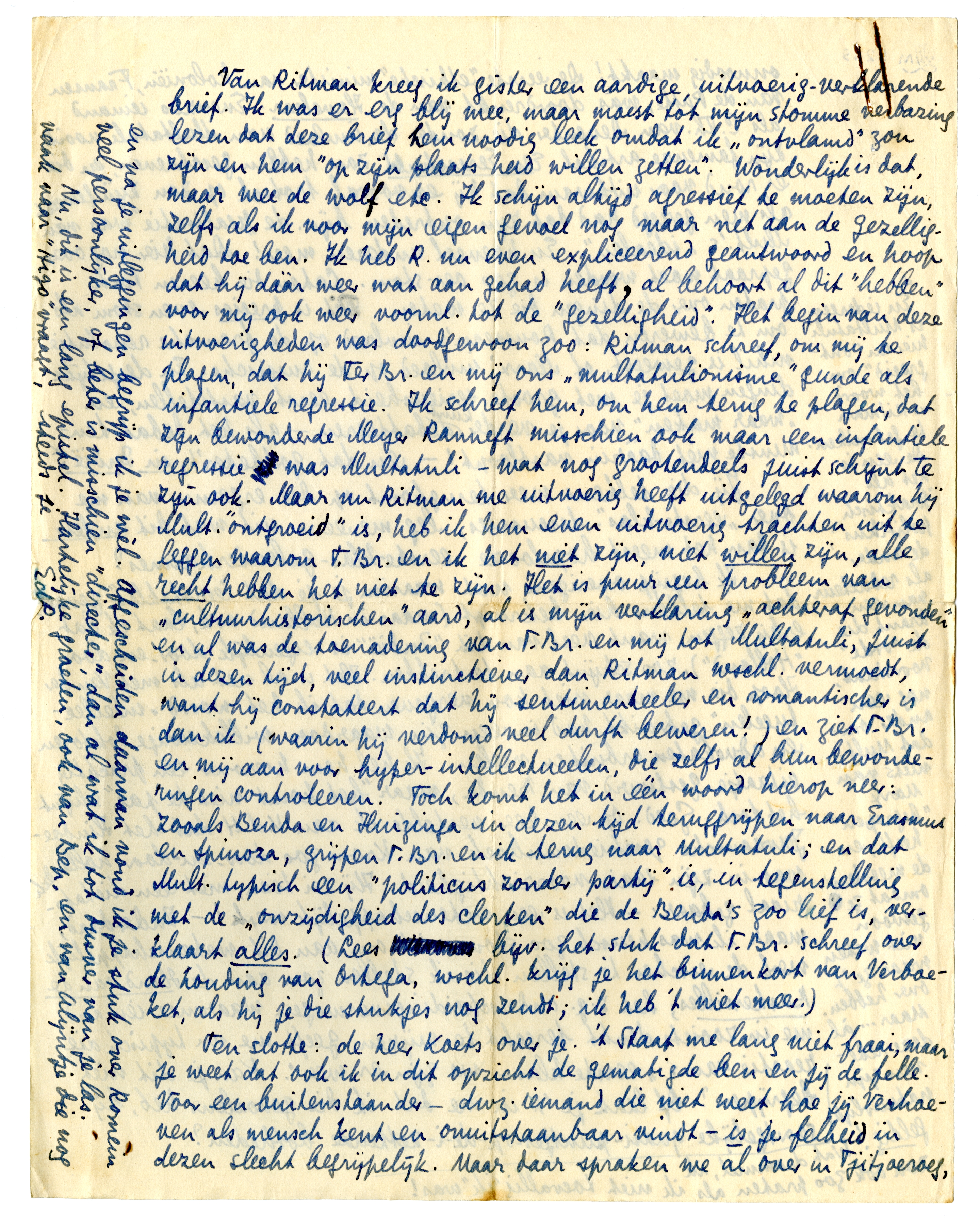 Van Ritman kreeg ik gister een aardige, uitvoerig-verklarende brief. Ik was er erg blij mee, maar moest tot mijn stomme verbazing lezen dat deze brief hem noodig leek omdat ik ‘ontvlamd’ zou zijn en hem ‘op zijn plaats had willen zetten’. Wonderlijk is dat, maar wee de wolf etc. Ik schijn altijd agressief te moeten zijn, zelfs als ik voor mijn eigen gevoel nog maar net aan de gezelligheid toe ben. Ik heb R. nu even expliceerend geantwoord5004 en hoop dat hij dààr weer wat aan gehad heeft, al behoort al dit ‘hebben’ voor mij ook weer voornl. tot de ‘gezelligheid’. Het begin van deze uitvoerigheden was doodgewoon zoo: Ritman schreef, om mij te plagen, dat hij Ter Br. en mij ons ‘multatulionisme’ gunde als infantiele regressie. Ik schreef hem, om hem terug te plagen, dat zijn bewonderde Meyer Ranneft misschien ook maar een infantiele regressie was Multatuli - wat nog grootendeels juist schijnt te zijn ook. Maar nu Ritman me uitvoerig heeft uitgelegd waarom hij Mult. ‘ontgroeid’ is, heb ik hem even uitvoerig trachten uit te leggen waarom T.Br. en ik het niet zijn, niet willen zijn, alle recht hebben het niet te zijn. Het is puur een probleem van ‘cultuurhistorischen’ aard, al is mijn verklaring ‘achteraf gevonden’ en al was de toenadering van T.Br. en mij tot Multatuli, juist in dezen tijd, veel instinctiever dan Ritman wschl. vermoedt, want hij constateert dat hij sentimenteeler en romantischer is dan ik (waarin hij verdomd veel durft beweren!) en ziet T.Br. en mij aan voor hyper-intellectueelen, die zelfs al hun bewonderingen controleeren. Toch komt het in één woord hierop neer: zooals Benda en Huizinga in dezen tijd teruggrijpen naar Erasmus en Spinoza, grijpen T.Br. en ik terug naar Multatuli; en dat Mult. typisch een ‘politicus zonder partij’ is, in tegenstelling met de ‘onzijdigheid des clerken’ die de Benda's zoo lief is, verklaart alles. (Lees bijv. het stuk dat T.Br. schreef over de houding van Ortega,5005 wschl. krijg je het binnenkort van Verboeket, als hij je die stukjes nog zendt; ik heb 't niet meer).