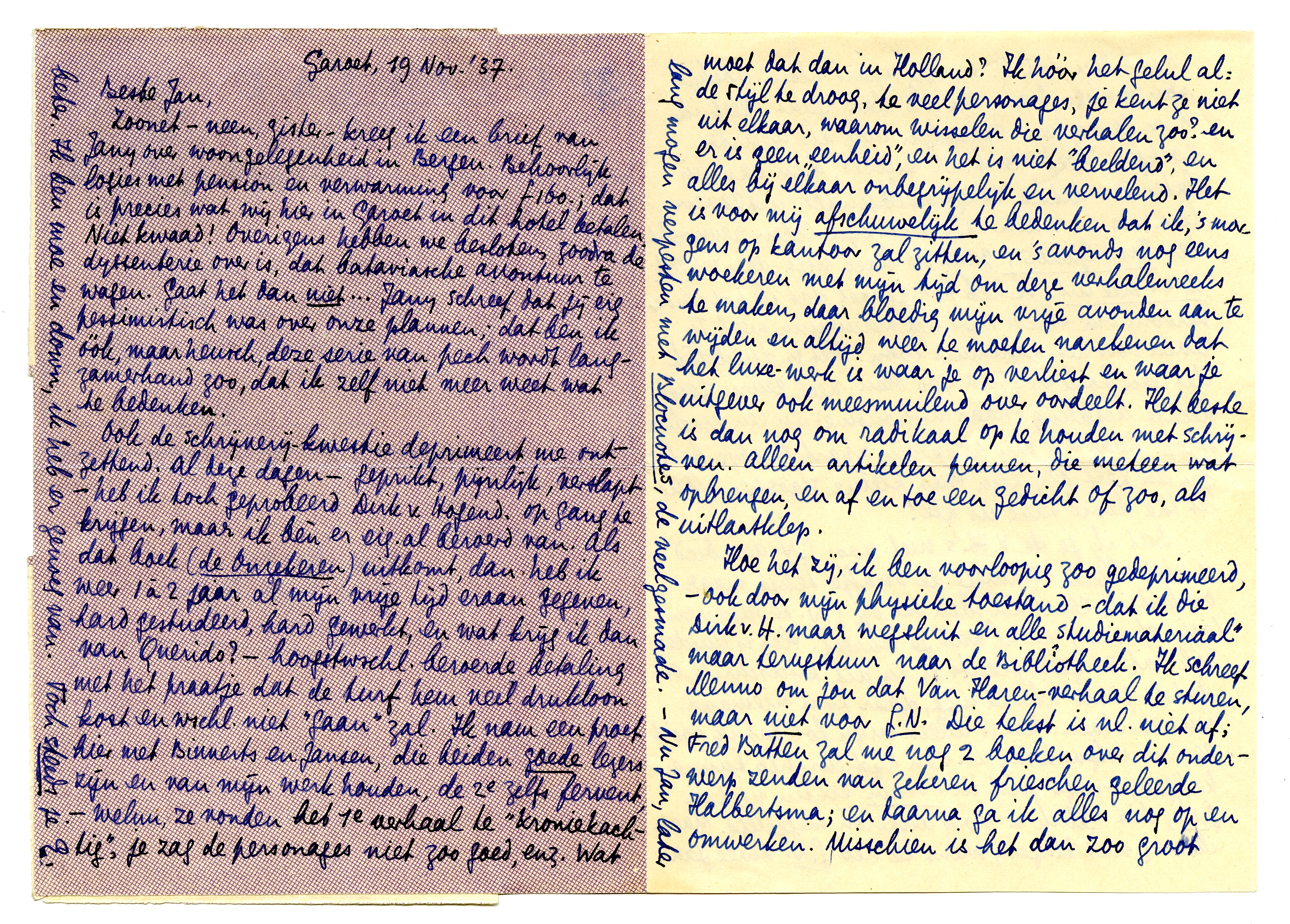 Ook de schrijverij-kwestie deprimeert me ontzettend. Al deze dagen - geprikt, pijnlijk, verslapt - heb ik toch geprobeerd Dirk v. Hogend. op gang te krijgen, maar ik bèn er eig. al beroerd van. Als dat boek (de Onzekeren) uitkomt, dan heb ik weer 1 à 2 jaar al mijn vrije tijd eraan gegeven, hard gestudeerd, hard gewerkt, en wat krijg ik dan van Querido? - hoogstwschl. beroerde betaling met het praatje dat de turf hem veel drukloon kost en wschl. niet ‘gaan’ zal. Ik nam een proef hier met Binnerts en Jansen, die beiden goede lezers zijn en van mijn werk houden, de 2e zelfs fervent, - welnu, ze vonden het 1e verhaal te ‘kroniekachtig’, je zag de personages niet zoo goed, enz. Wat moet dat dan in Holland? Ik hóór het gelul al: de stijl te droog, te veel personages, je kent ze niet uit elkaar, waarom wisselen die verhalen zoo? en er is geen ‘eenheid’, en het is niet ‘beeldend’, en alles bij elkaar onbegrijpelijk en vervelend. Het is voor mij afschuwelijk te bedenken dat ik, 's morgens op kantoor zal zitten, en 's avonds nog eens woekeren met mijn tijd om deze verhalenreeks te maken, daar bloedig mijn vrije avonden aan te wijden en altijd weer te moeten narekenen dat het luxe-werk is waar je op verliest en waar je uitgever ook meesmuilend over oordeelt. Het beste is dan nog om radikaal op te houden met schrijven. Alleen artikelen pennen, die meteen wat opbrengen, en af en toe een gedicht of zoo, als uitlaatklep.