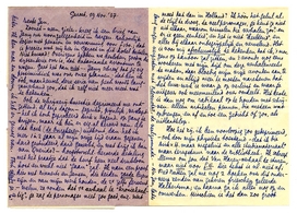Hoe het zij, ik ben voorloopig zoo gedeprimeerd, - ook door mijn physieke toestand - dat ik die Dirk v.H. maar wegsluit en alle ‘studiemateriaal’ maar terugstuur naar de Bibliotheek. Ik schreef Menno5042 om jou dat Van Haren-verhaal te sturen, maar niet voor G.N. Die tekst is nl. niet af; Fred Batten zal me nog 2 boeken over dit onderwerp zenden van zekeren frieschen geleerde Halbertsma; en daarna ga ik alles nog op en omwerken. Misschien is het dan zoo groot geworden dat Q. er een apart klein boekje van maken kan, en als dat ‘gaat’ geef ik hem de andere episoden ook als aparte boekjes. Hééft de boel succes, dan kan hij later een dikke verzamelbundel uitgeven, desnoods in 2 dln. als met zijn eigen gewrocht der Santiljano's5043; gaat de boel niet, dan scheid ik er mee uit. Ik heb het gevoel dat ik het verder verdom om steeds weer het maximum werk te geven voor het minimum loon. Het is duidelijk dat een boek v. 350 à 400 blzn. veel geürm geeft, slechte betaling (naar verhouding) en een grootere strop. Laat hij mij per klein apart boekje betalen en zelf blij zijn met kleine stroppen. And let the devil take us all!