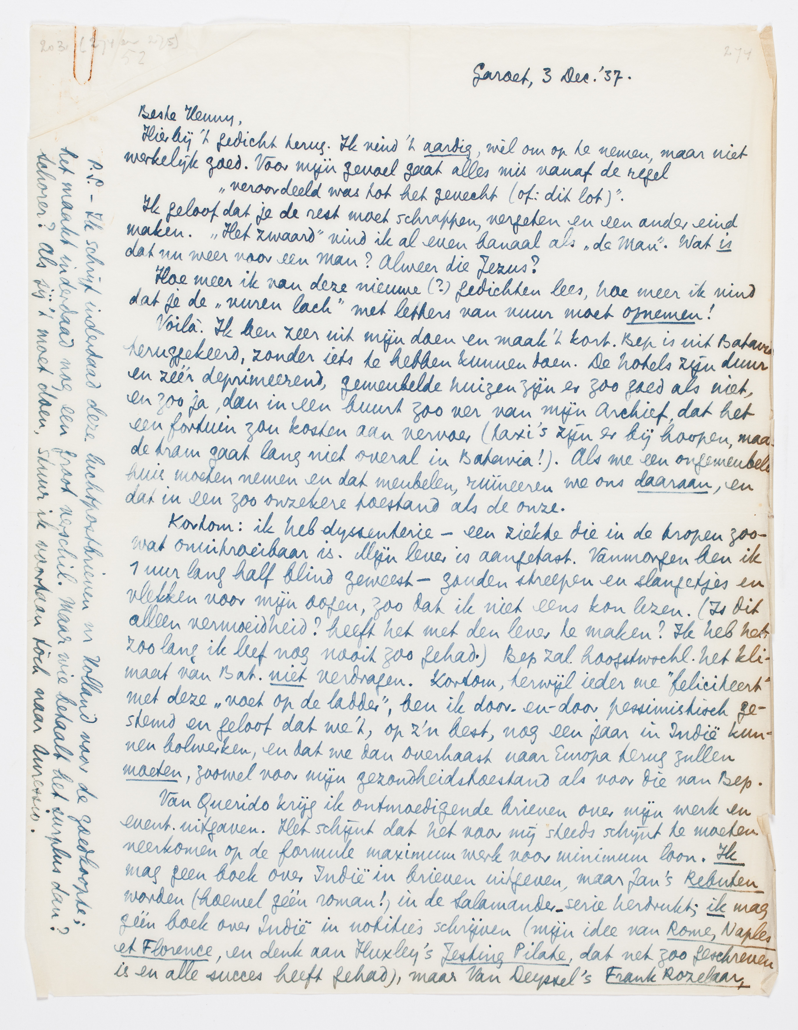 P.S. - Ik schrijf inderdaad deze luchtpostbrieven nr Holland voor de goedkoopte; het maakt inderdaad nog een groot verschil. Maar wie bepaalt het surplus dan? Schorer?5104 Als jij 't moet doen, stuur ik voortaan tòch naar Auressio.