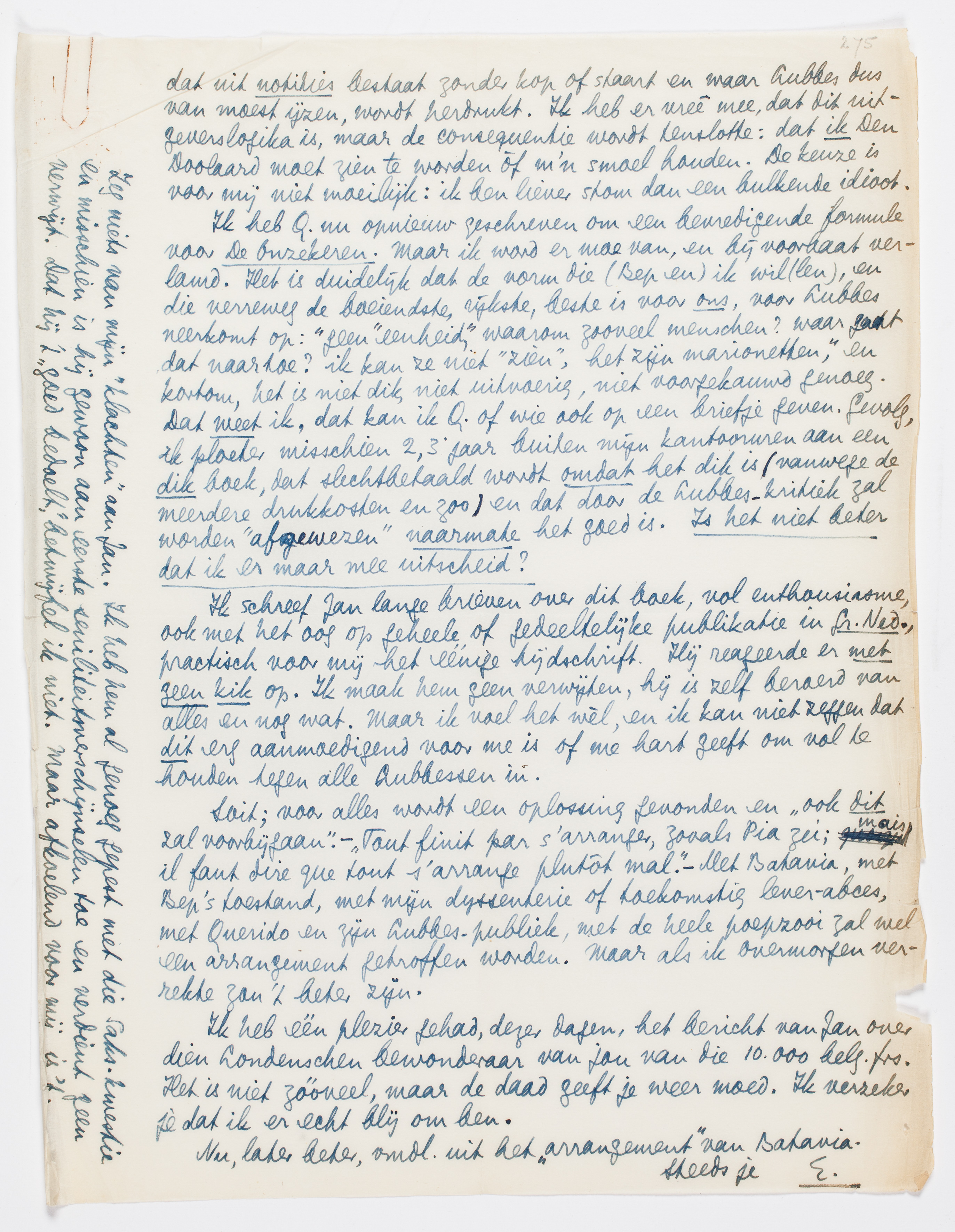 Ik heb Q. nu opnieuw geschreven5103 om een bevredigende formule voor De Onzekeren. Maar ik word er moe van, en bij voorbaat verlamd. Het is duidelijk dat de vorm die (Bep en) ik wil(len), en die verreweg de boeiendste, rijkste, beste is voor ons, voor Lubbes neerkomt op: ‘geen “eenheid”, waarom zooveel menschen? waar gaat dat naar toe? ik kan ze niet “zien”, het zijn marionetten’, en kortom, het is niet dik, niet uitvoerig, niet voorgekauwd genoeg. Dat weet ik, dat kan ik Q. of wie ook op een briefje geven. Gevolg, ik ploeter misschien 2, 3 jaar buiten mijn kantooruren aan een dik boek, dat slechtbetaald wordt omdat het dik is (vanwege de meerdere drukkosten en zoo) en dat door de Lubbes-kritiek zal worden ‘afgewezen’ naarmate het goed is. Is het niet beter dat ik er maar mee uitscheid?